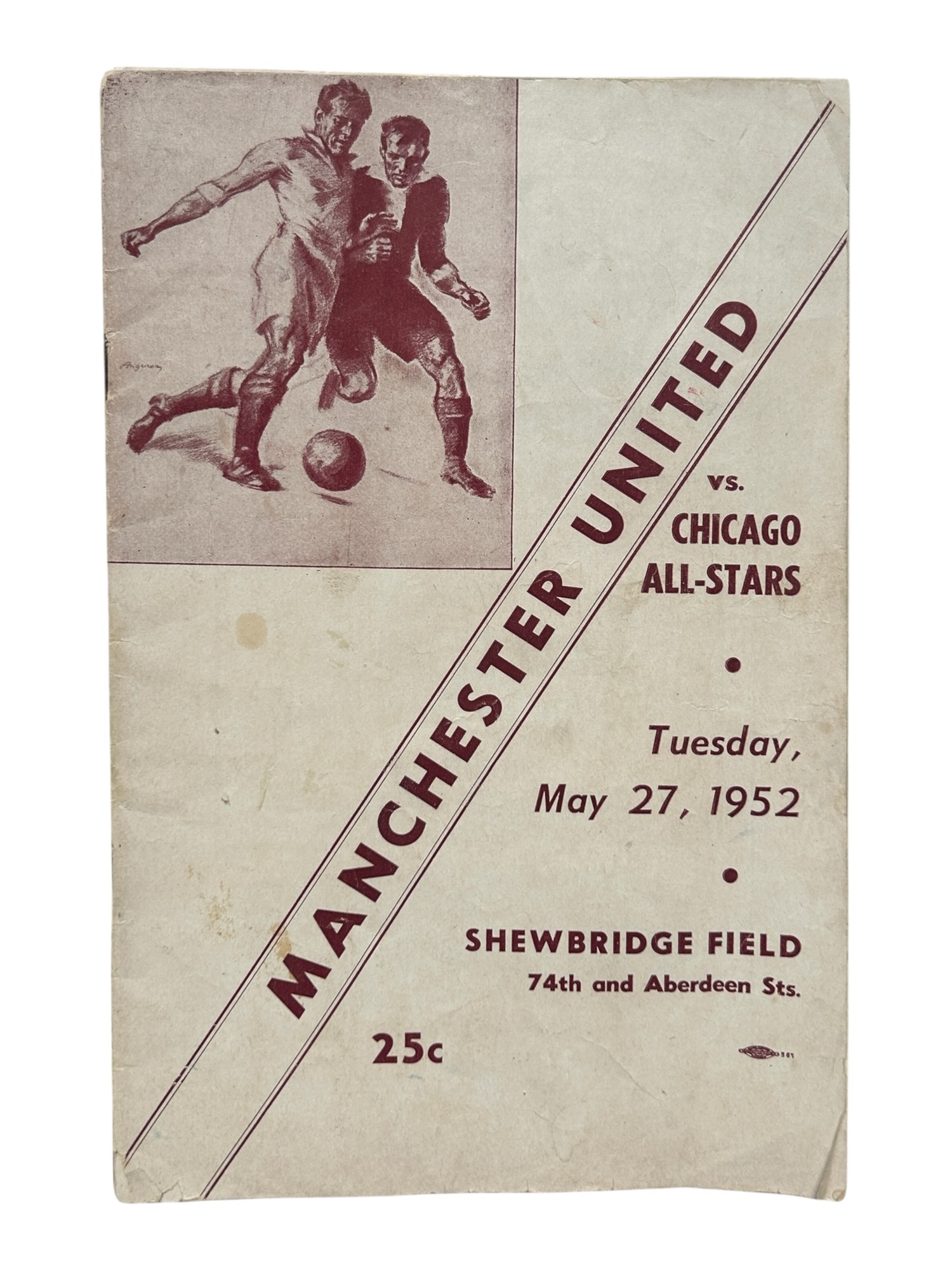 MANCHESTER UNITED AWAY VERSUS CHICAGO ALL-STARS 1952 FOOTBALL PROGRAMME, 27/5/2952, FRIENDLY ISSUE. PENCIL CHANGES, SOME AGEING TO SPINE, EDGE WEAR, HANDLING MARKS.