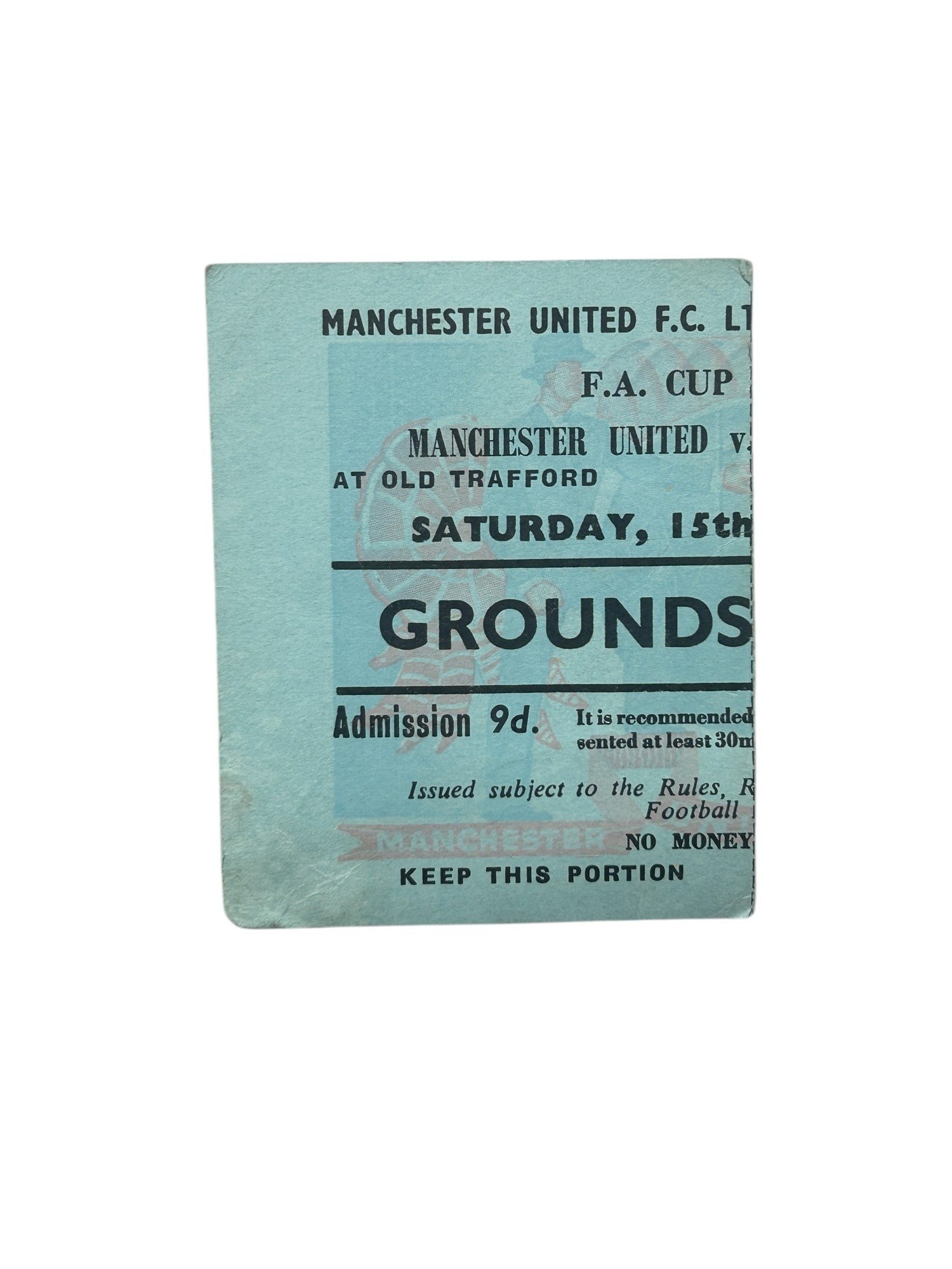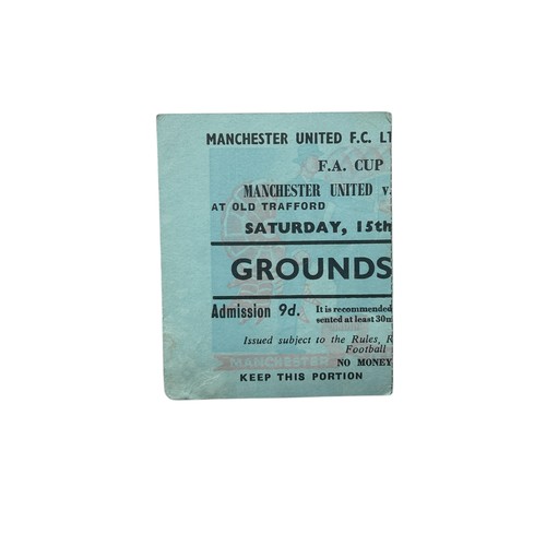 MANCHESTER UNITED VERSUS SHEFFIELD WEDNESDAY 1957/58 FOOTBALL TICKET STUB, FIRST GAME AFTER THE MUNICH DISASTER, DATED 15/2/1958 BUT DELAYED TO THE 19th DUE TO DISASTER.
