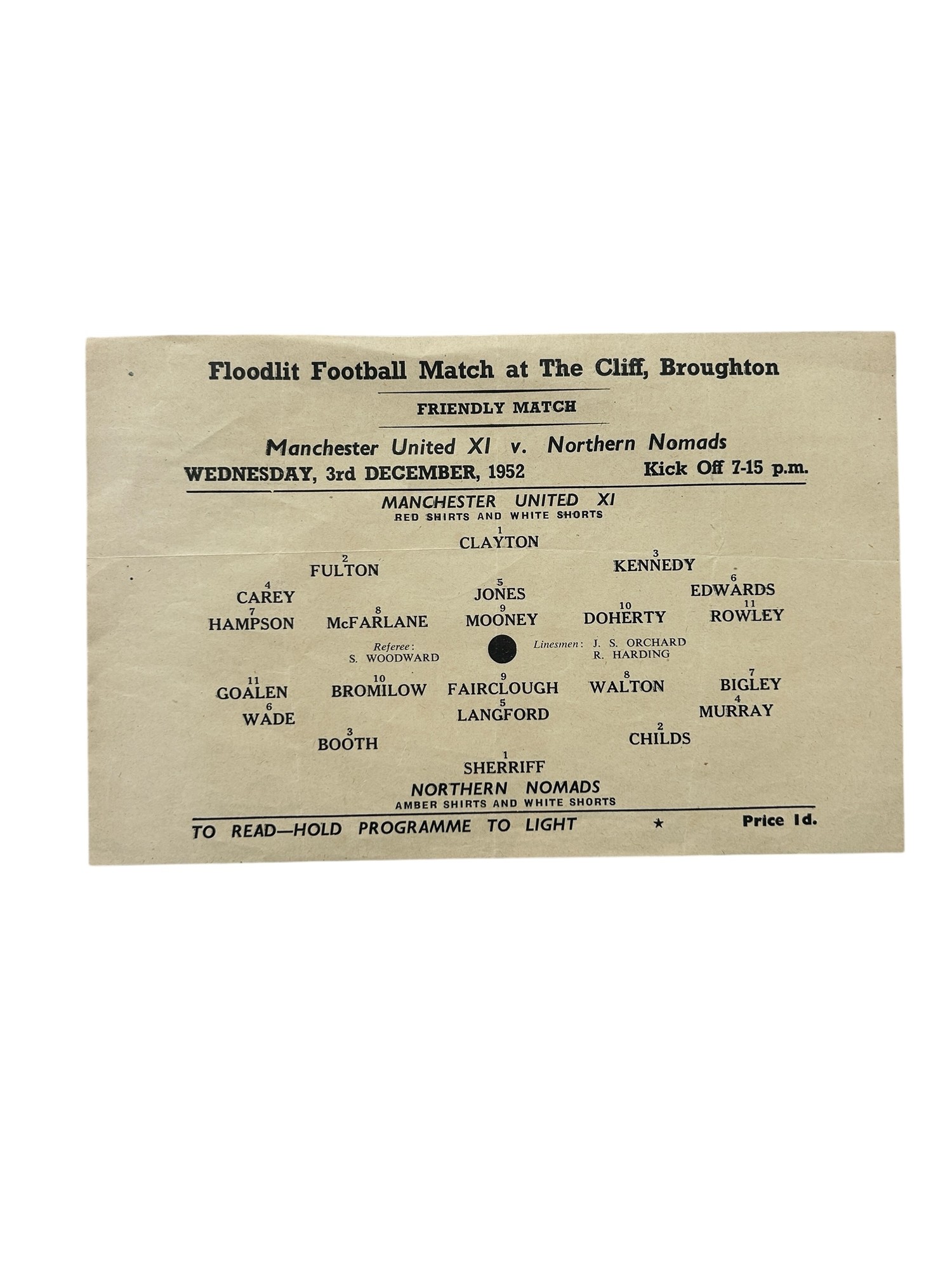 MANCHESTER UNITED XI VERSUS THE NORTHERN NOMADS 1952/53 SINGLE SHEET FOOTBALL PROGRAMME, SCARCE FIXTURE PLAYED AT THE CLIFF, 3/12/1952, XI INCLUDED MARK JONES/ JACK ROWLEY/ A YOUNG DUNCAN EDWARDS. EXCELLENT.