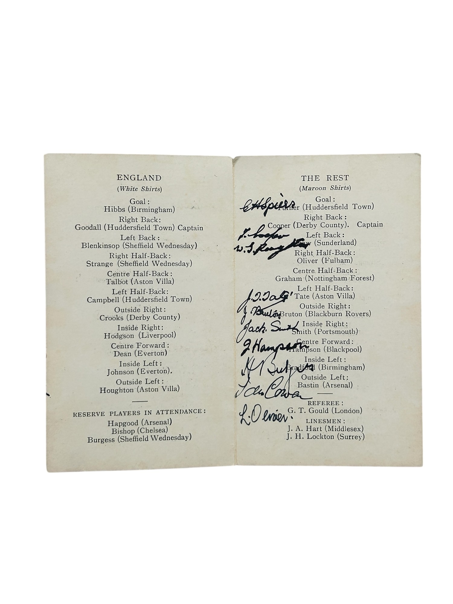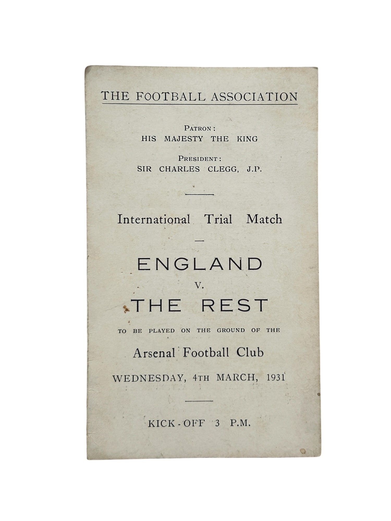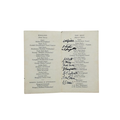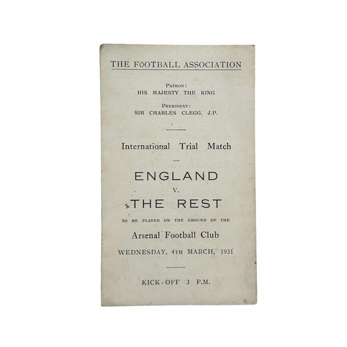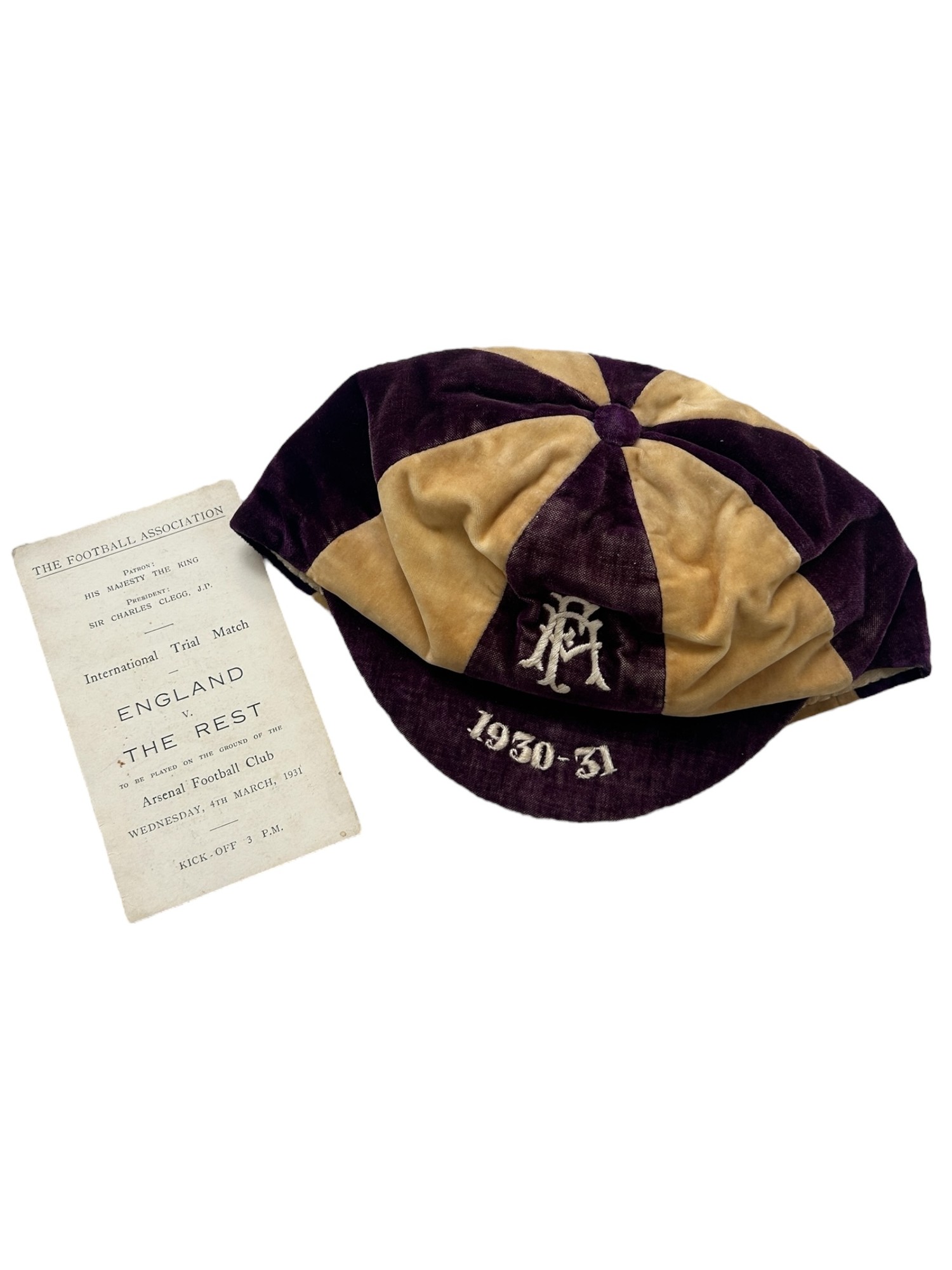 1930-31 CLIFF BASTIN ENGLAND V THE REST INTERNATIONAL TRIAL CAP, AWARDED TO ARSENAL'S CLIFF BASTIN FOR THE MATCH PLAYED AT HIGHBURY 4/3/1931, PLUS FOUR PAGE ITINERARY CARD SIGNED BY 10 MEMBERS OF 'THE REST'.