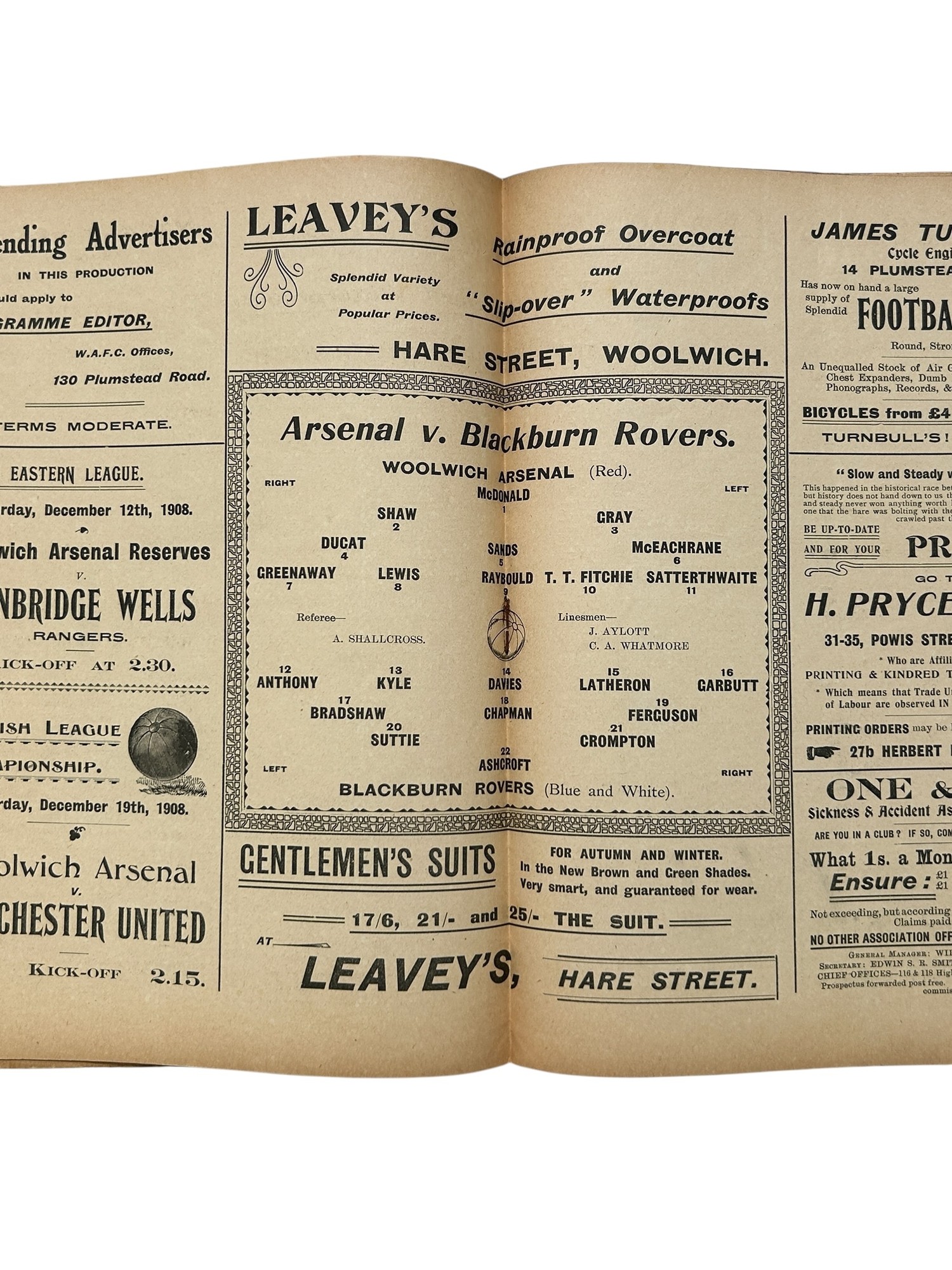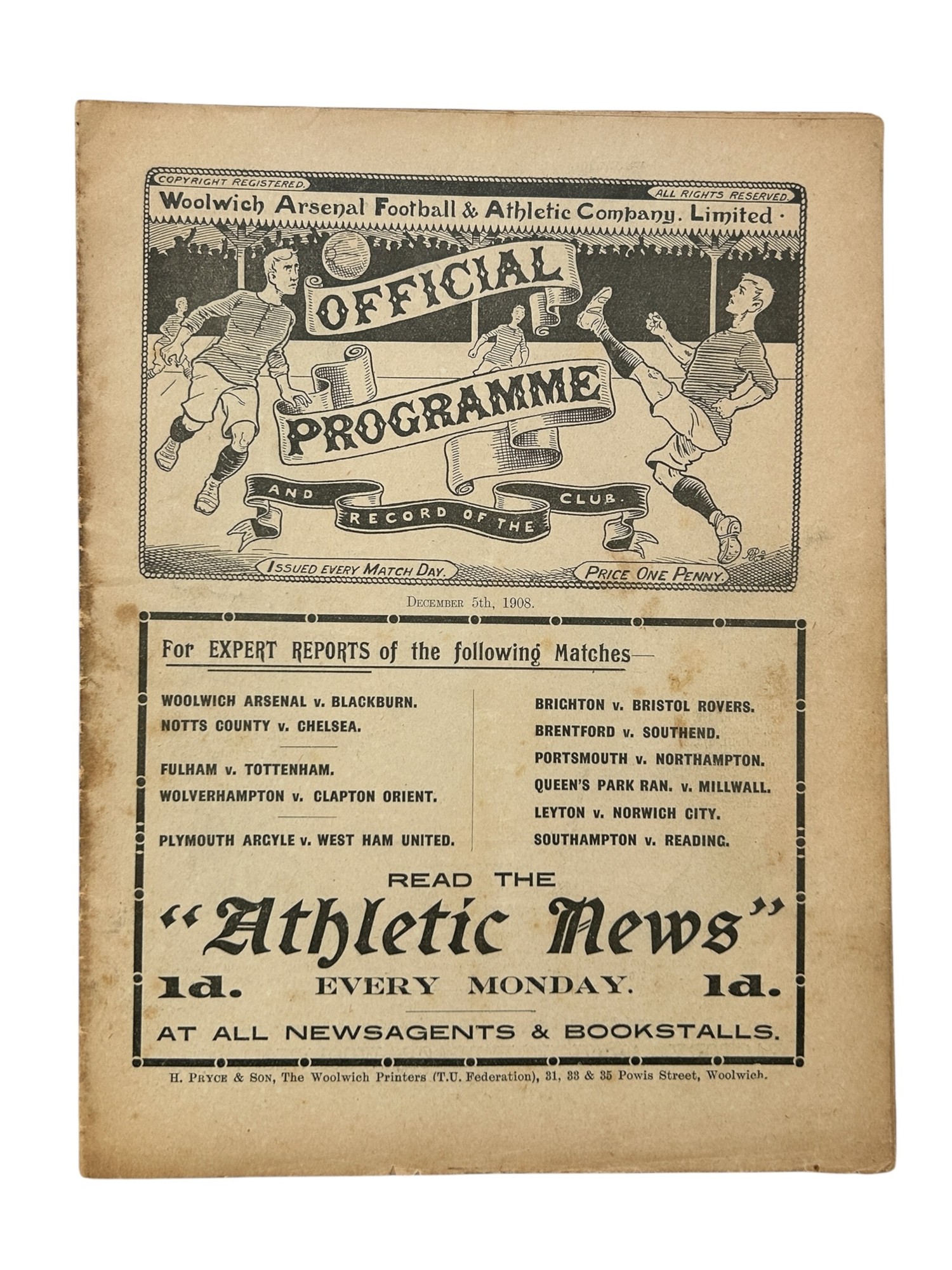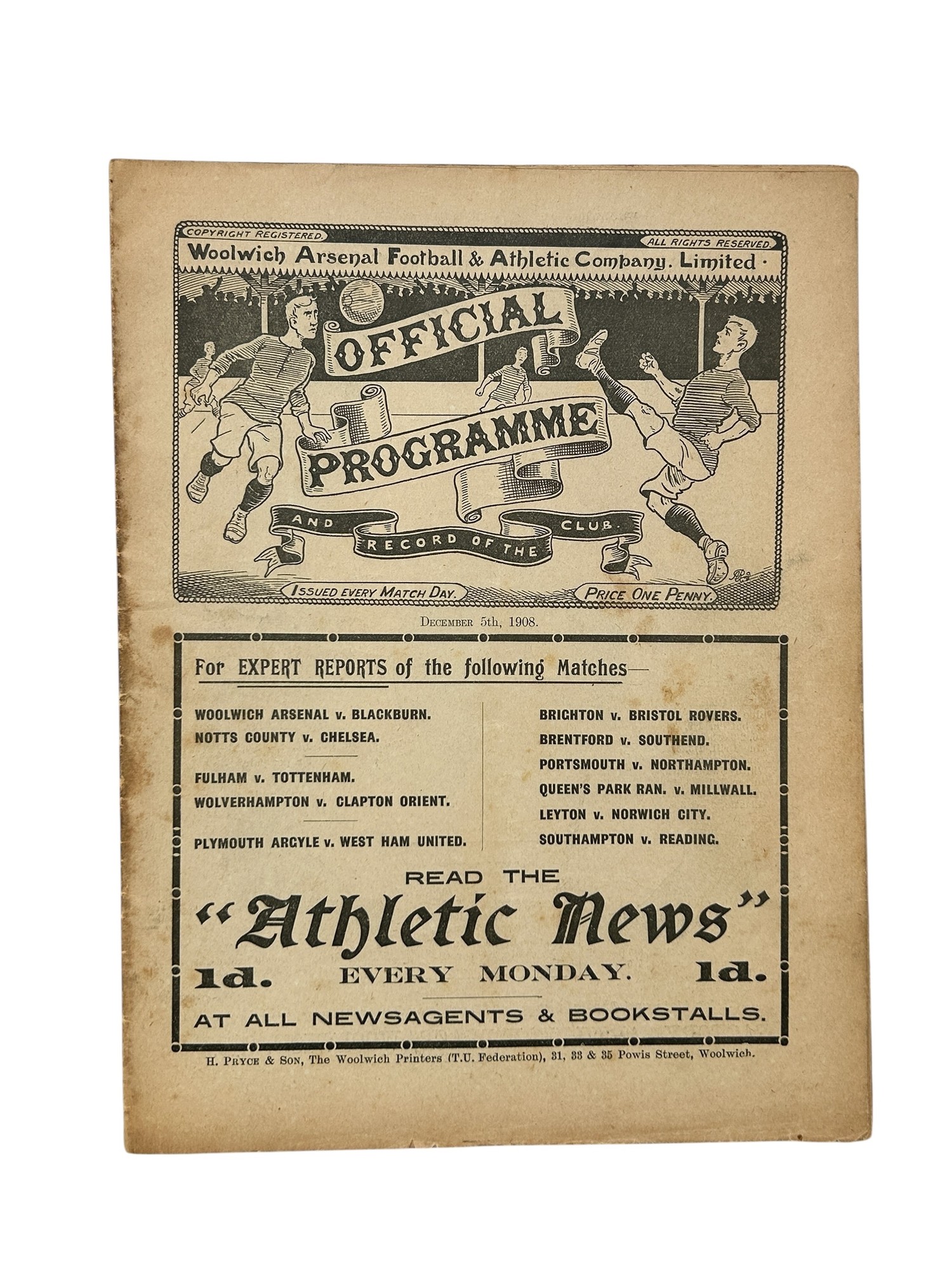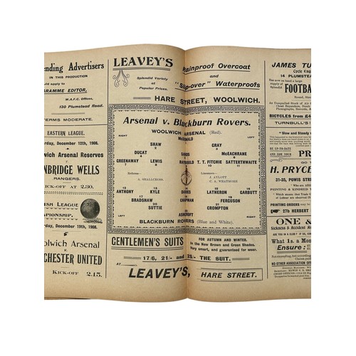 WOOLWICH ARSENAL VERSUS BLACKBURN ROVERS 1908/09 FOOTBALL PROGRAMME, 5/12/1908, EXTREMELY SCARCE. FOXING NOTED- SEE PHOTO