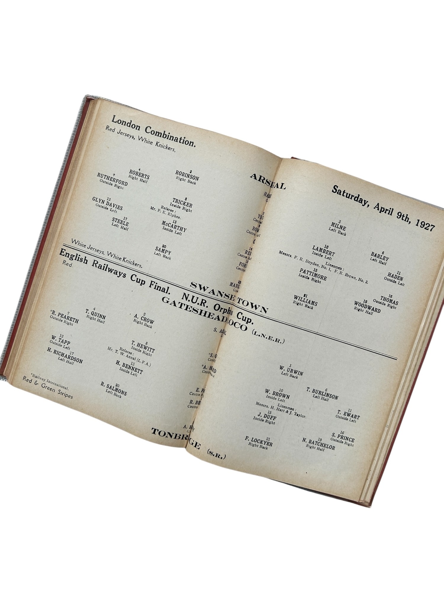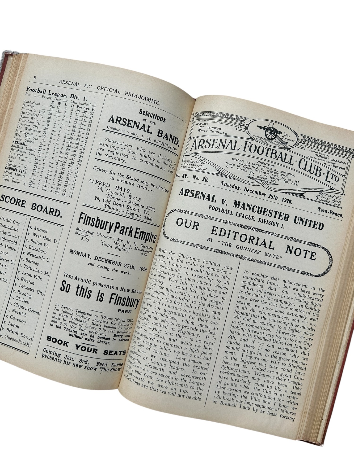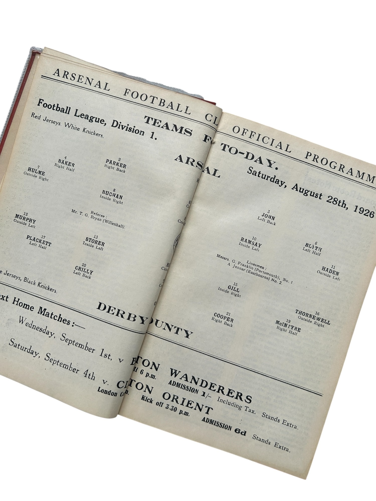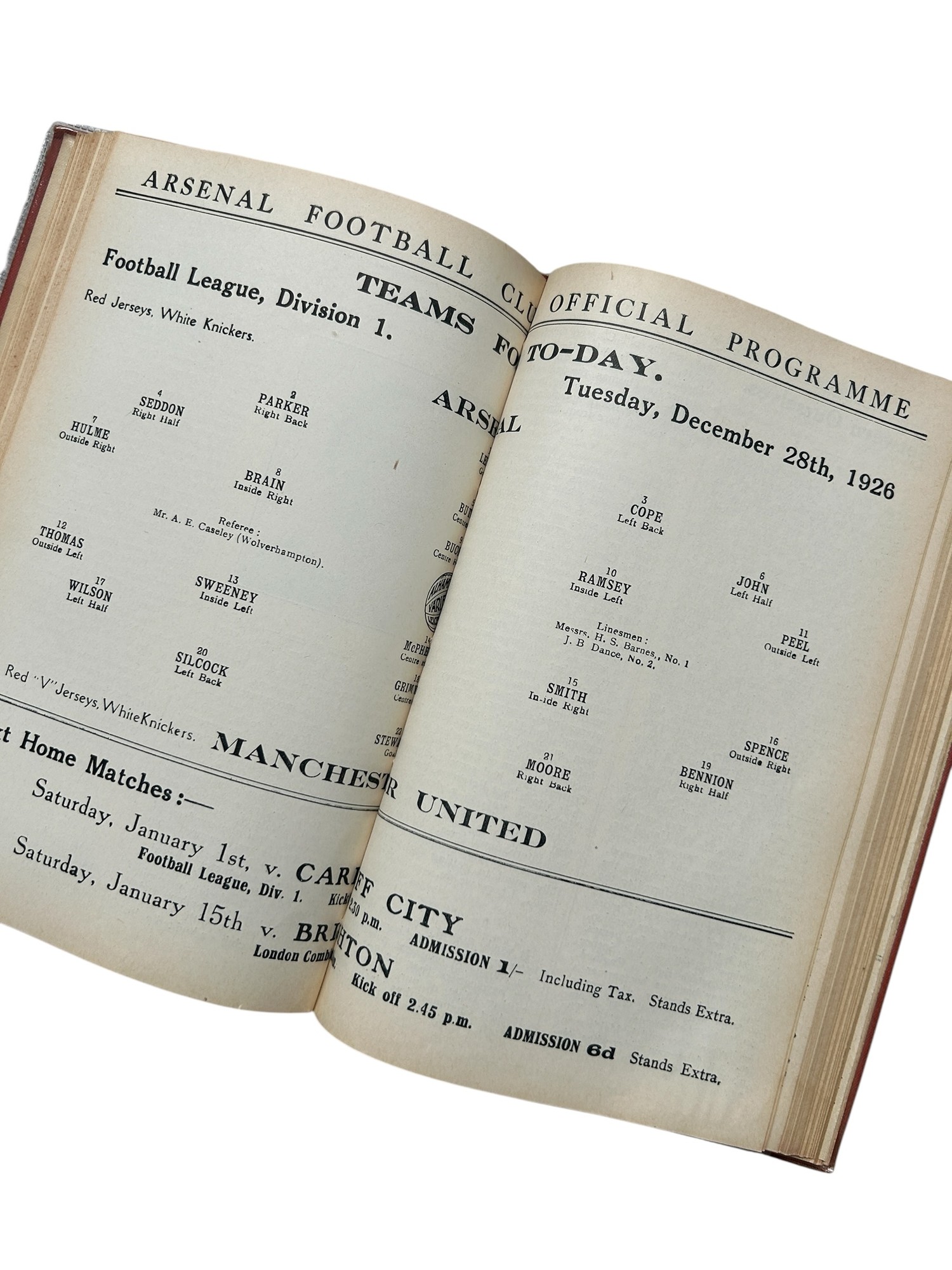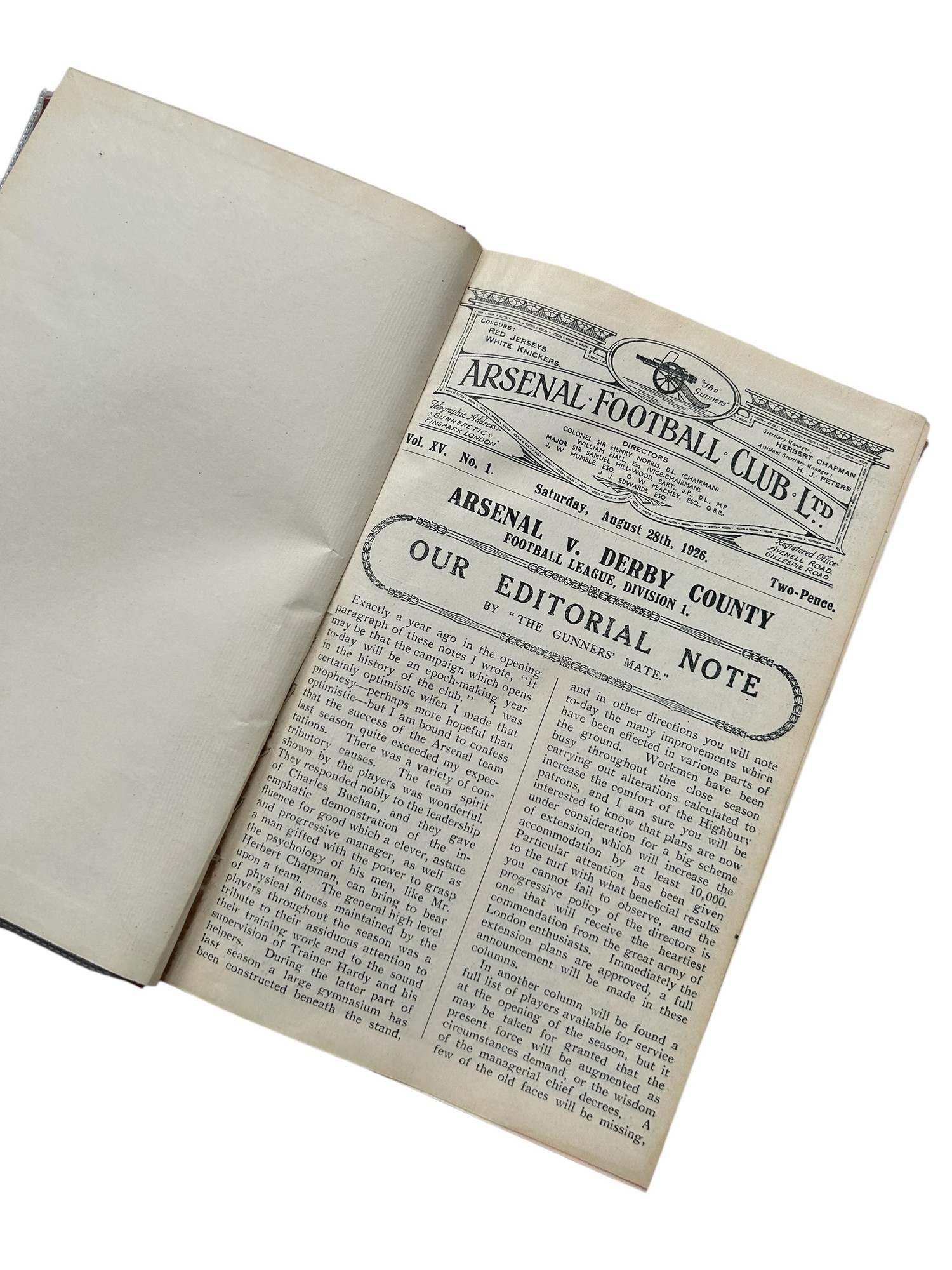 ARSENAL 1926/27 CLUB BOUND VOLUME OF MATCH PROGRAMMES, OPPONENTS INCLUDE DERBY COUNTY, BOLTON WANDERERS, CLAPTON ORIENT (LONDON COMBINATION), LEICESTERE CITY, LIVERPOOL, MILLWALL (LONDON COMBINATION), NEWCASTLE UNITED, LUTON TOWN (LONDON COMBINATION), WEST HAM UNITED, SHEFFIELD WEDNESDAY, TOTTENHAM HOTSPUR (LONDON COMBINATION), BLACKBURN ROVERS, FULHAM (LONDON COMBINATION), SUNDERLAND, QUEENS PARK RANGERS (LONDON COMBINATION), BURY, CHARLTON ATHLETIC (LONDON COMBINATION), TOTTENHAM HOTSPUR, CARDIFF CITY (LONDON COMBINATION), MANCHESTER UNITED, CARDIFF CITY, BRIGHTON (LONDON COMBINATION), SHEFFIELD UNITED, SOUTHAMPTON (LONDON COMBINATION), PORT VALE (FAC 4TH ROUND REPLAY), PORTSMOUTH (LONDON COMBINATION), LEEDS UNITED, LIVERPOOL (FAC 5TH ROUND), BURNLEY, WOLVERHAMPTON WANDERERS (FAC 6TH ROUND), CRYSTAL PALACE (LONDON COMBINATION), EVERTON, LEICESTER CITY (LONDON COMBINATION), HUDDERSFIELD, SWANSEA TOWN (LONDON COMBINATION), ENGLISH RAILWAYS CUP FINAL GATESHEAD LOCO VERSUS TONBRIDGE, ASTON VILLA, WEST BROMWICH ALBION, COVENTRY CITY (LONDON COMBINATION), ENGLISH RAILWAYS CUP FINAL REPLAY GATESHEAD LOCO VERSUS TONBRIDGE, BIRMINGHAM CITY, BRENTFORD (LONDON COMBINATION).