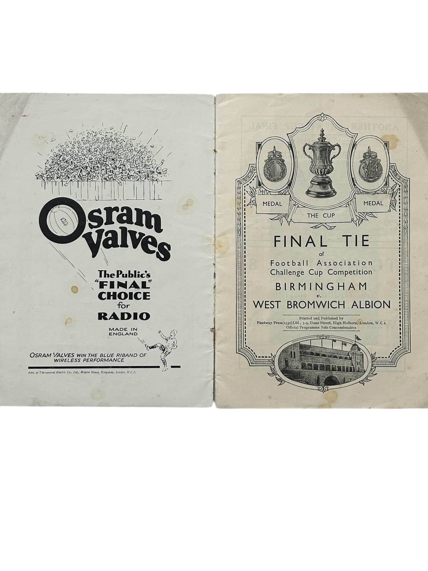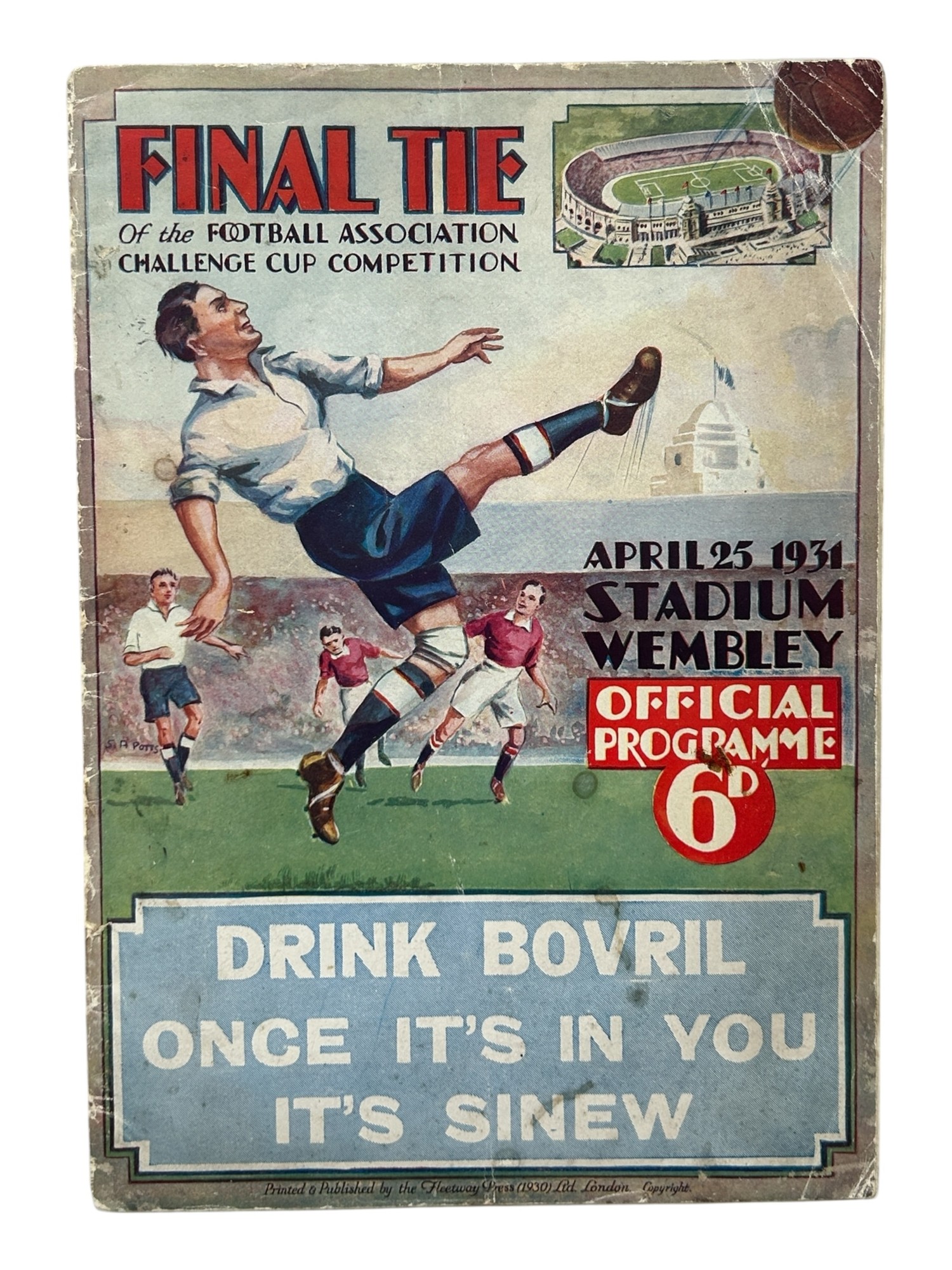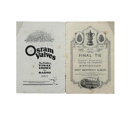 1931 FA CUP FINAL FOOTBALL PROGRAMME, BIRMINGHAM VERSUS WEST BROMWICH ALBION, 25/4/1931. CREASES, STAPLES REMOVED, SOME SPINE WEAR.