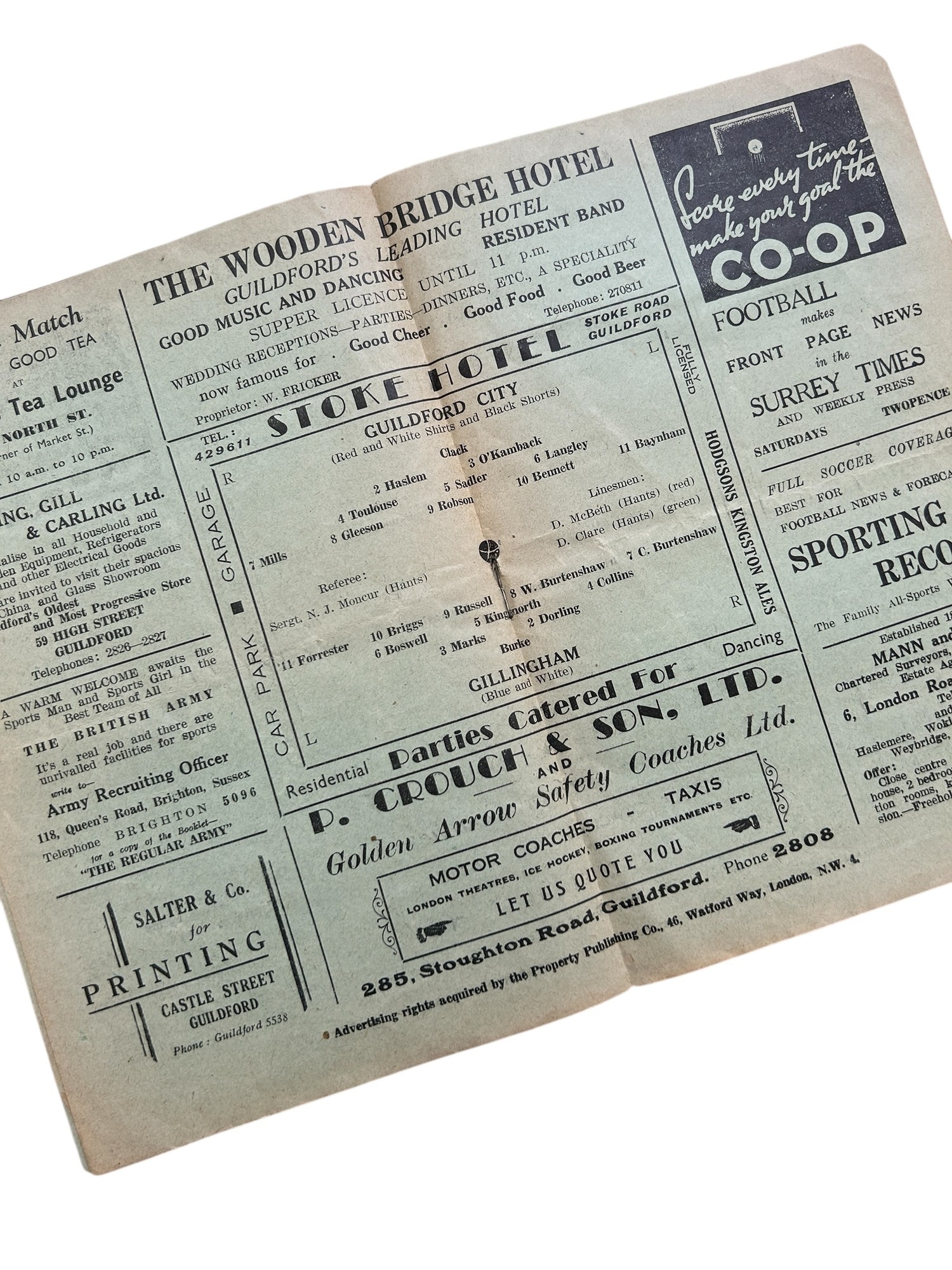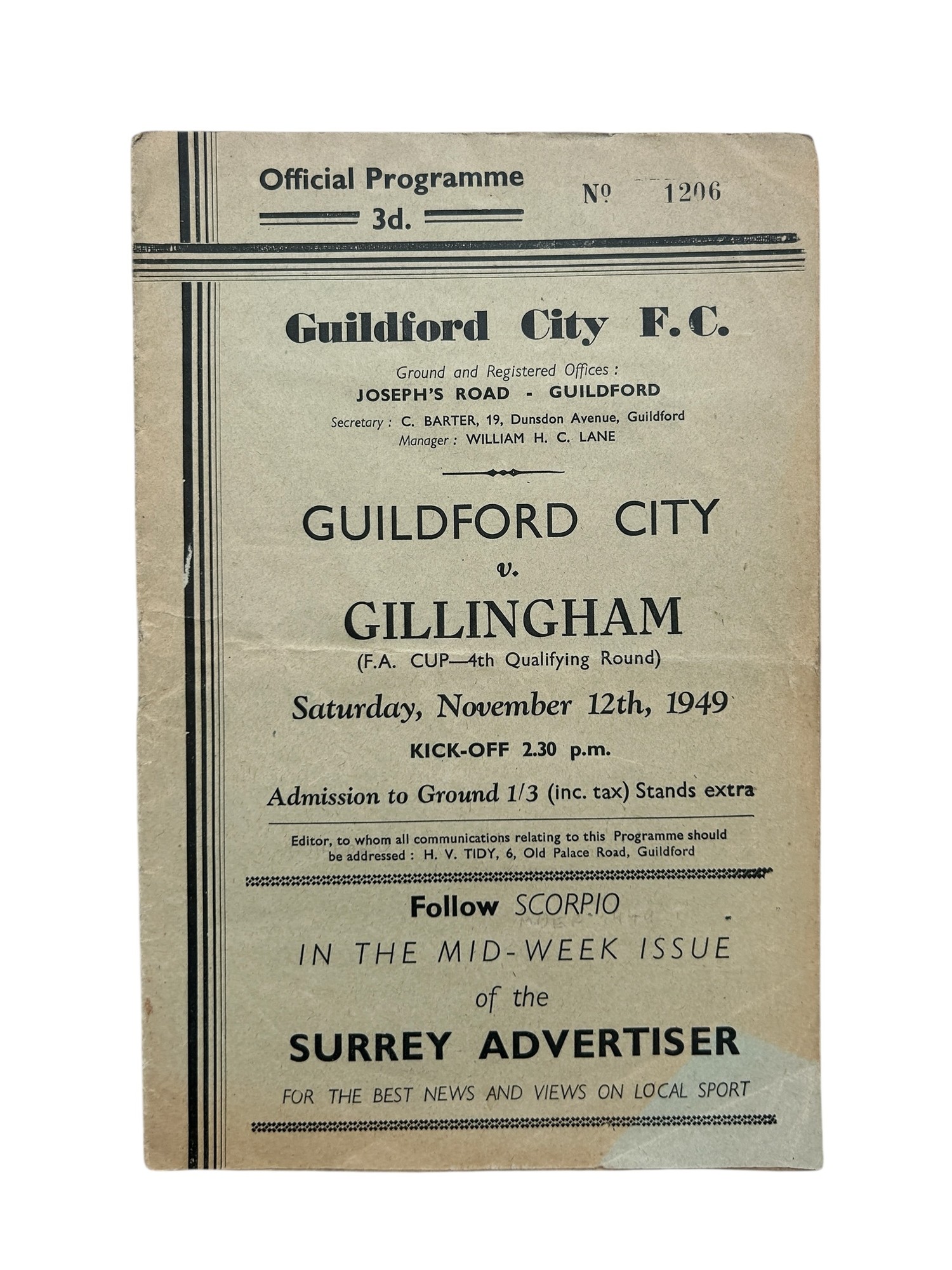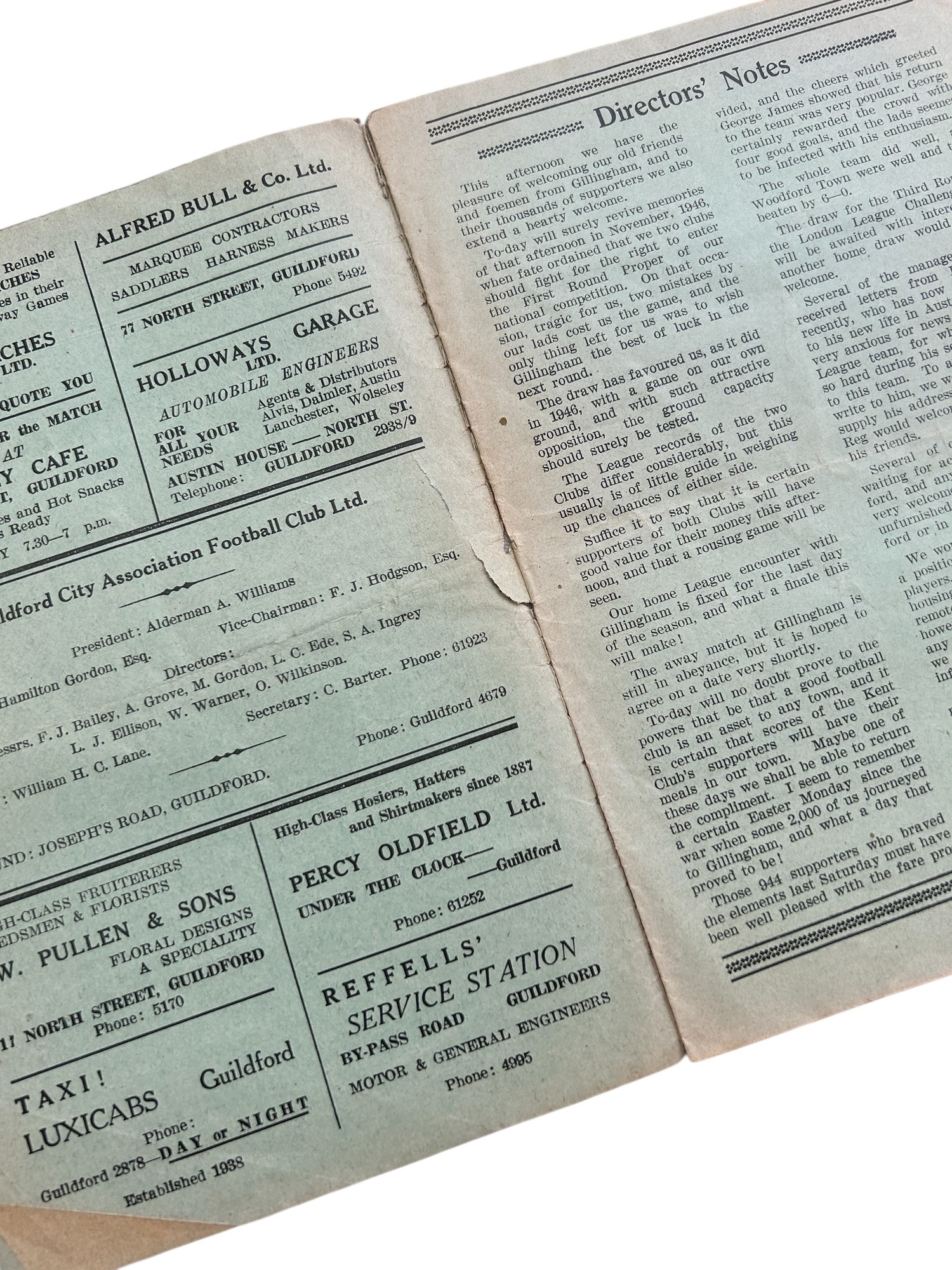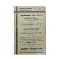 GUILDFORD CITY VERSUS GILLINGHAM 1949/50 FOOTBALL PROGRAMME, 12/11/1949, FA CUP QUALIFIER. TEAR TO FRONT PAGE, CREASING, MARKS NOTED.