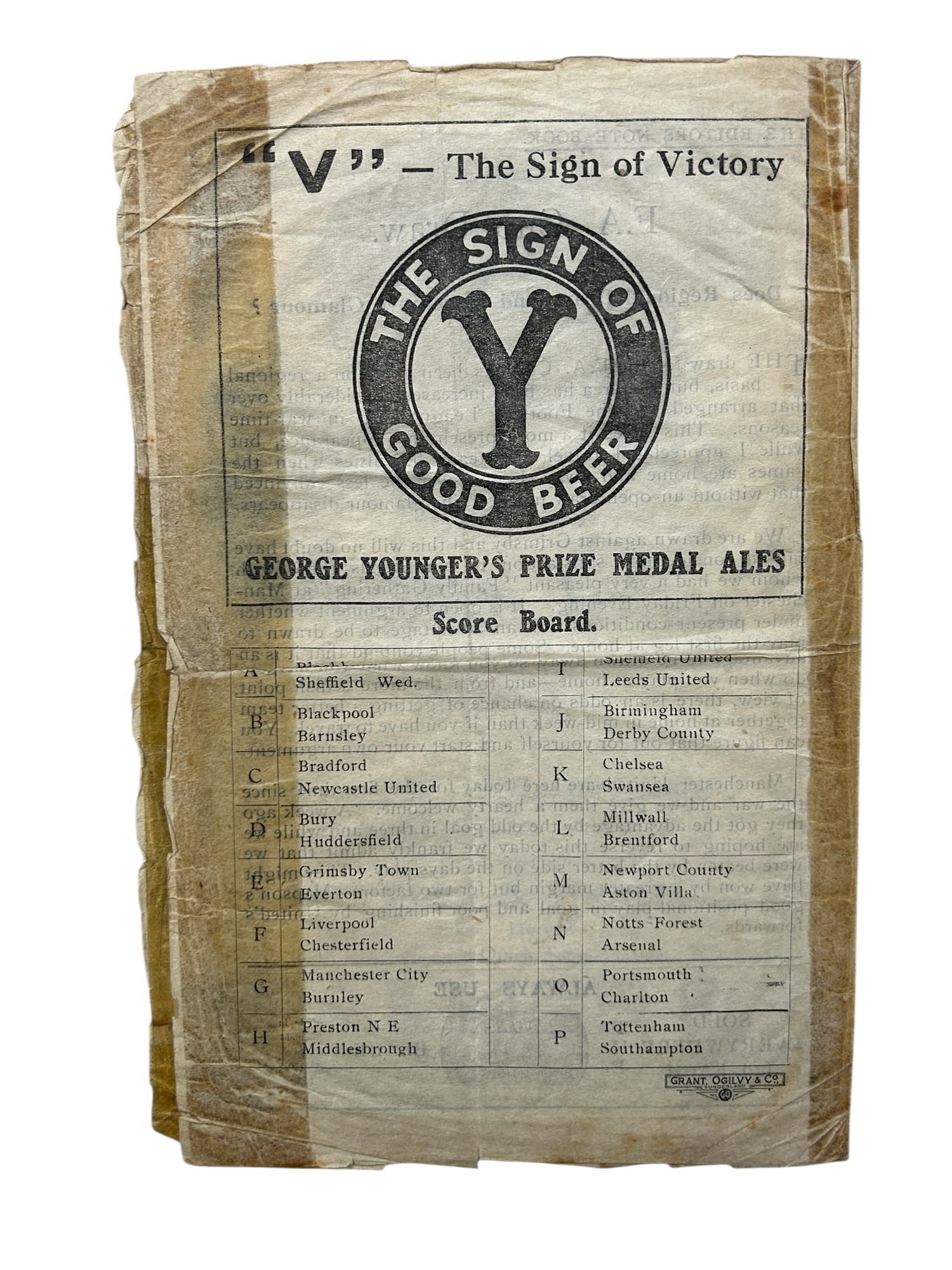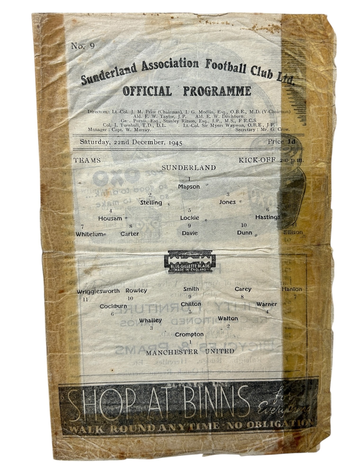 MANCHESTER UNITED AWAY VERSUS SUNDERLAND 1945/46 FOOTBALL PROGRAMME, 22/12/1945, 4-PAGE ISSUE. POOR CONDITION, SEE PHOTOS.