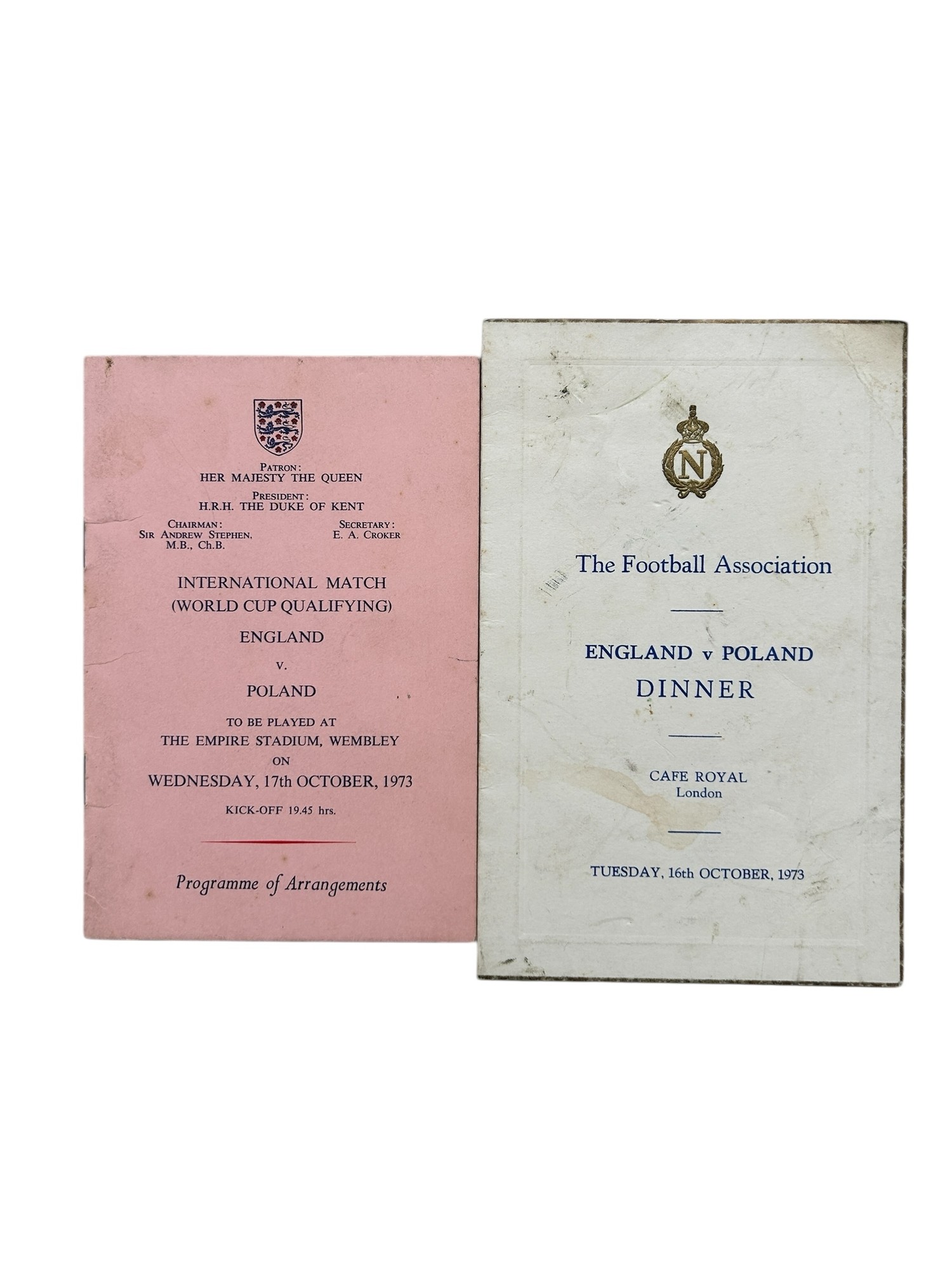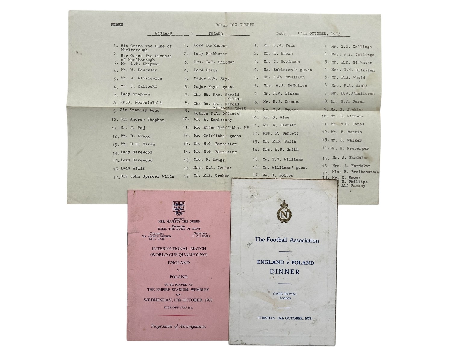 ENGLAND VERSUS POLAND 1973 WORLD CUP QUALIFIER DINNER MENU/ PROGRAMME OF ARRANGEMENTS/ ROYAL BOX GUEST LIST, 16-17/10/1973, GUEST LIST INCLUDES STANLEY ROUS/ SIR ALF RAMSEY/ AMONGST OTHERS.