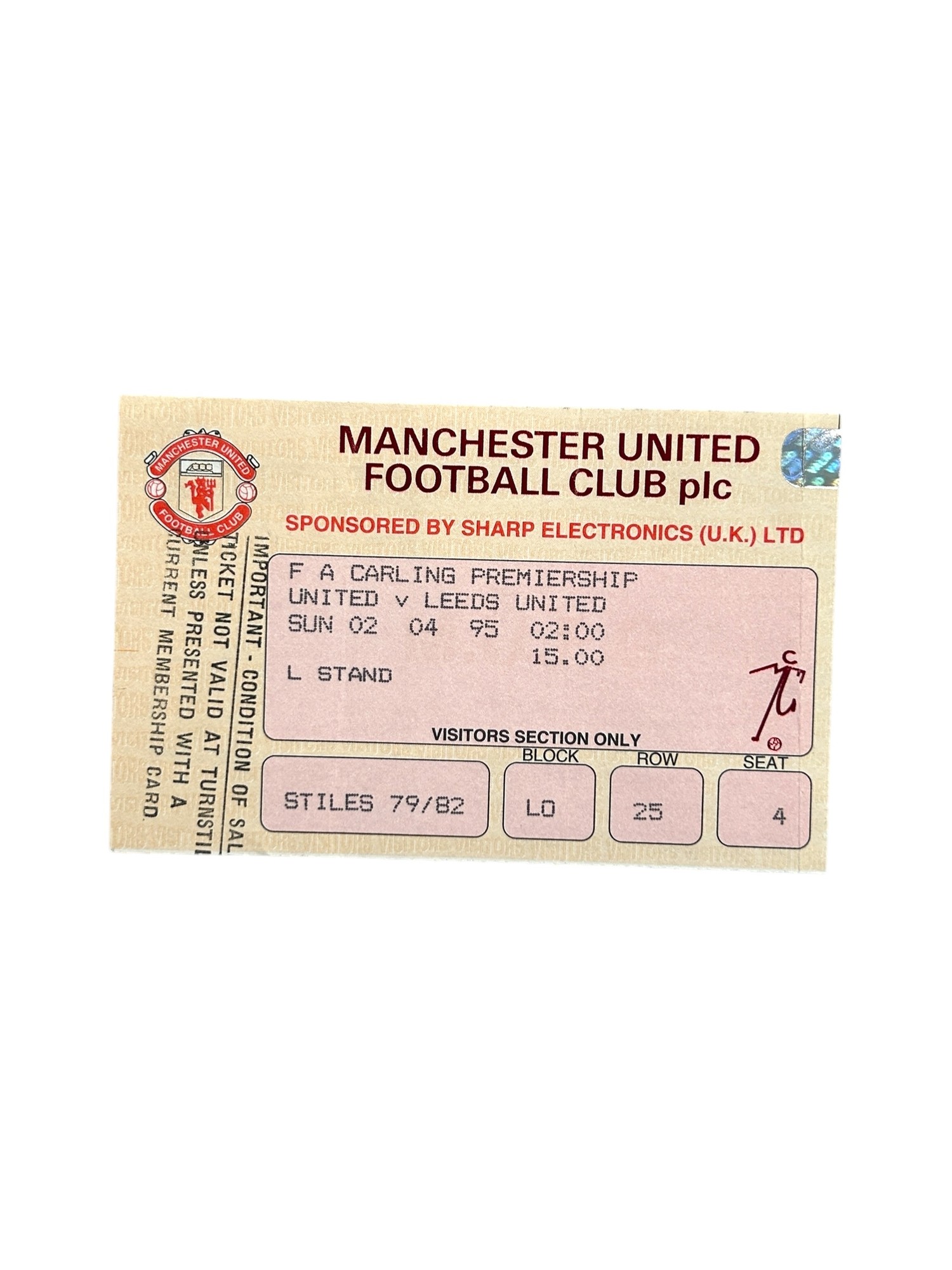 DAVID BECKHAM PREMIER LEAGUE DEBUT ROOKIE FOOTBALL TICKET STUB, MANCHESTER UNITED VERSUS LEEDS UNITED 1994/95, 02/04/1995. GREAT CONDITION.