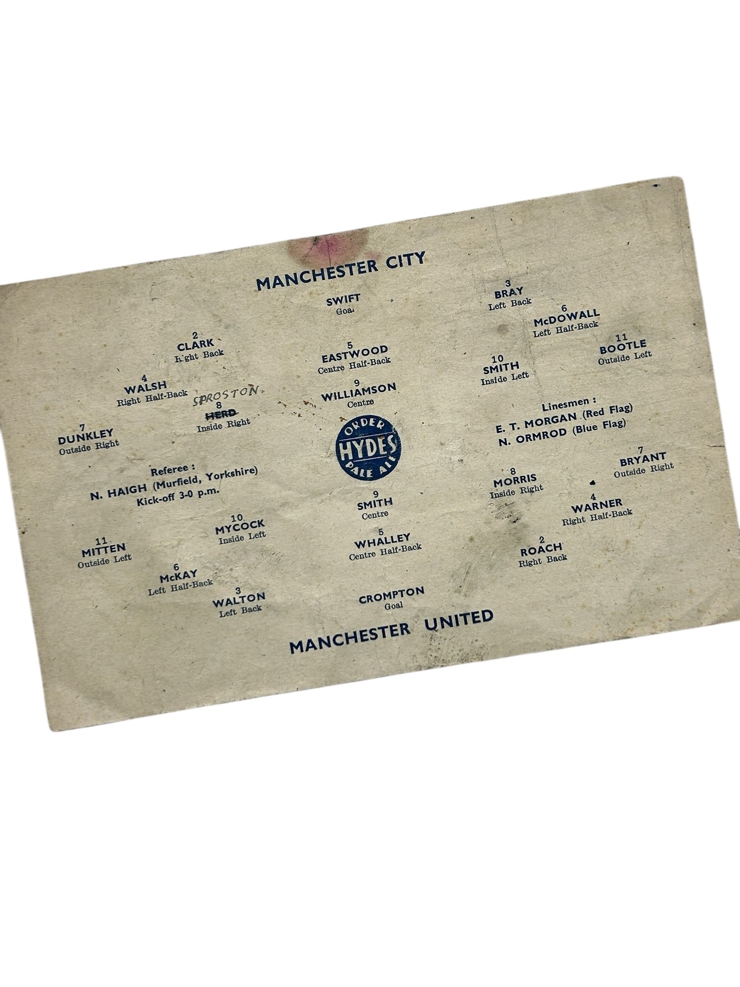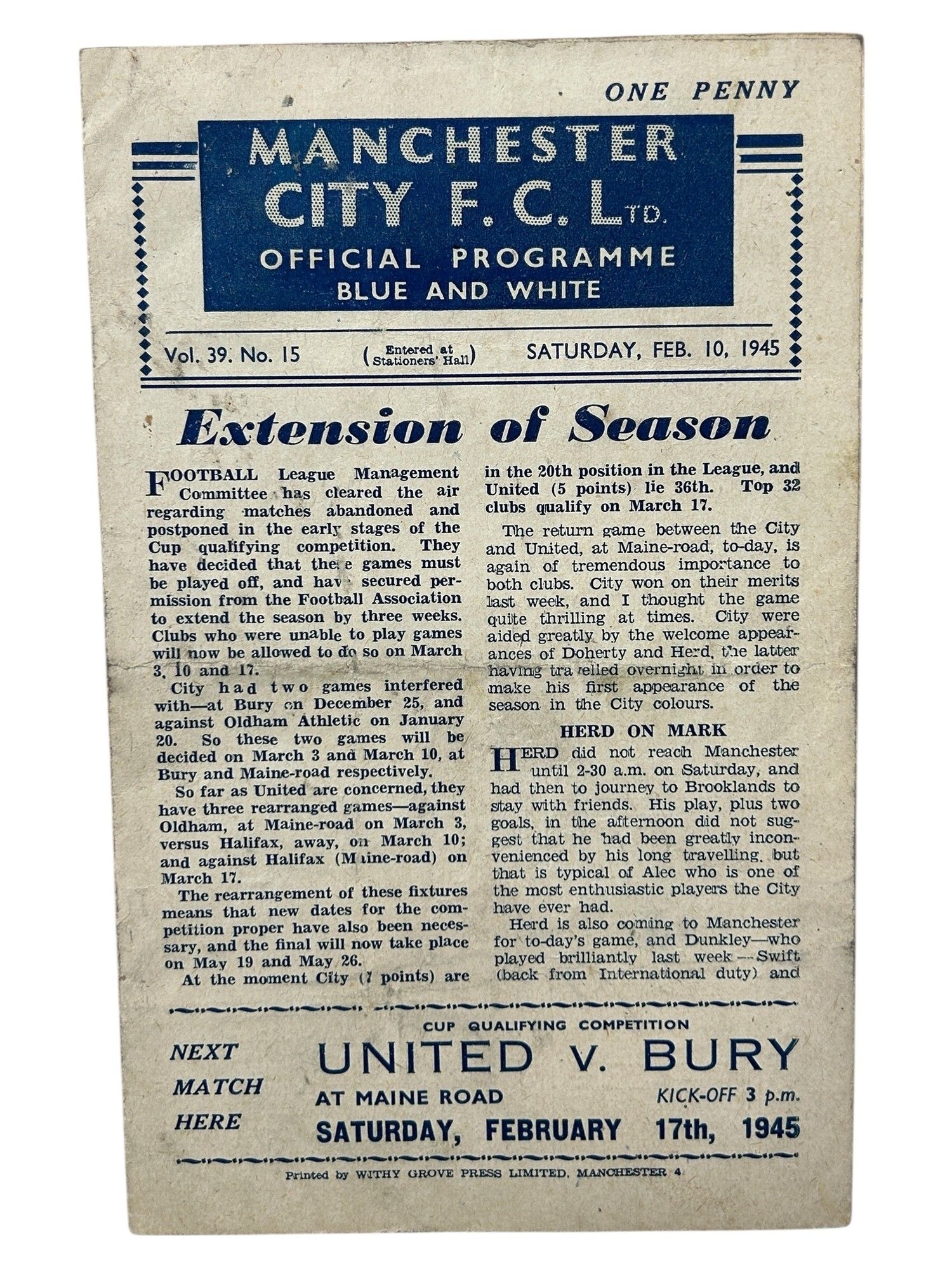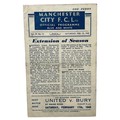 MANCHESTER UNITED AWAY VERSUS MANCHESTER CITY 1944/45 FOOTBALL PROGRAMME, 10/02/1945, WAR TIME 4-PAGE ISSUE. CREASING, HANDLING MARKS.