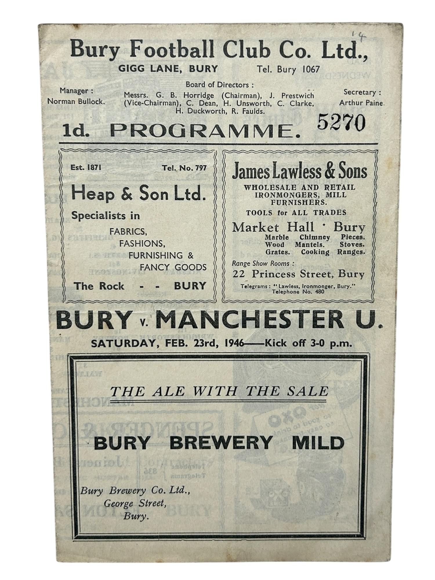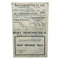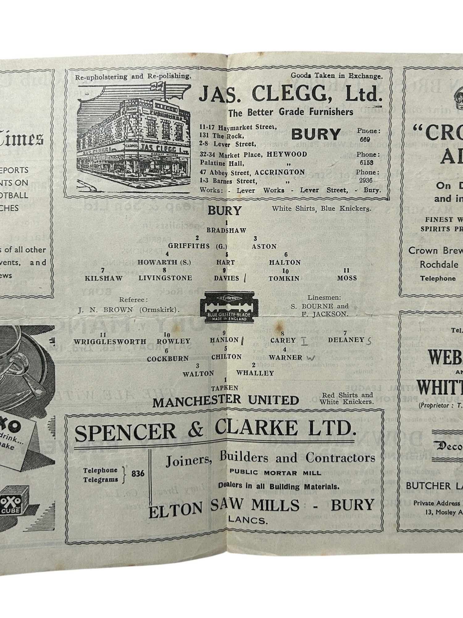 MANCHESTER UNITED AWAY VERSUS BURY 1945/46 FOOTBALL PROGRAMME, 23/02/1946, 4-PAGE ISSUE. CREASES, PENCIL CHANGES.