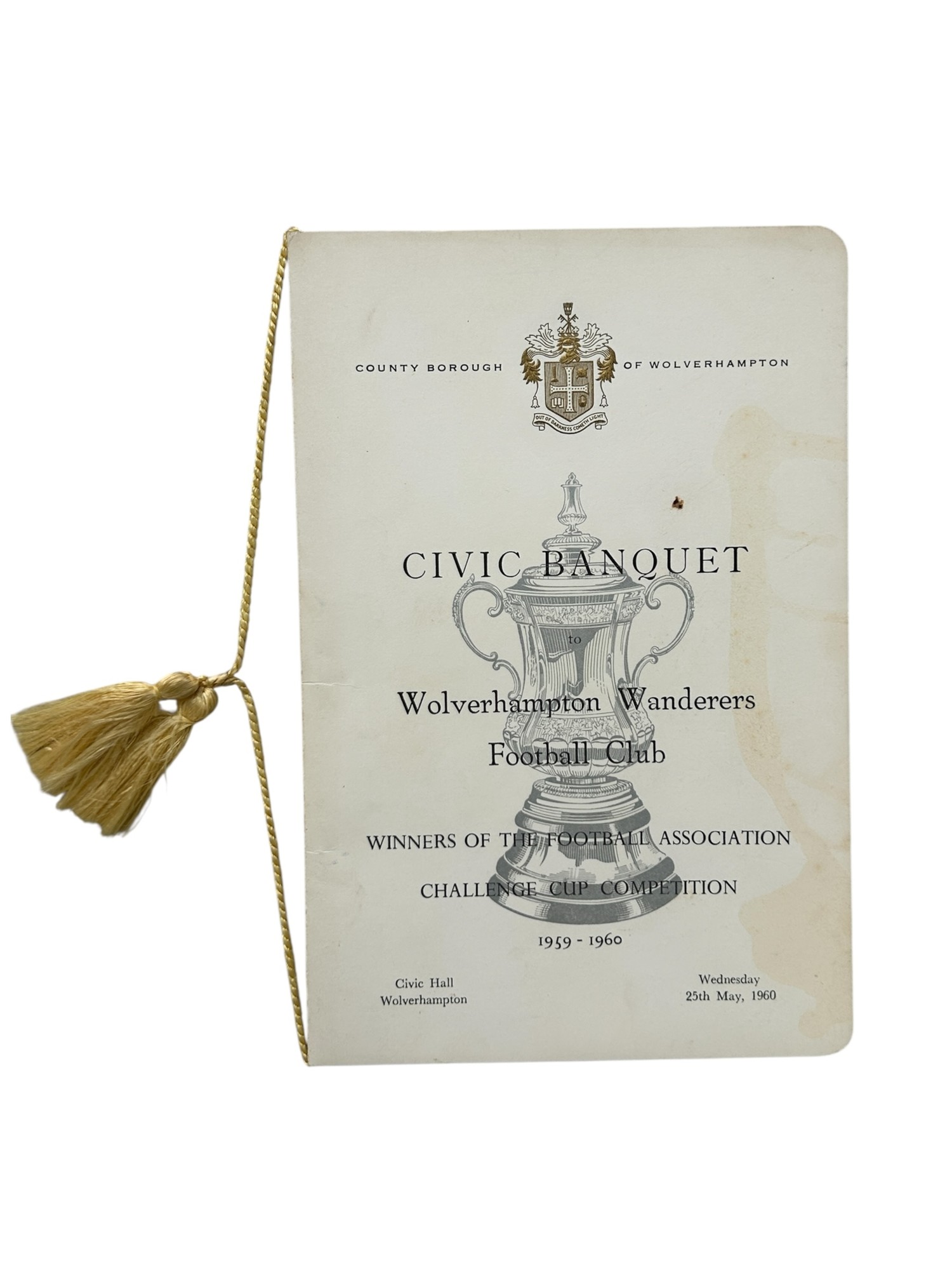 1960 WOLVERHAMPTON WANDERERS FA CUP WINNERS CIVIL BANQUET, SIGNED BY 12, 25/5/1960, CIVIC HALL WOLVERHAMPTON.