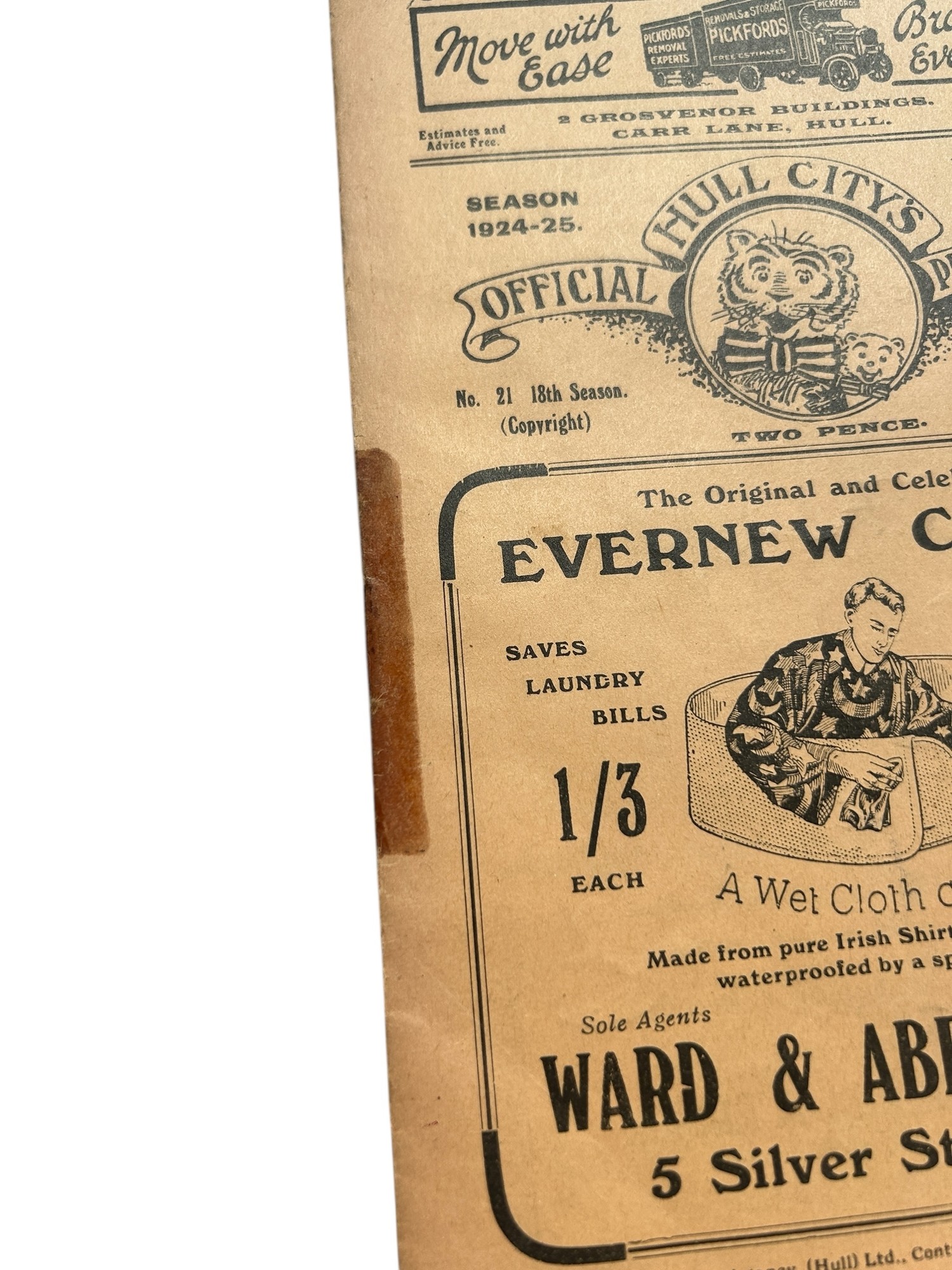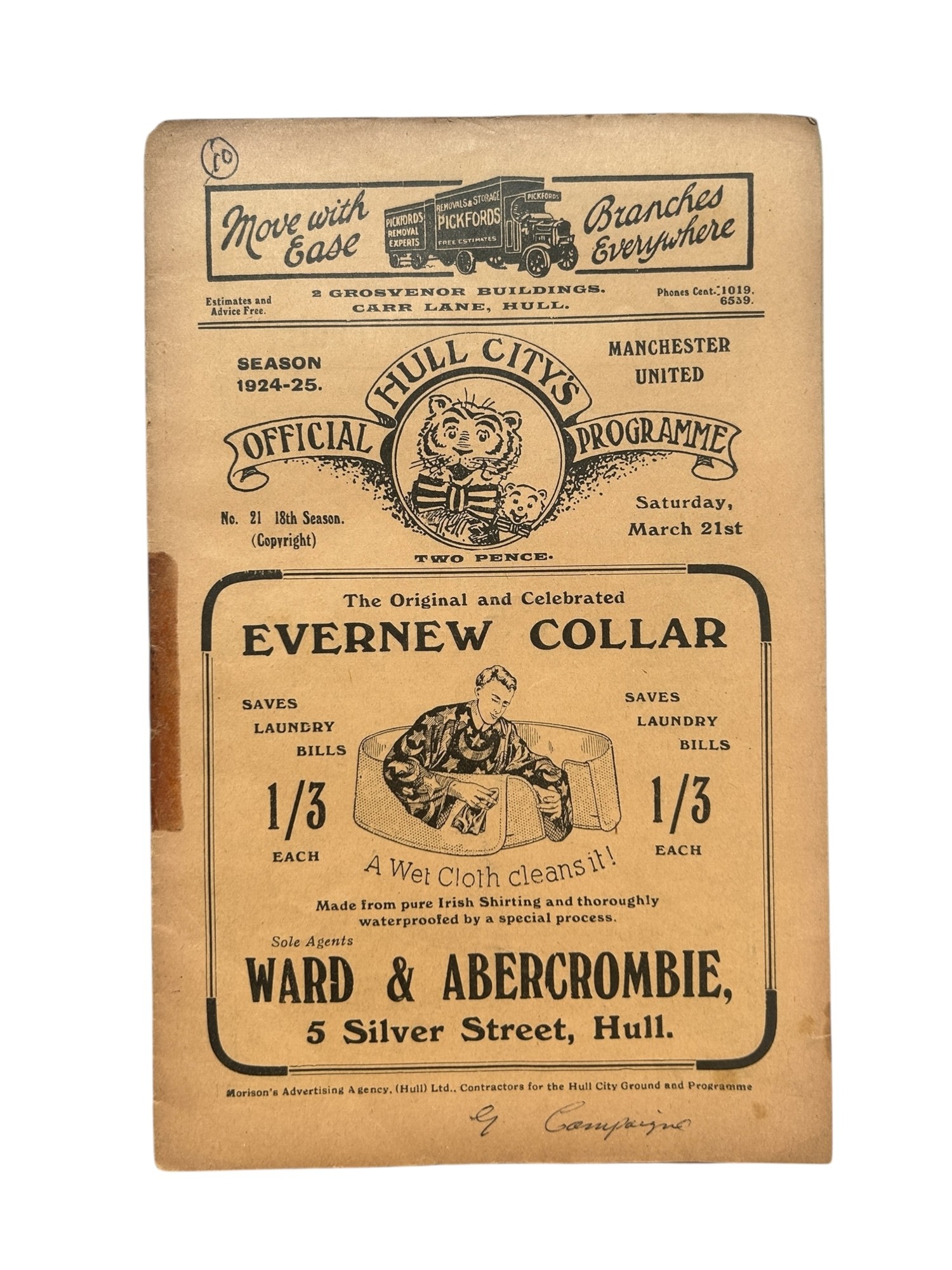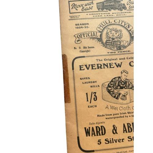 MANCHESTER UNITED AWAY VERSUS HULL CITY 1924/25 FOOTBALL PROGRAMME, 21/3/1925, UNITED PROMOTION WINNING SEASON. TAPE TO SPINE, GENERALLY GOOD.