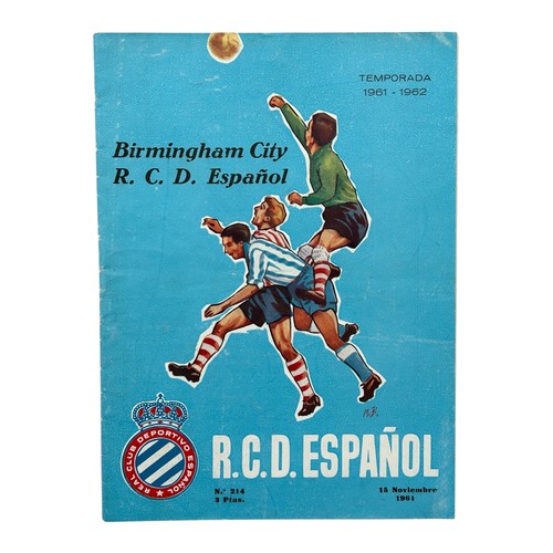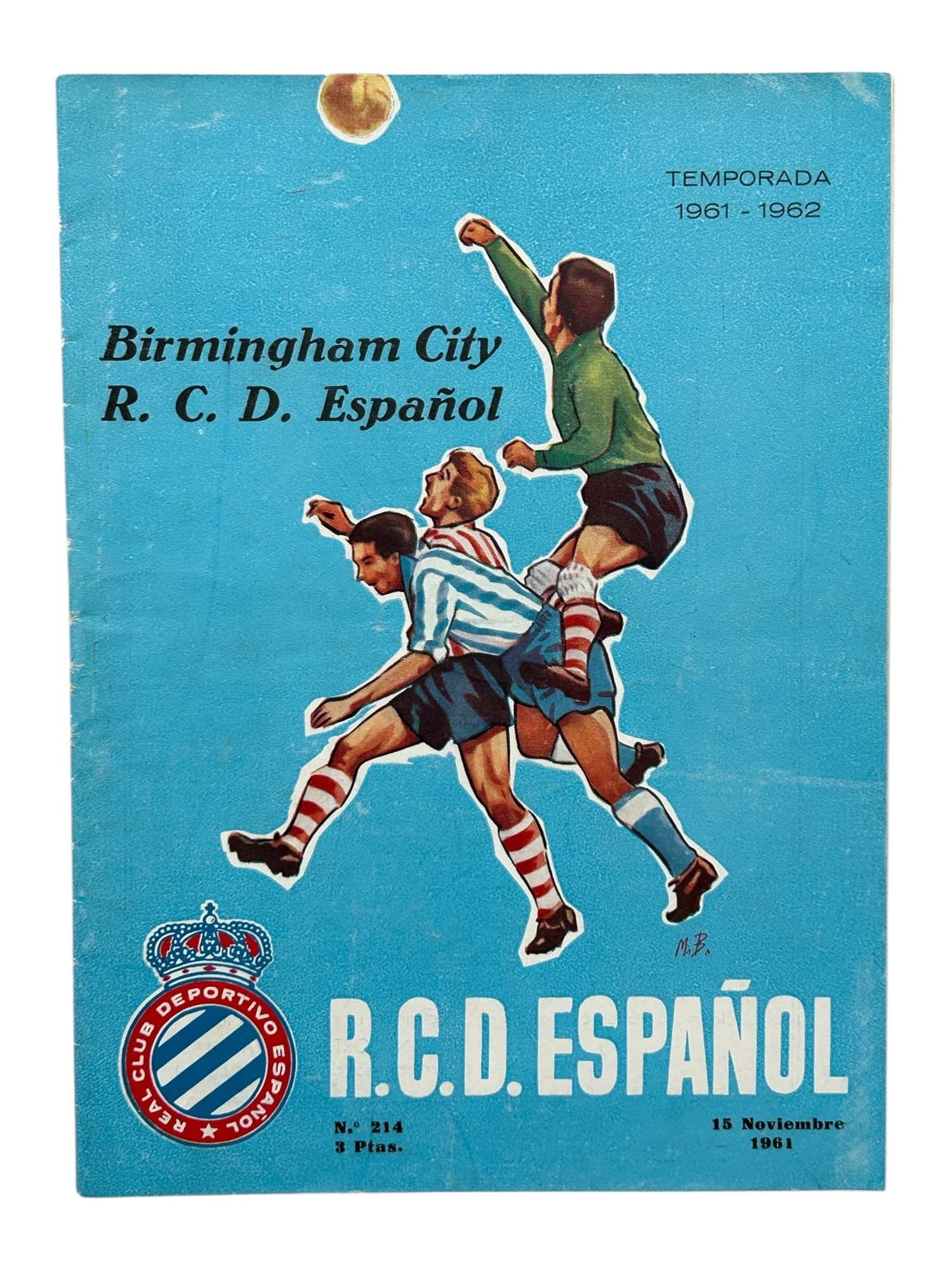 BIRMINGHAM CITY AWAY VERSUS R.C.D ESPANYOL 1961/62 FOOTBALL PROGRAMME, 15/11/1961, FAIRS CUP, SCARCE ITEM. GENERALLY GOOD.