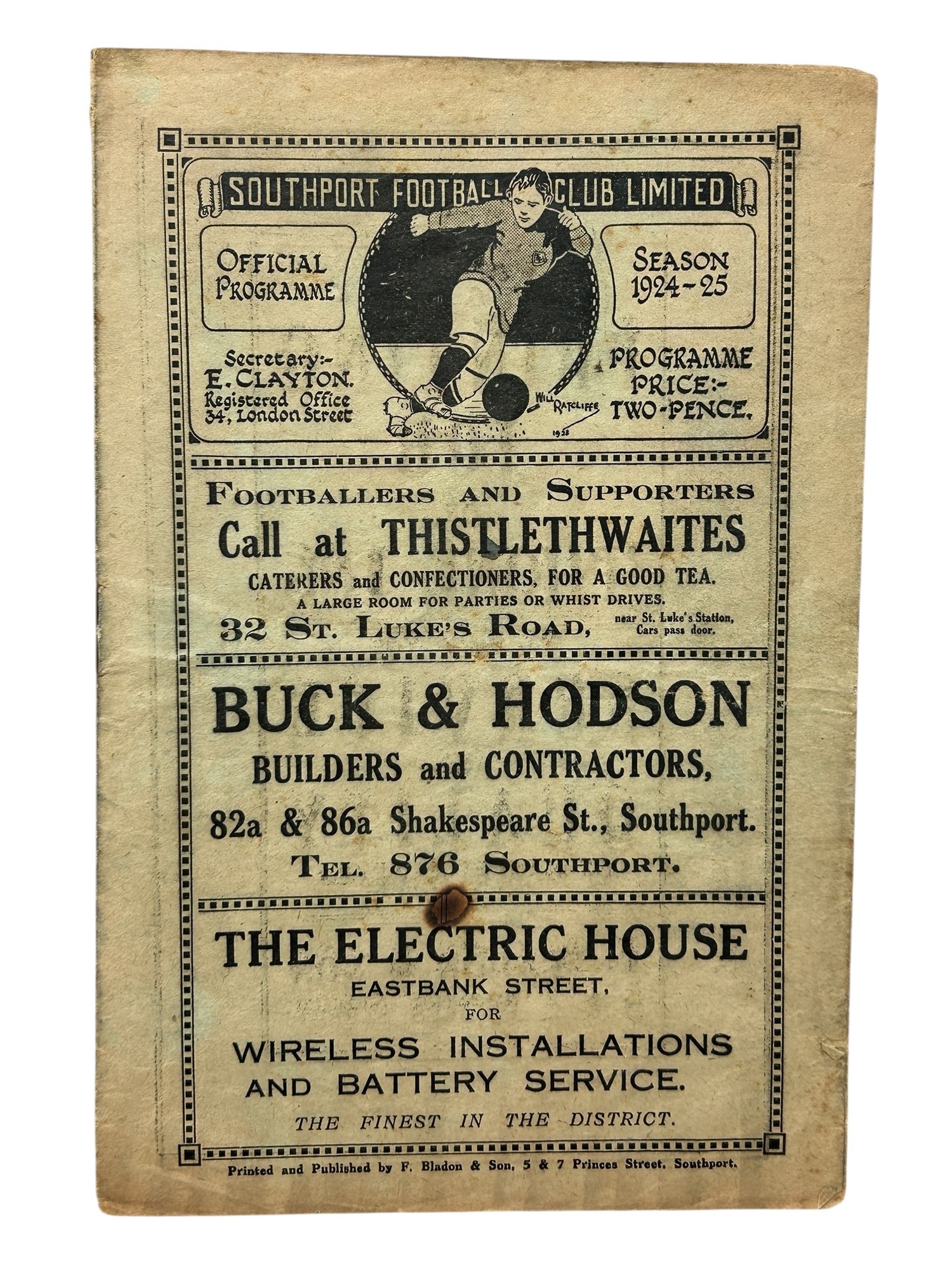 SOUTHPORT VERSUS BACUP 1924/25 FOOTBALL PROGRAMME, 13/12/1924. MINOR AGEING THROUGHOUT, HOLE TO COVER.