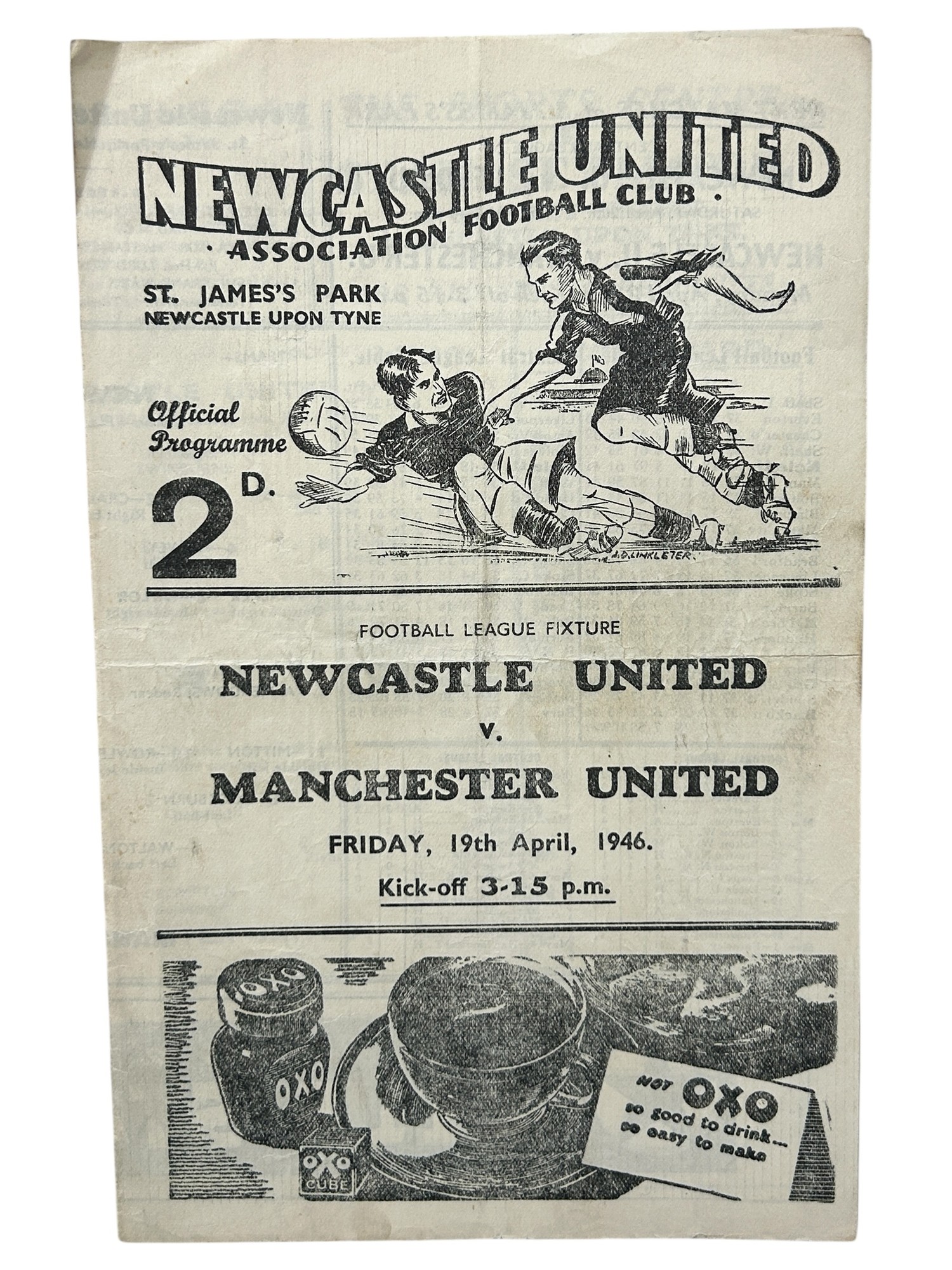 MANCHESTER UNITED AWAY VERSUS NEWCASTLE UNITED 1945/46 FOOTBALL PROGRAMME, 19/04/1946, 4-PAGE ISSUE. CREASING, MARKS.