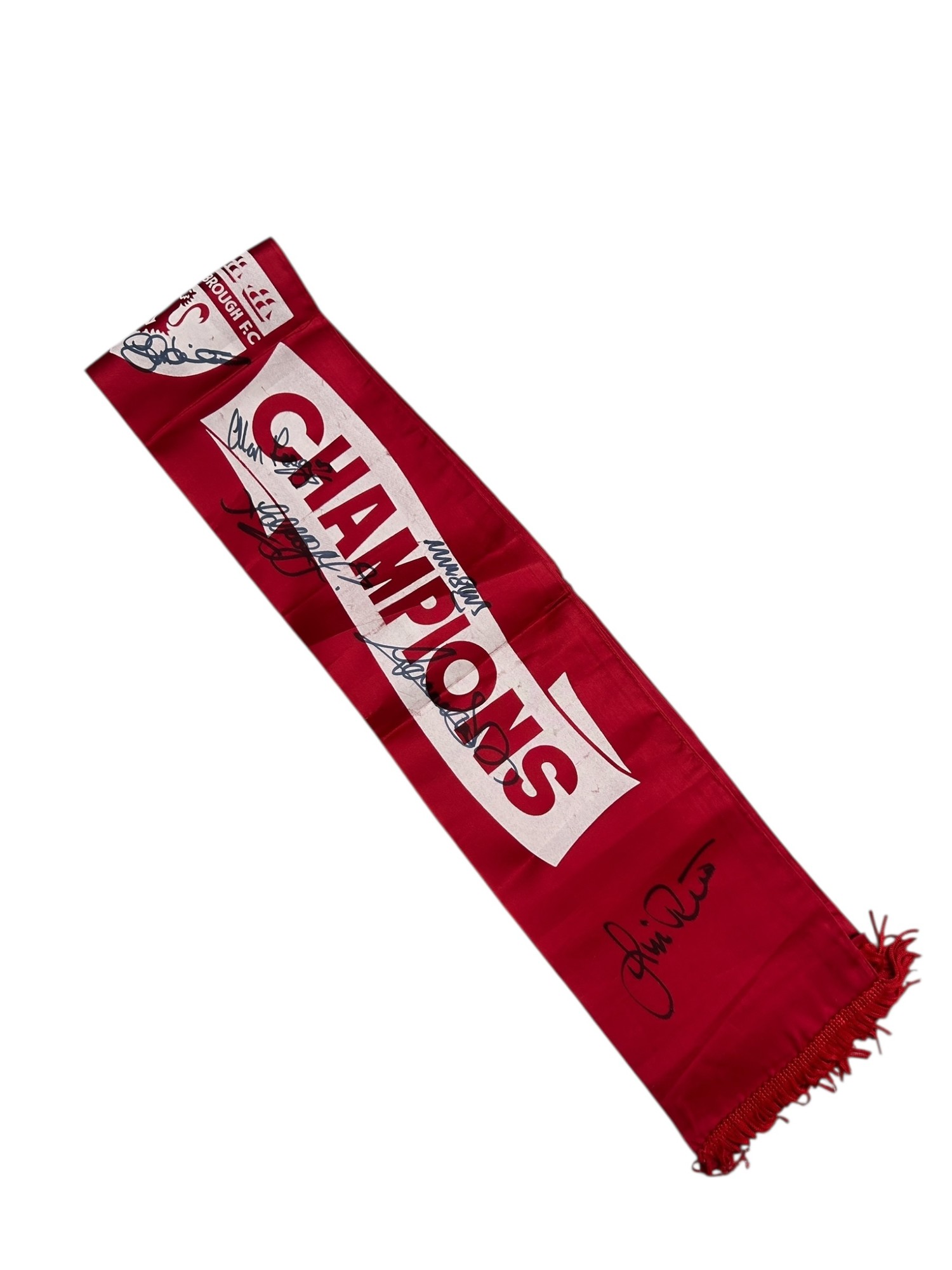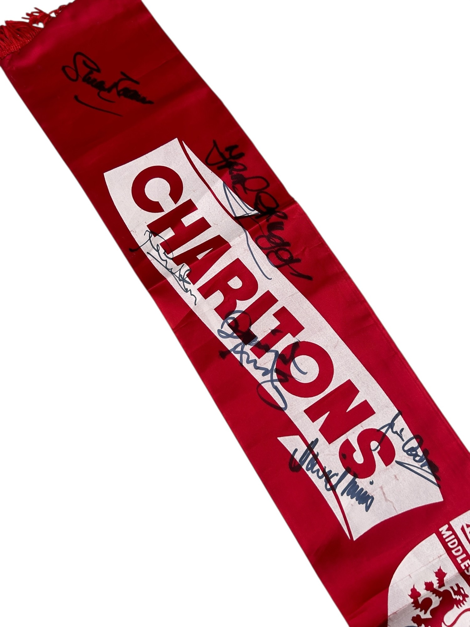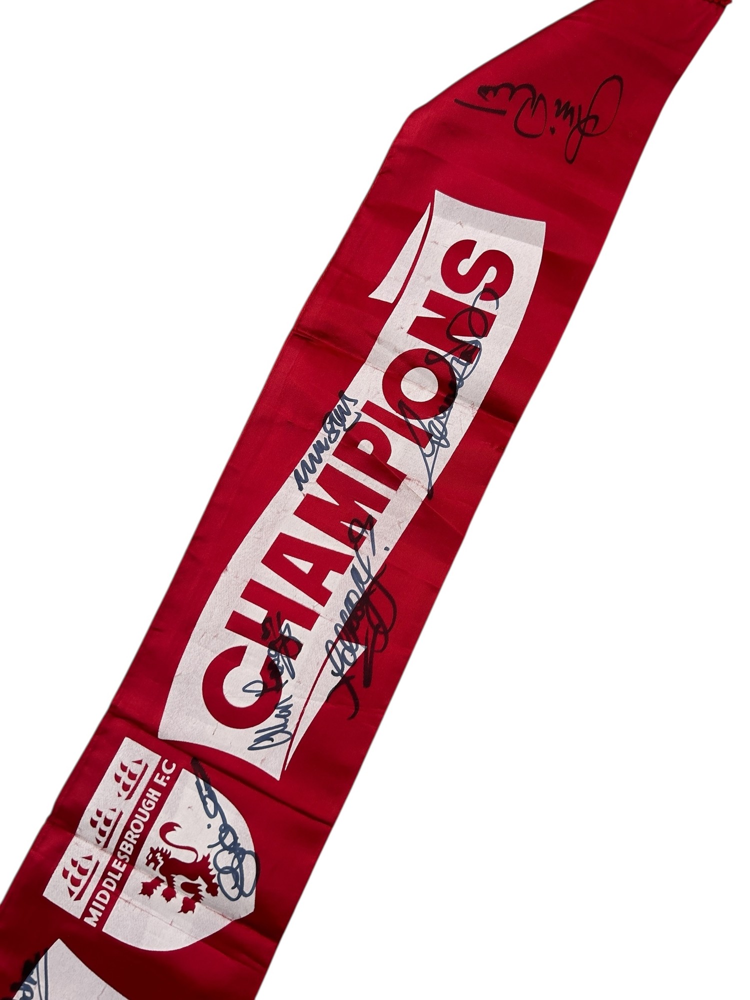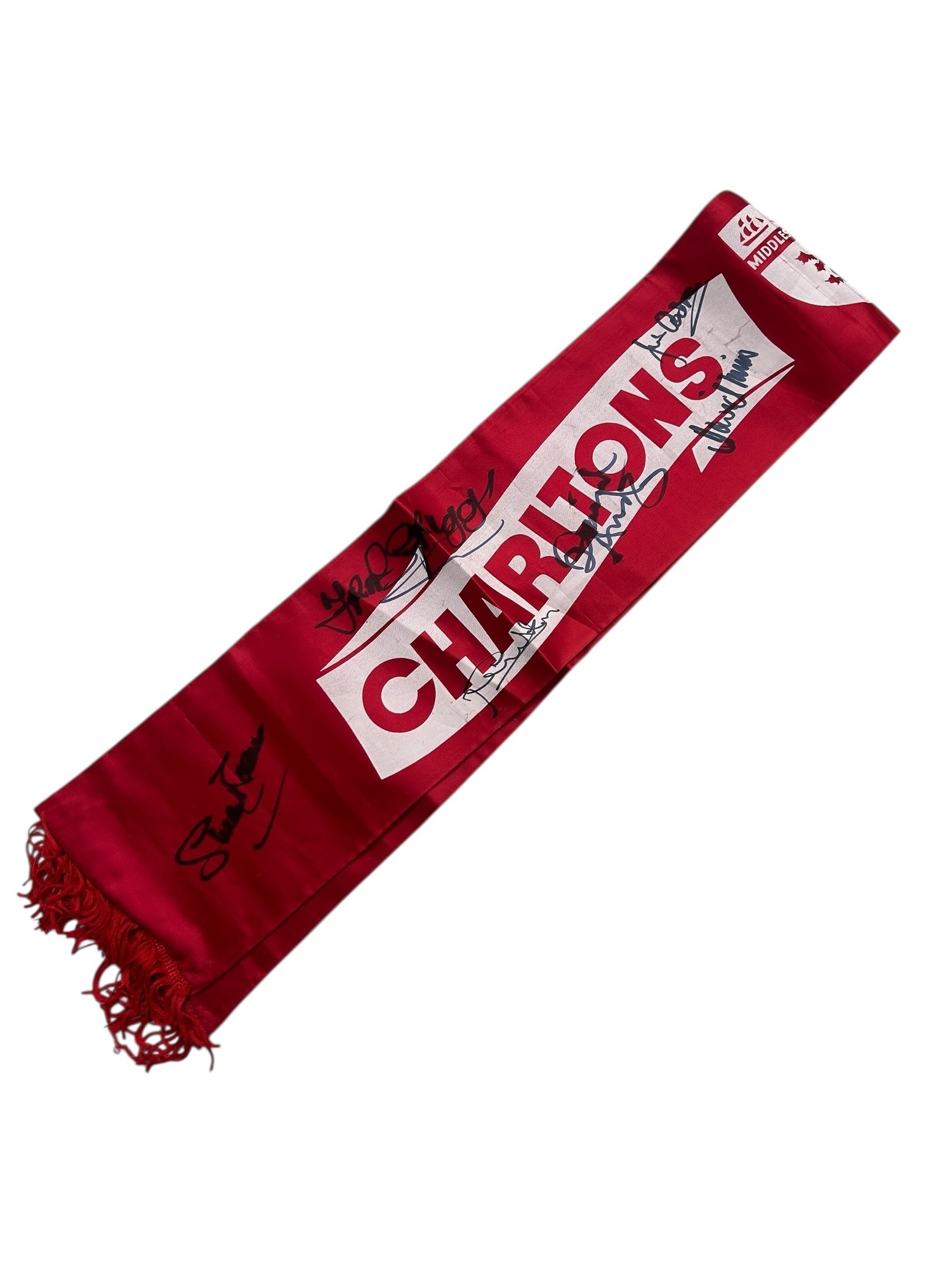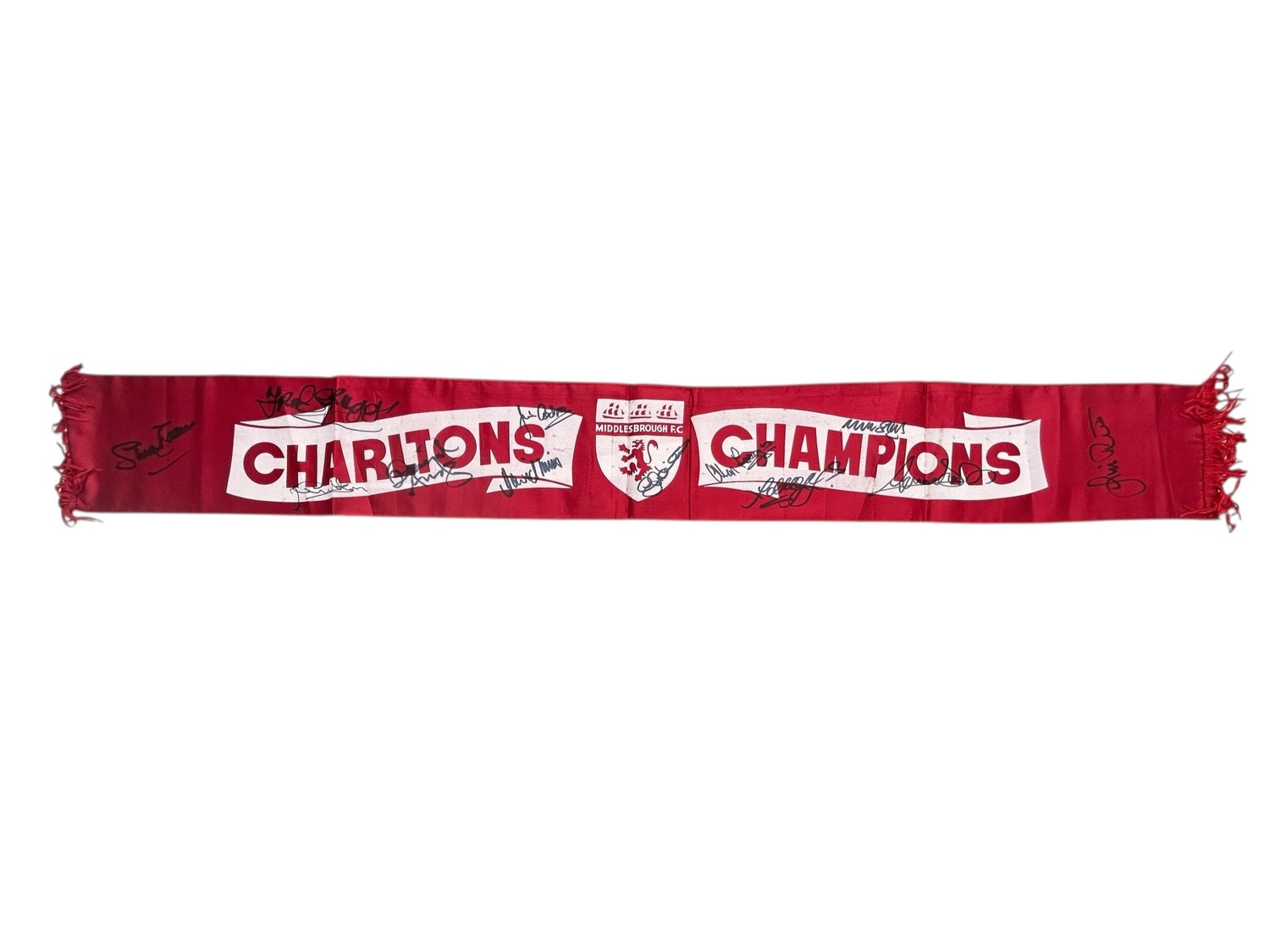 MIDDLESBOROUGH 1973/74 CHARLTON'S CHAMPIONS SIGNED SCARF, SILK STYLE, X11 AUTOGRAPHS NOTED.