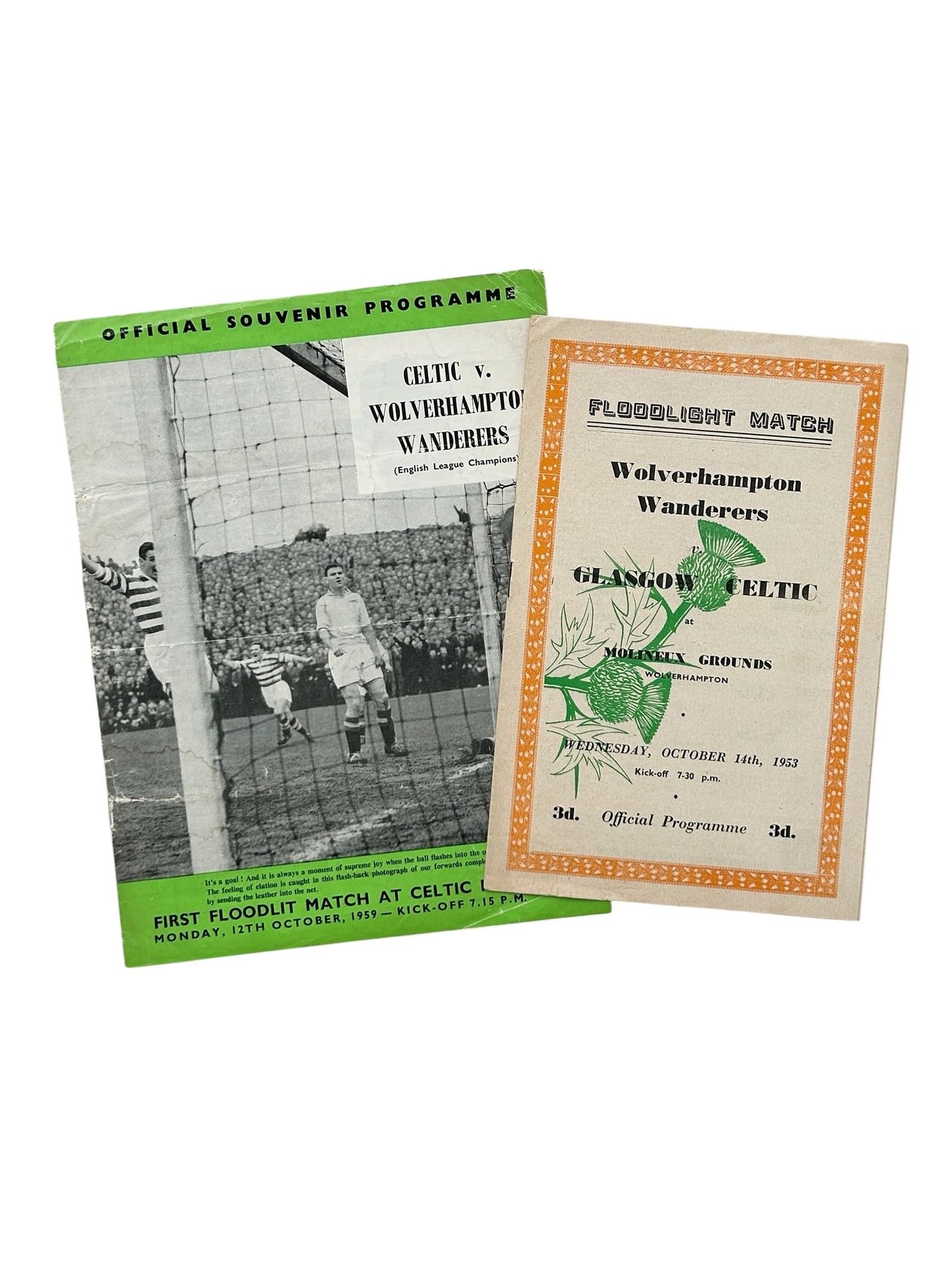 X2 WOLVERHAMPTON WANDERERS VERSUS GLASGOW CELTIC FOOTBALL PROGRAMMES, 14/10/1953 AT MOLINEUX (LINE UP CHANGES), 12/10/1959 AT CELTIC PARK (CREASING).