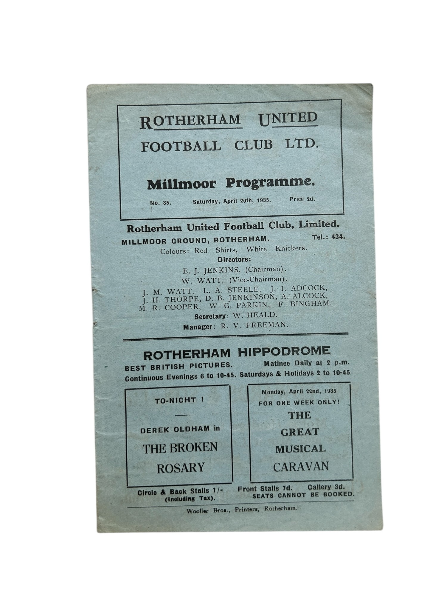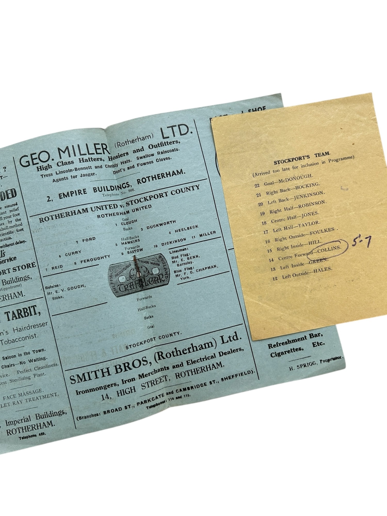 ROTHERHAM UNITED VERSUS STOCKPORT COUNTY 1934/35 FOOTBALL PROGRAMME, 20/4/1935, INCLUDES STOCKPORT TEAM SHEET. GENERALLY GOOD, MINOR MARKS NOTED THROUGHOUT.