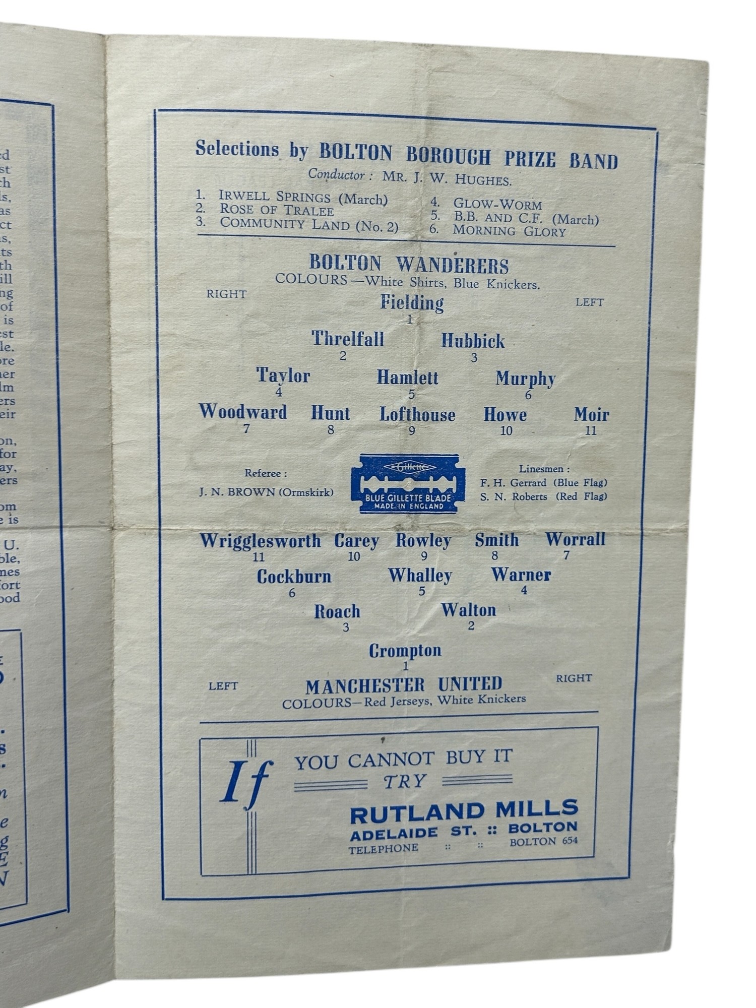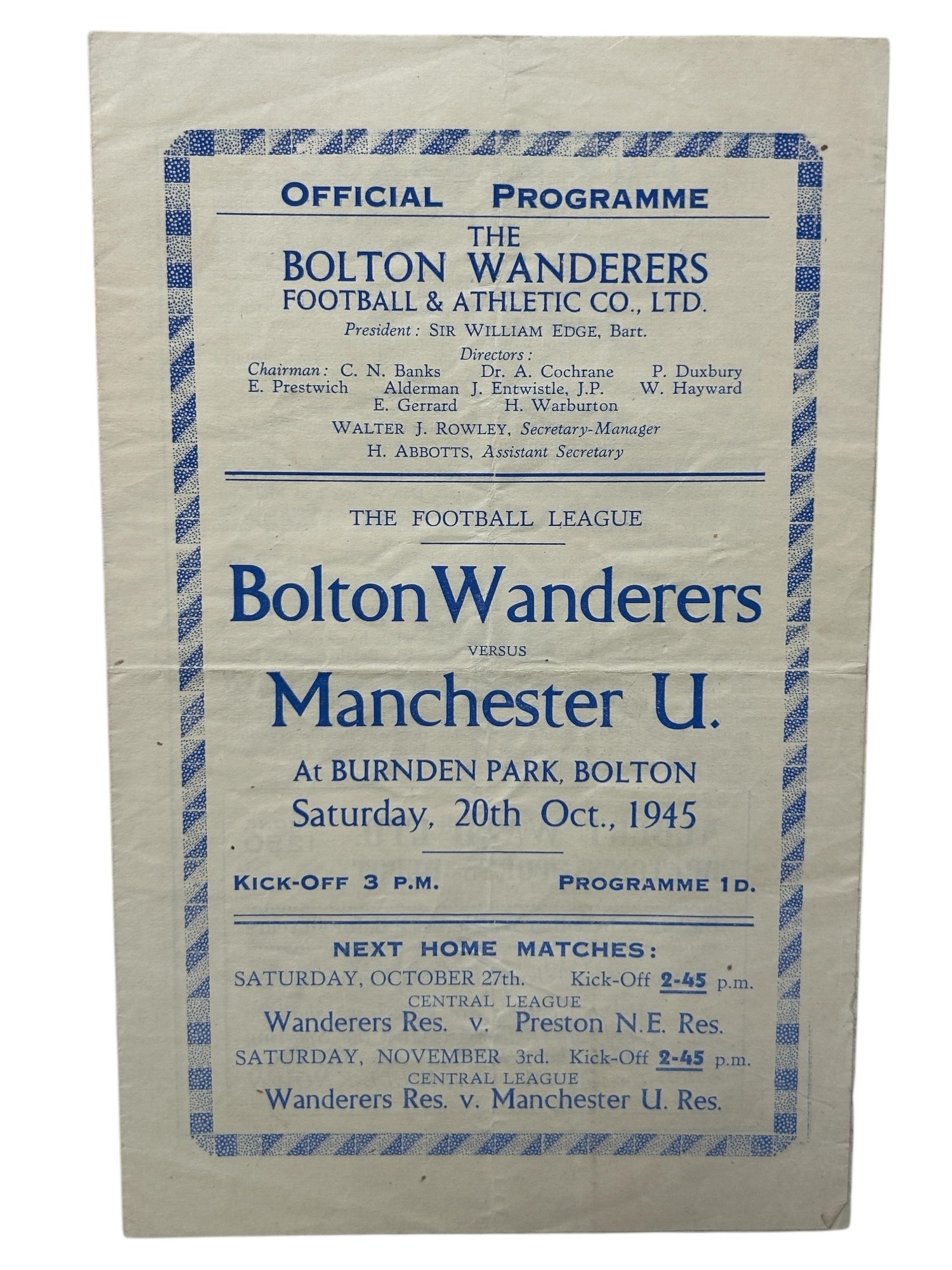 MANCHESTER UNITED AWAY VERSUS BOLTON WANDERERS 1945/46 FOOTBALL PROGRAMME, 20/10/1945, 4-PAGE ISSUE. CREASING.