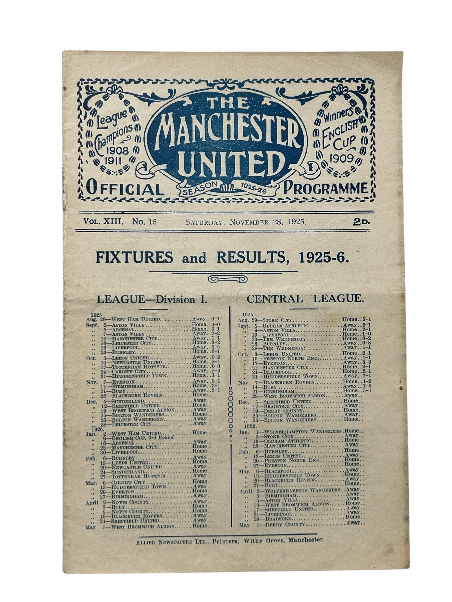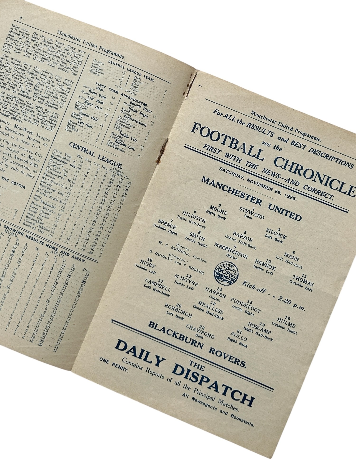MANCHESTER UNITED VERSUS BLACKBURN ROVERS 1925/26 FOOTBALL PROGRAMME, 28/11/1925. LIGHT FOLDS, GENERALLY GOOD.