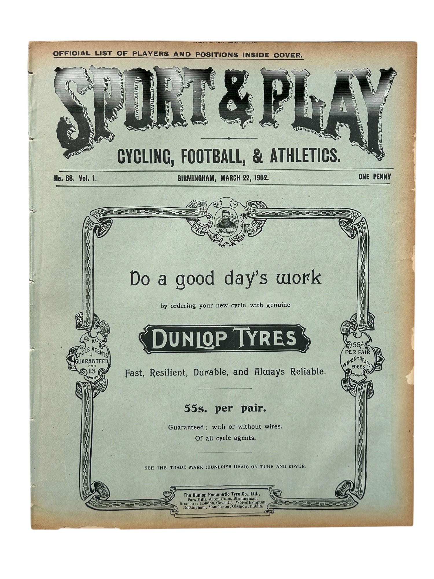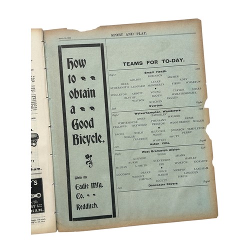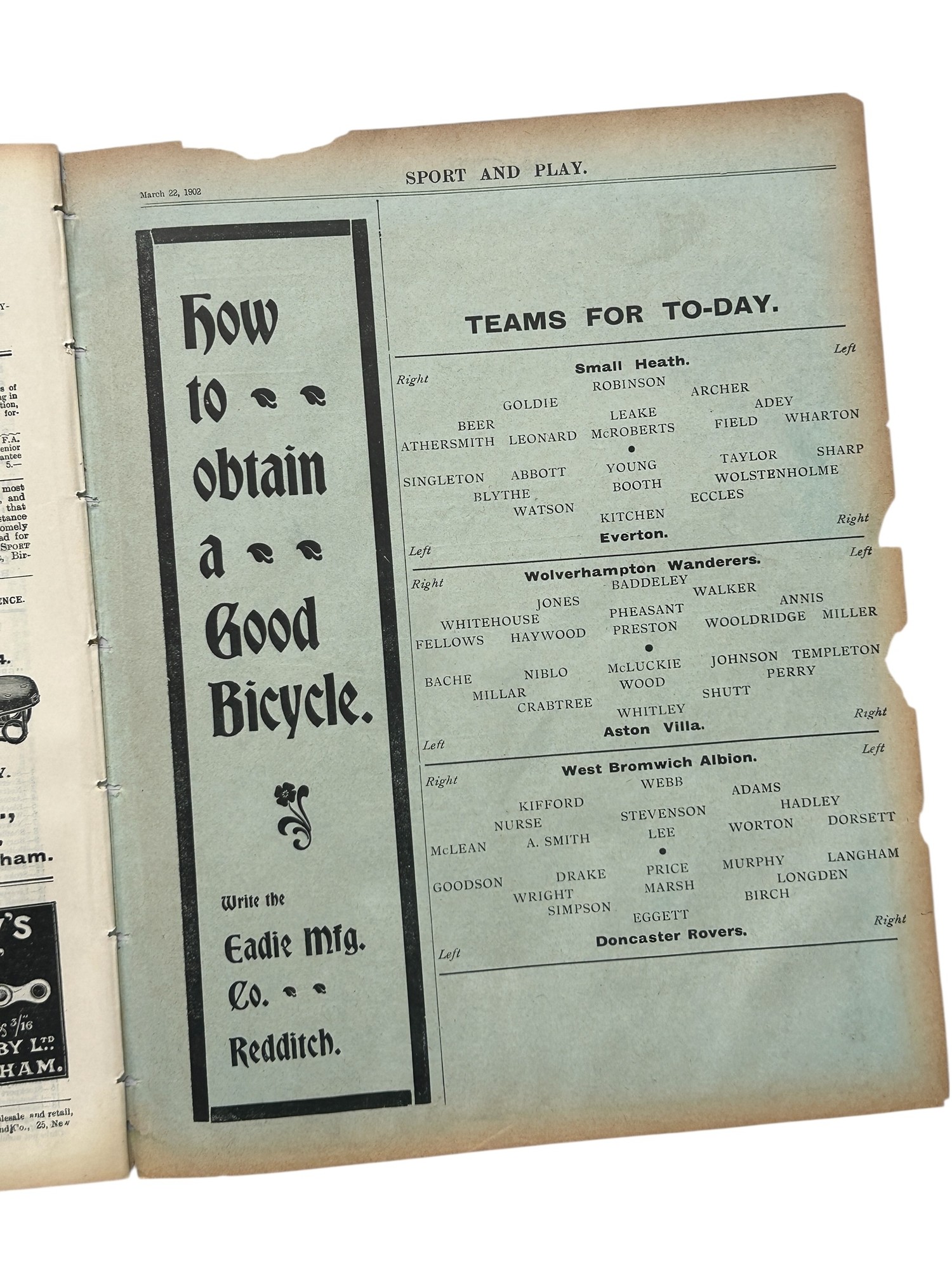 1901/02 SMALL HEATH VERSUS EVERTON/ WOLVES VERSUS ASTON VILLA/ WEST BROMWICH ALBION VERSUS DONCASTER, 22/3/1902, SPORTS & PLAY MAGAZINE 1901/02 ISSUE, COVERING FIXTURES/ RESULTS/ REPORTS- LINEUPS LISTED FROM ALL 3 GAMES. EX BINDER, SPINE WEAR.