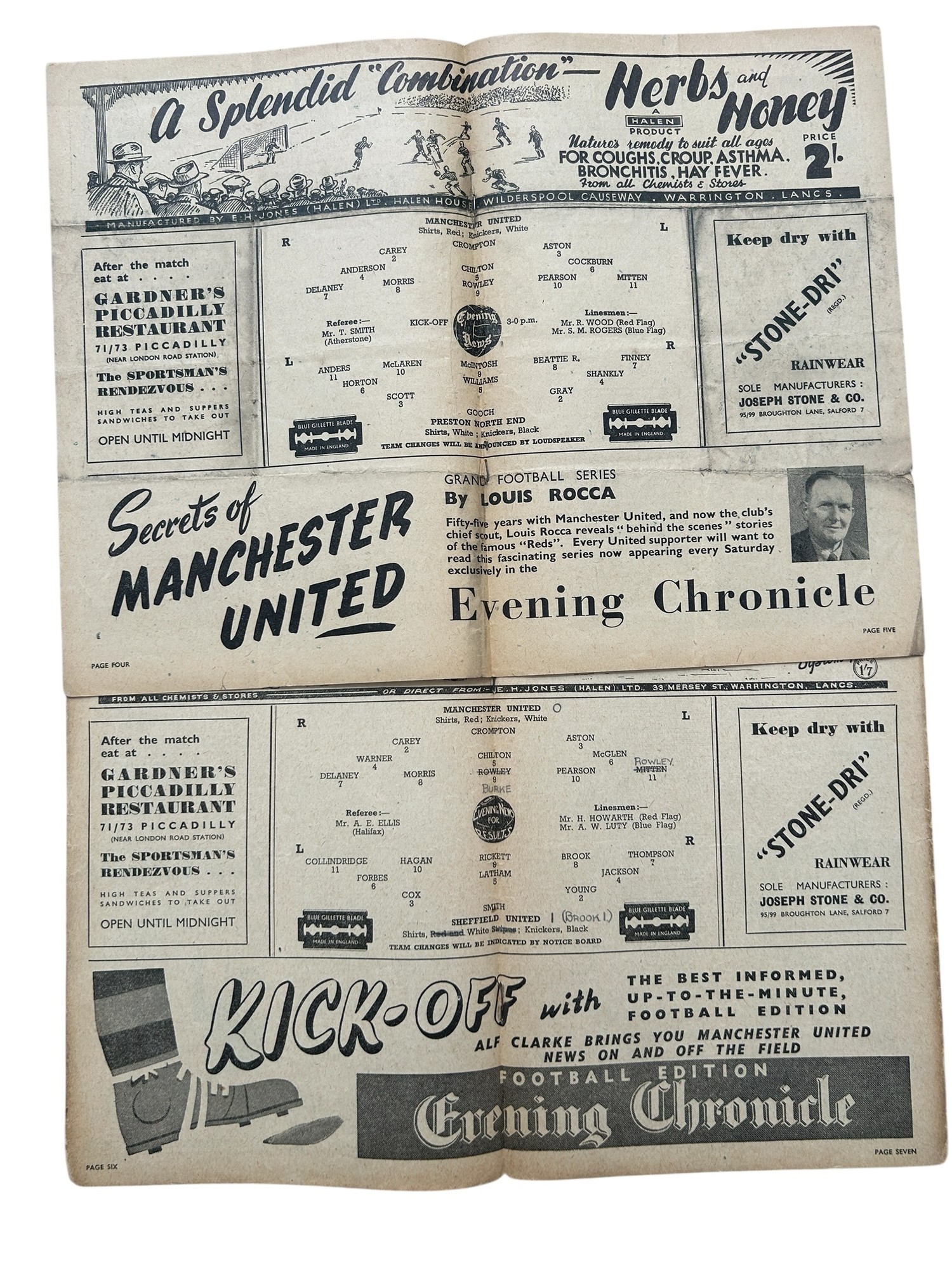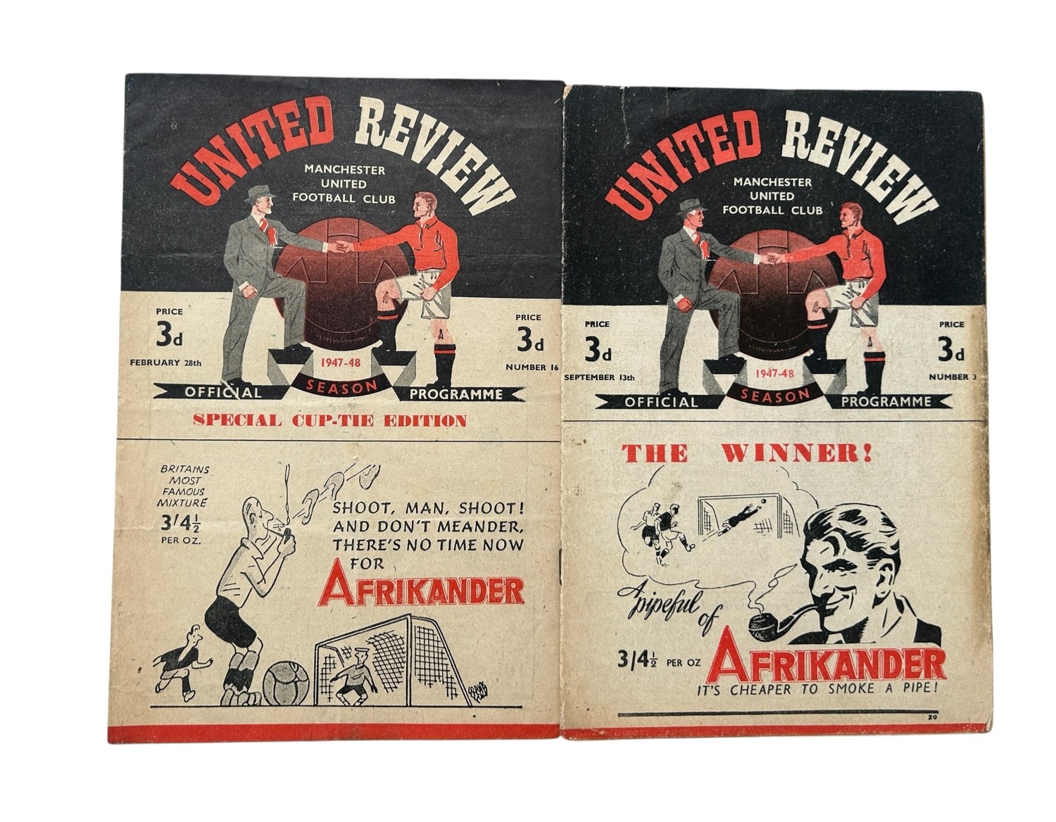 X2 MANCHESTER UNITED 1947/48 HOME FOOTBALL PROGRAMMES, SHEFFIELD UNITED LEAGUE 13/9/1947, PRESTON NE FA CUP 28/2/1948. FOLDS/ PENCIL SCORES NOTED.