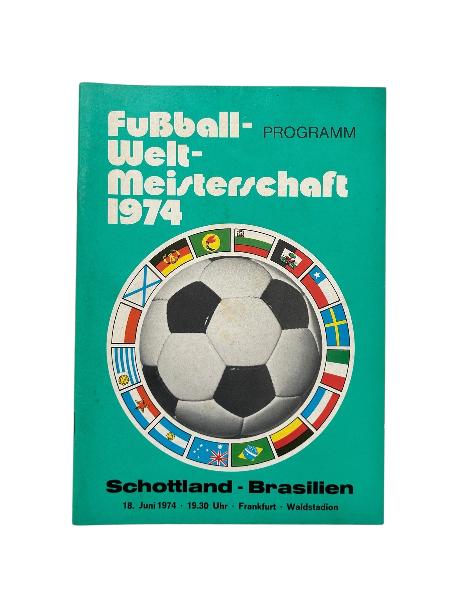 1974 WEST GERMANY WORLD CUP FOOTBALL PROGRAMME, SCOTLAND VERSUS BRAZIL, 18/6/1974. GENERALLY VERY CLEAN, MINOR FOXING NOTED.