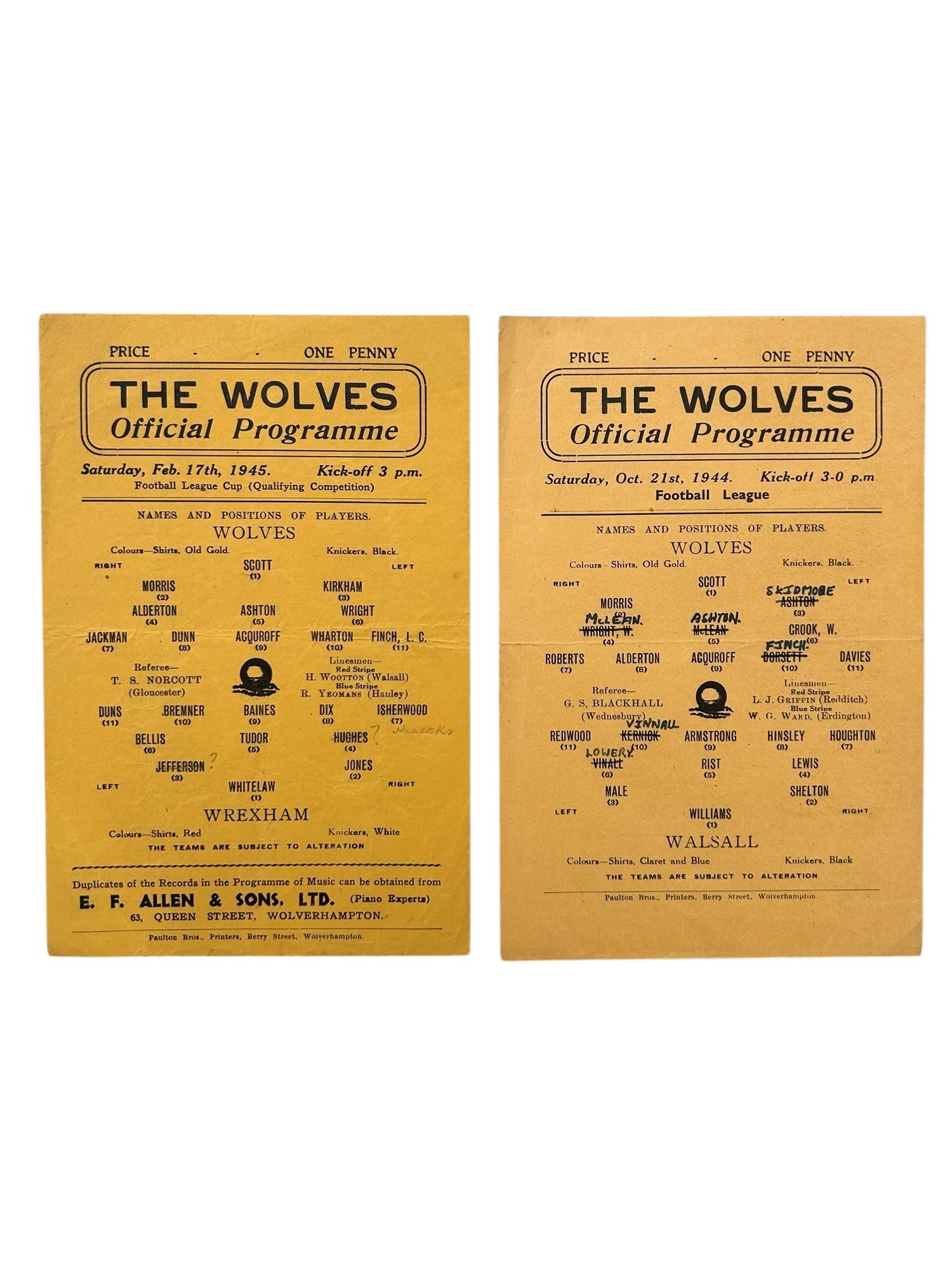 X2 WOLVERHAMPTON WANDERERS 1944/45 FOOTBALL LEAGUE CUP SINGLE SHEET FOOTBALL PROGRAMMES, VERSUS WALSALL 21/10/1944 (CHANGES/ CREASING), WREXHAM 17/2/1945 (CHANGES/ CREASE)
