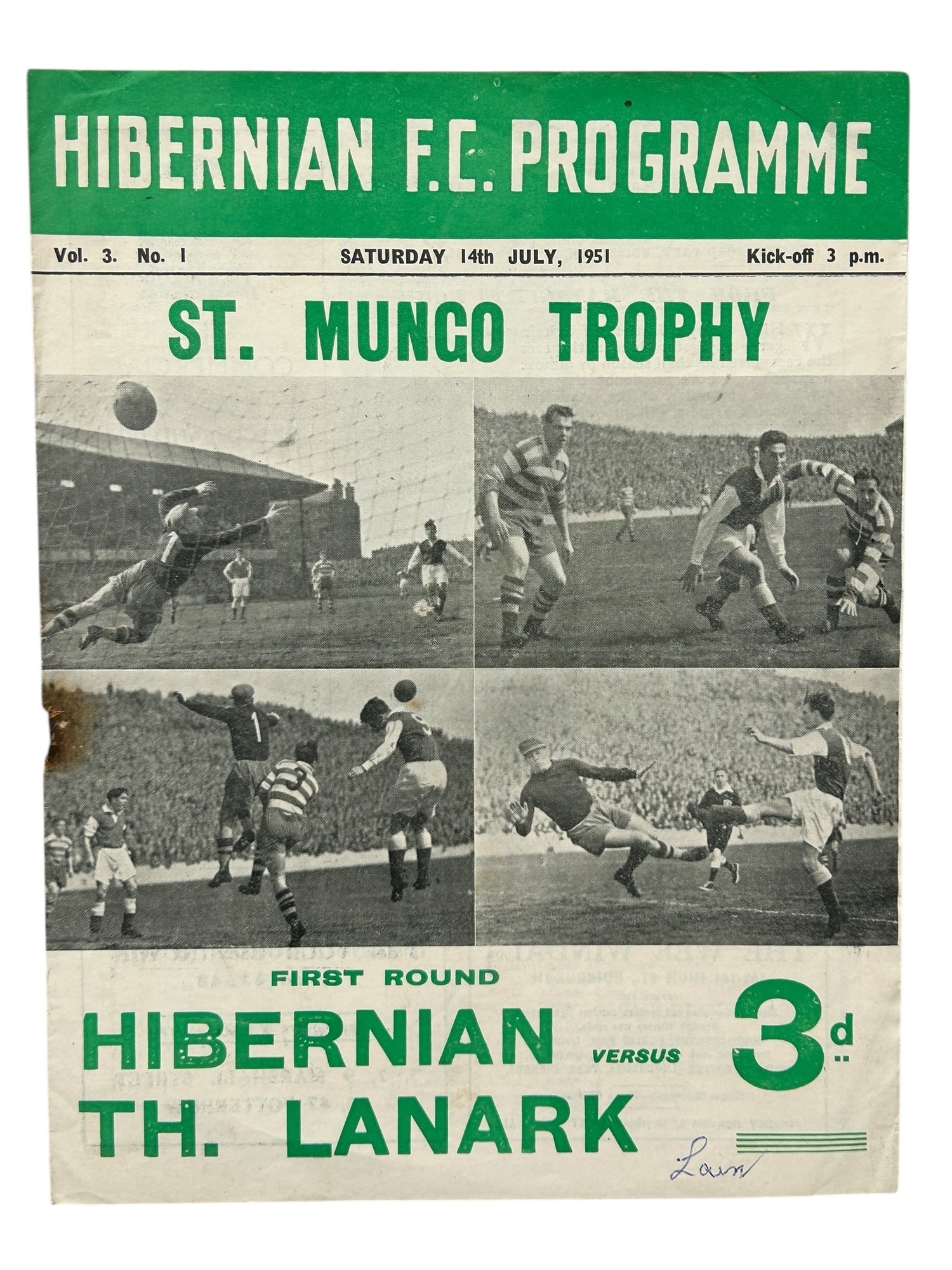 HIBERNIAN VERSUS THIRD LANARK 1951/52 FOOTBALL PROGRAMME, ST. MUNGO TROPHY, 14/7/1951. CREASING, RUSTY STAPLES REMOVED.
