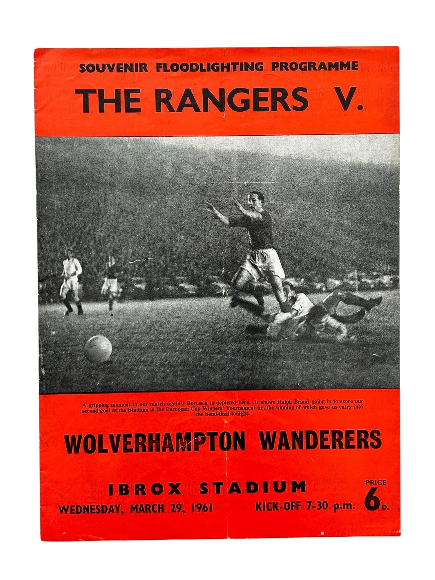 GLASGOW RANGERS VERSUS WOLVERHAMPTON WANDERERS 1961 EUROPEAN CUP WINNERS CUP SEMI FINAL FOOTBALL PROGRAMME, 29/3/1961. CREASING NOTED, GENERALLY GOOD.