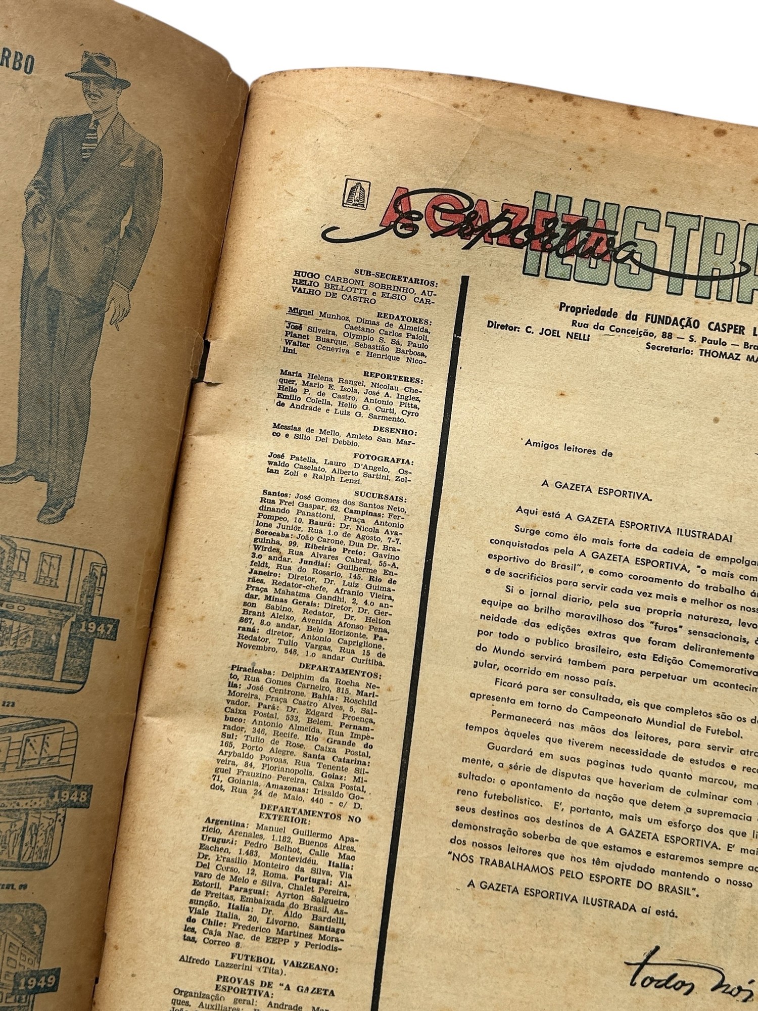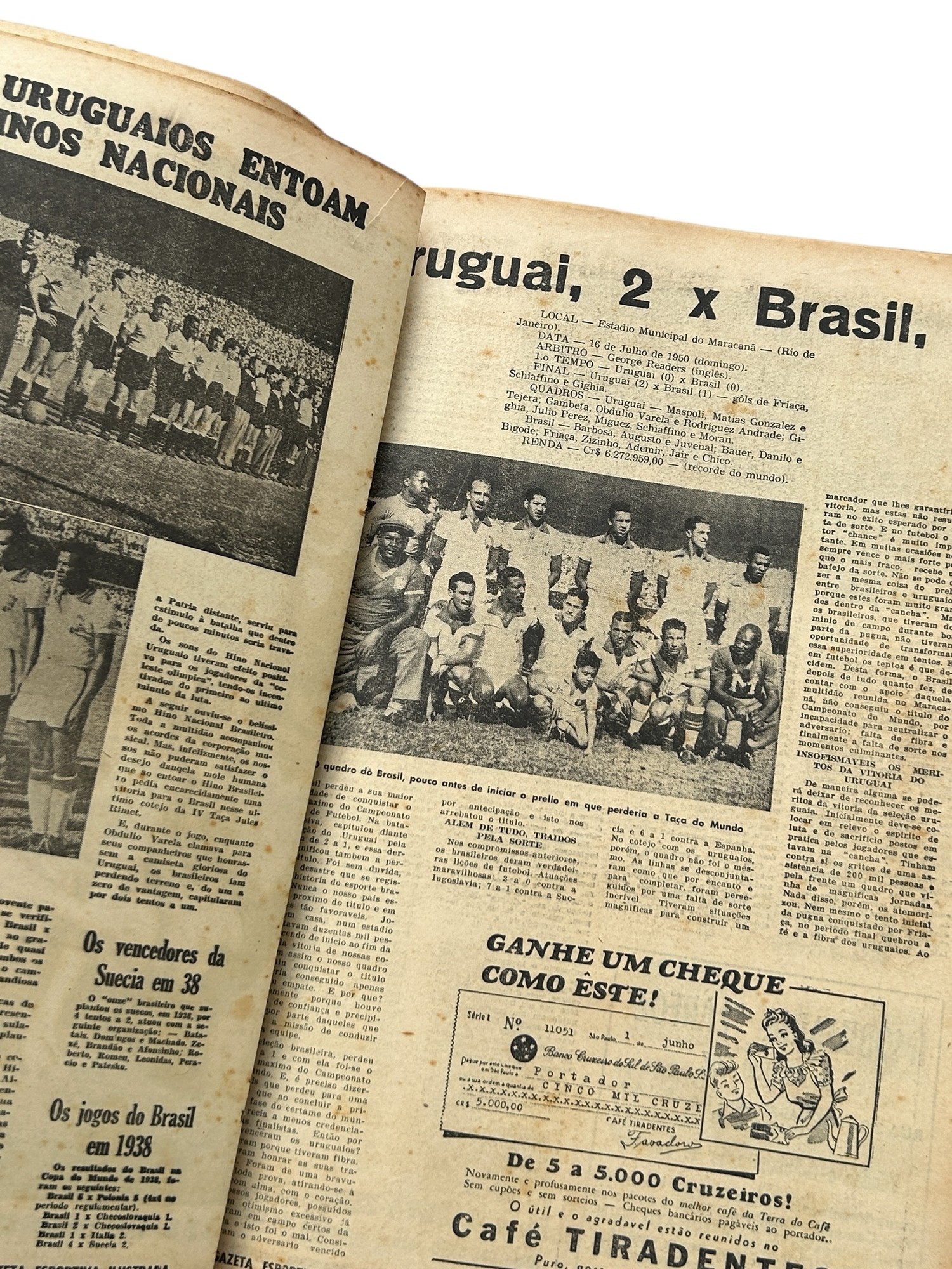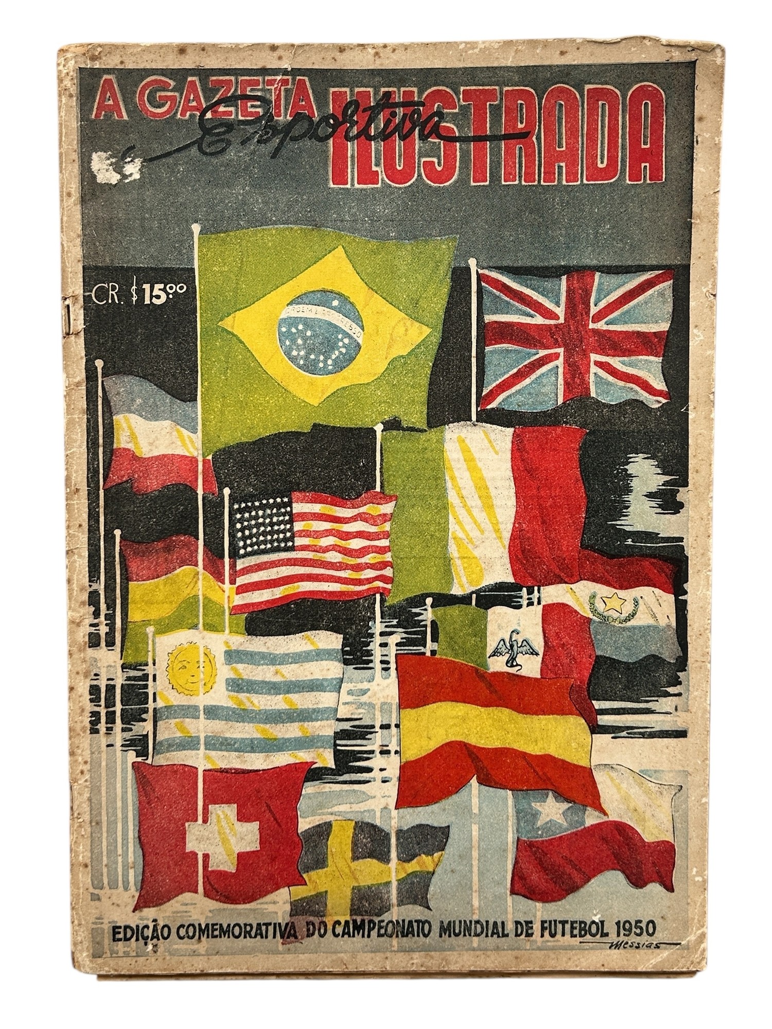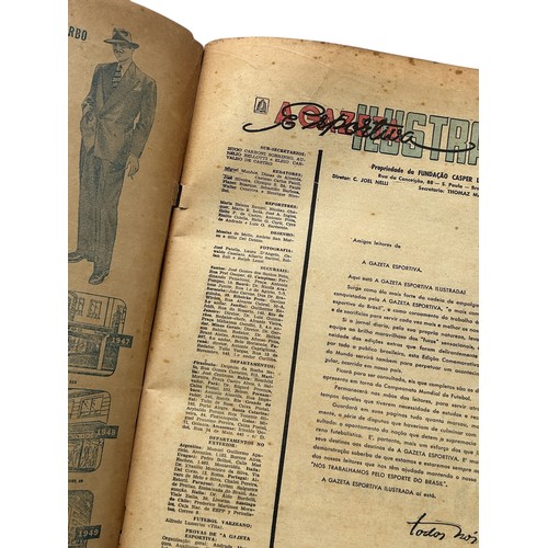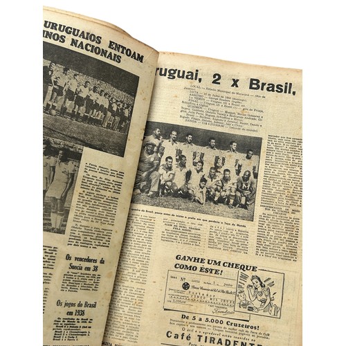 1950 BRAZIL WORLD CUP REPORT, 196-PAGE REPORT PUBLISHED IN BRAZIL BY ''A GAZETA ILUSTRADA'' IN JULY 1950 A FEW DAYS AFTER THE TOURNAMENT ENDED. THIS IS A COMMEMORATIVE EDITION, TITLED: ''EDICAO COMMEMORATIVA DO CAMPEONATO MUNDIAL DE FUTBOL 1950'' PUBLISHED IN PORTUGUESE, INCLUDES FULL COLOUR COVERS AND AN EXTENSIVE REPORT OF THE FIFA WORLD CUP INCLUDING FULL MATCH REPORTS FOR ALL 22 MATCHES PLAYED (INCLUDING MANY PICTURES AND FULL TEAM LINE-UPS FOR EACH GAME) WITH EXTENSIVE FINAL ROUND COVERAGE PLUS HISTORY OF THE PREVIOUS PRE-WAR WORLD CUP TOURNAMENTS AND A LARGE CENTRAL PAGE TEAM-GROUP POSTER OF THE TRIUMPHANT URUGUAY TEAM.