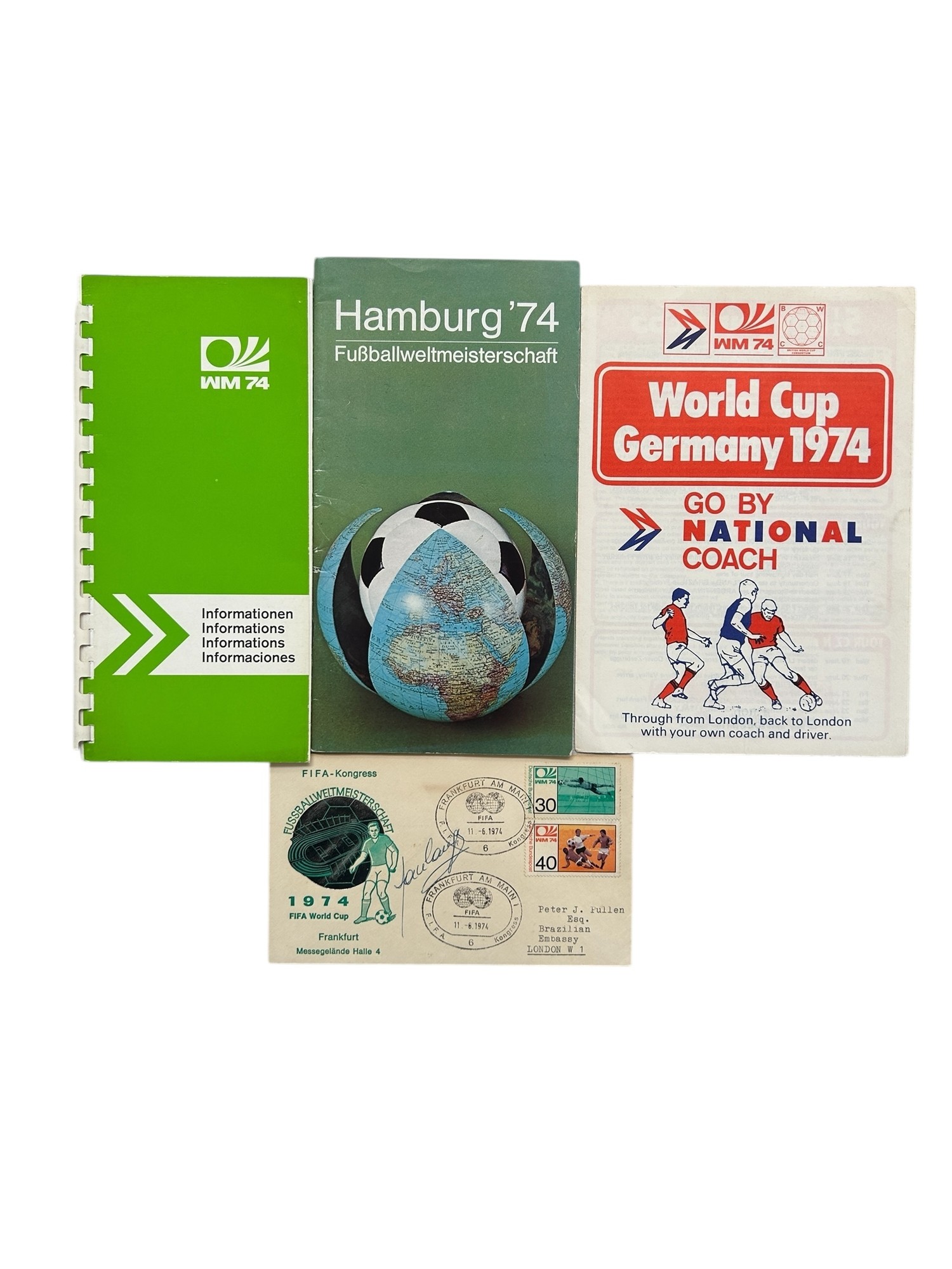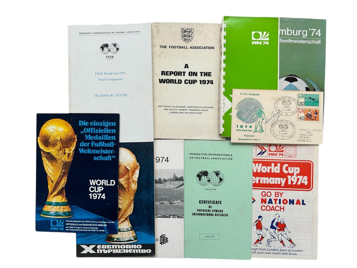 COLLECTION OF WORLD CUP WEST GERMANY 1974 EPHEMERA, 1974 DFB BOOKLET/ ITINERARY, SIGNED TOURNAMENT FIRST DAY COVER, NATIONAL COACH WM 74 BOOKLET, WM 74 GREEN INFORMATION BOOKLET, HAMBURG 74 FUSBALLWELTMEISTERSCHAFT BOOKLET, ENGLISH FA 'REPORT ON THE WORLD CUP 1974', ENGLISH EDITION TECHNICAL STUDY, ENGLISH EDITION CERTIFICATE OF PHYSICAL FITNESS INTERNATIONAL REFEREES, WM 74 BULGARIAN EDITION ITINERARY/ BROCHURE.
