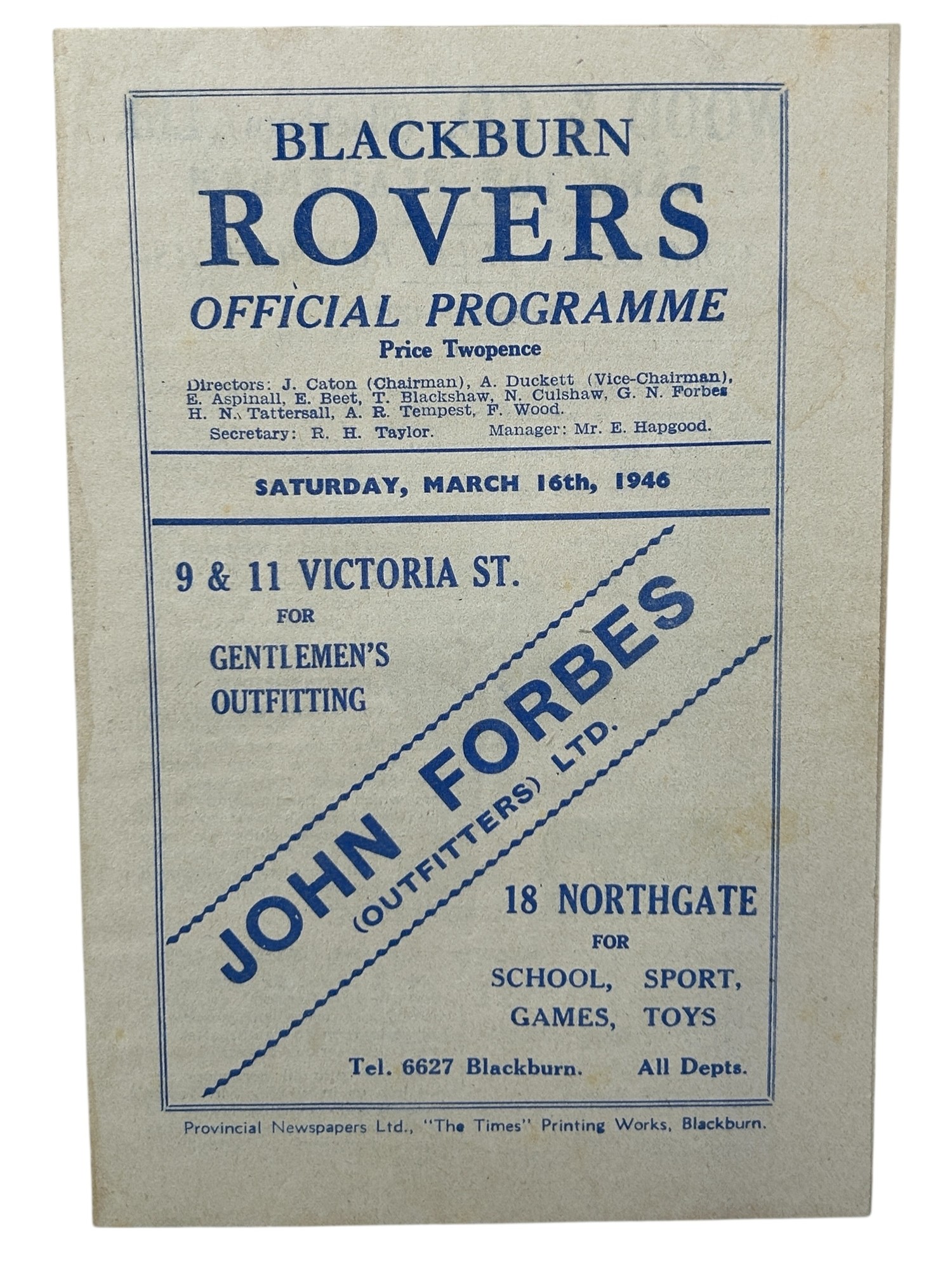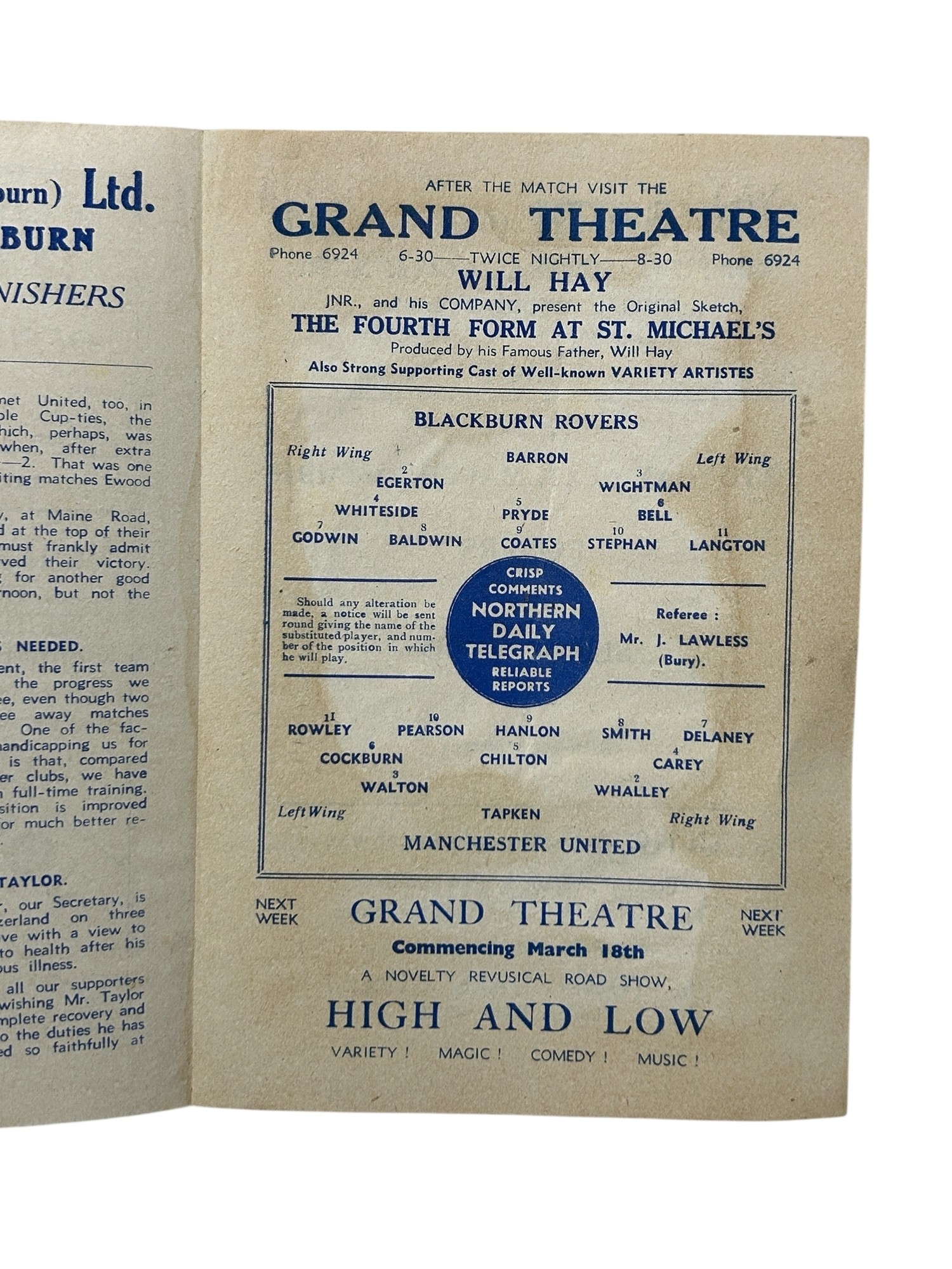 MANCHESTER UNITED AWAY VERSUS BLACKBURN ROVERS 1945/46 FOOTBALL PROGRAMME, 16/03/1946, 4-PAGE ISSUE. MINOR STAINING, GENERALLY SUPERB.