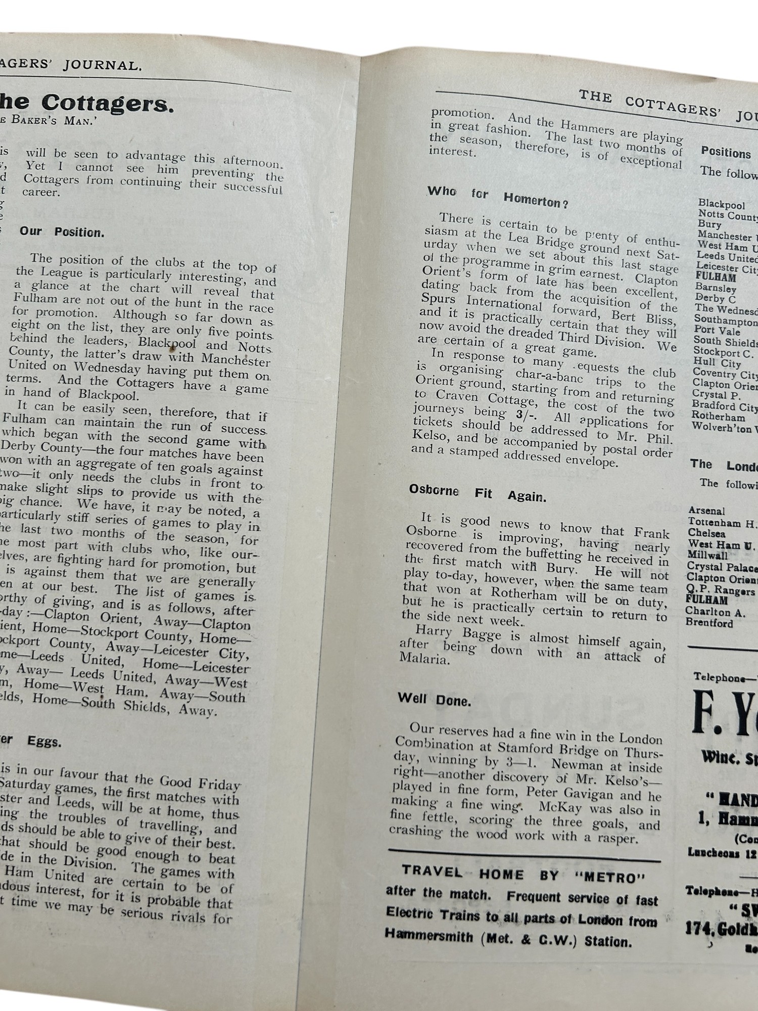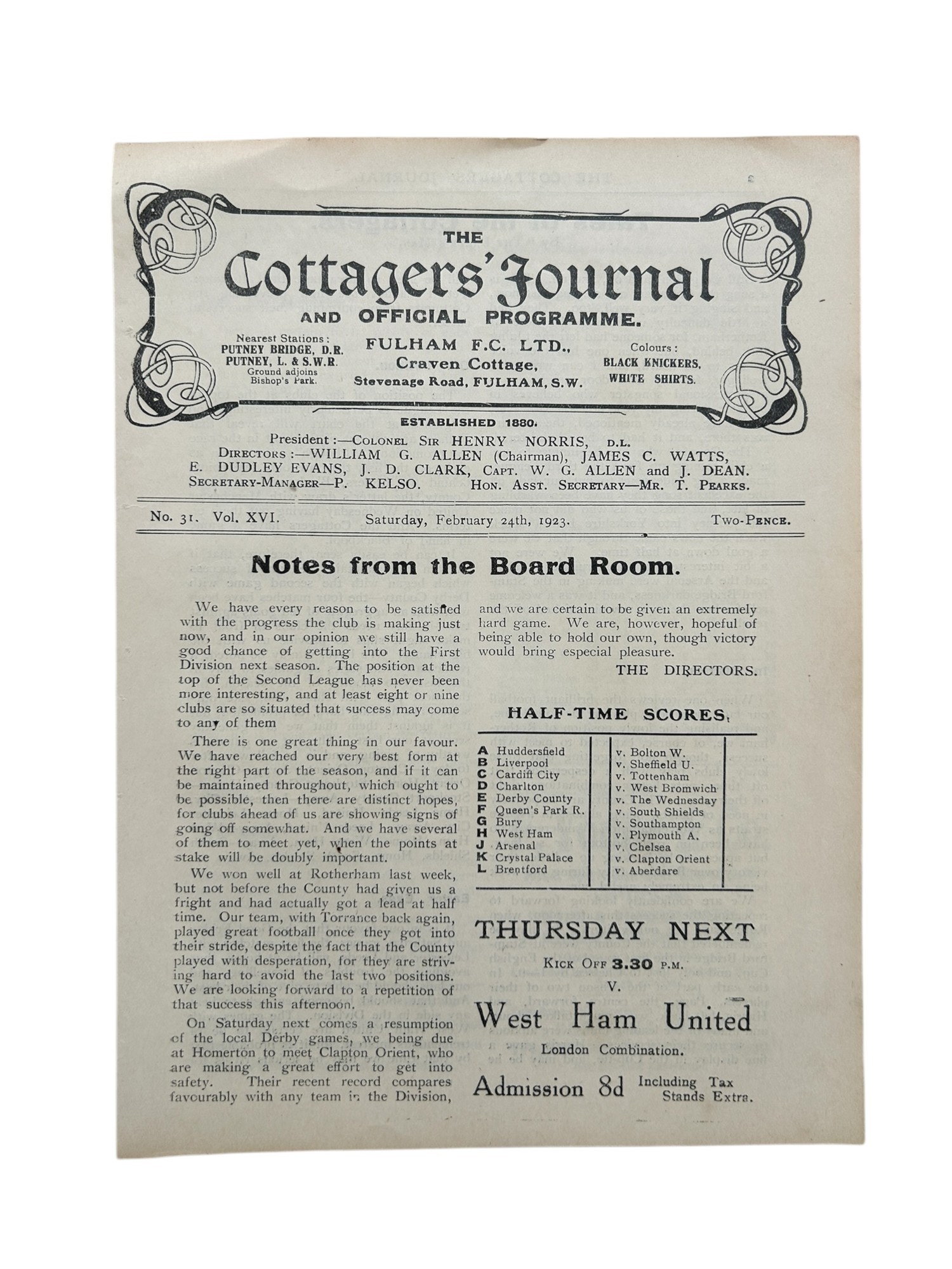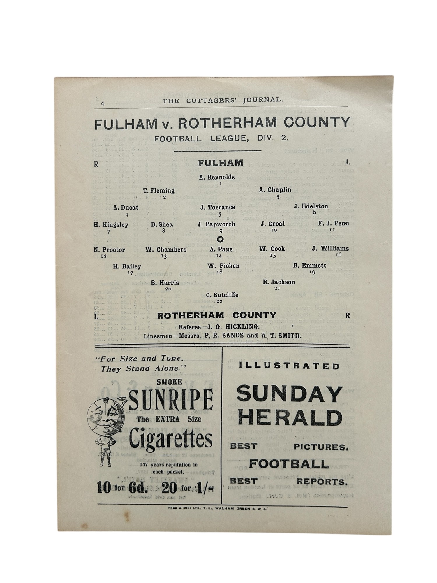 FULHAM VERSUS ROTHERHAM COUNTY 1922/23 FOOTBALL PROGRAMME, 24/2/1923, DIVISION 2. PROFESSIONALLY REPAIRED SPINE, MINOR FOXING.
