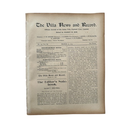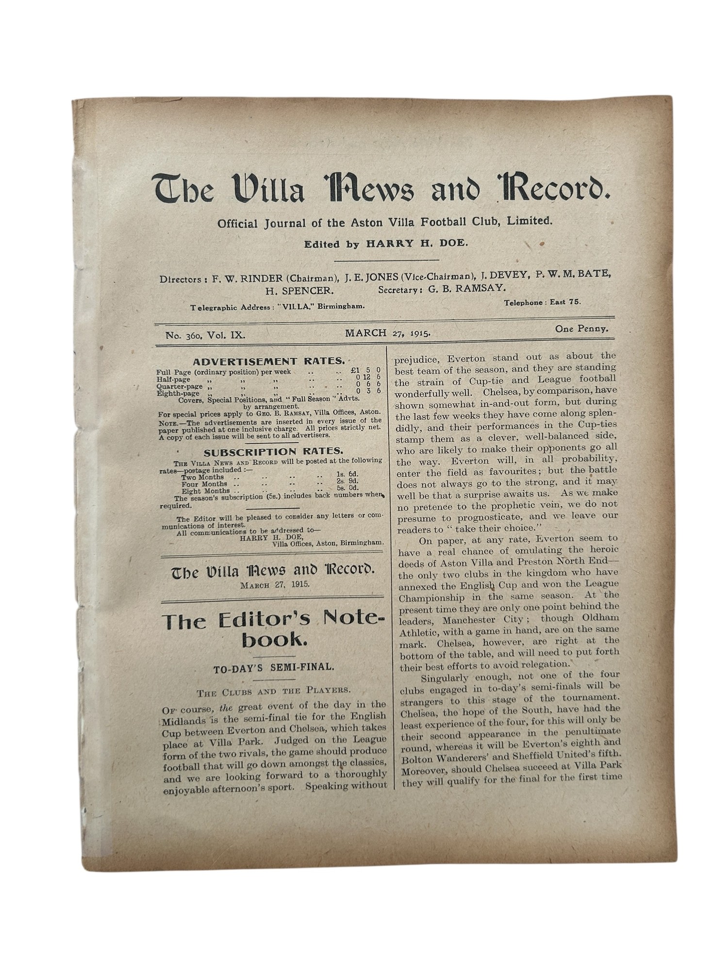 1914/15 FA CUP SEMI FINAL FOOTBALL PROGRAMME, CHELSEA VERSUS EVERTON, PLAYED AT VILLA PARK, 27/3/1915. EX BINDER, MISSING COVER, MOST RECENTLY SOLD FOR £5000 WITH COVERS. REPAIRED SPINE.
