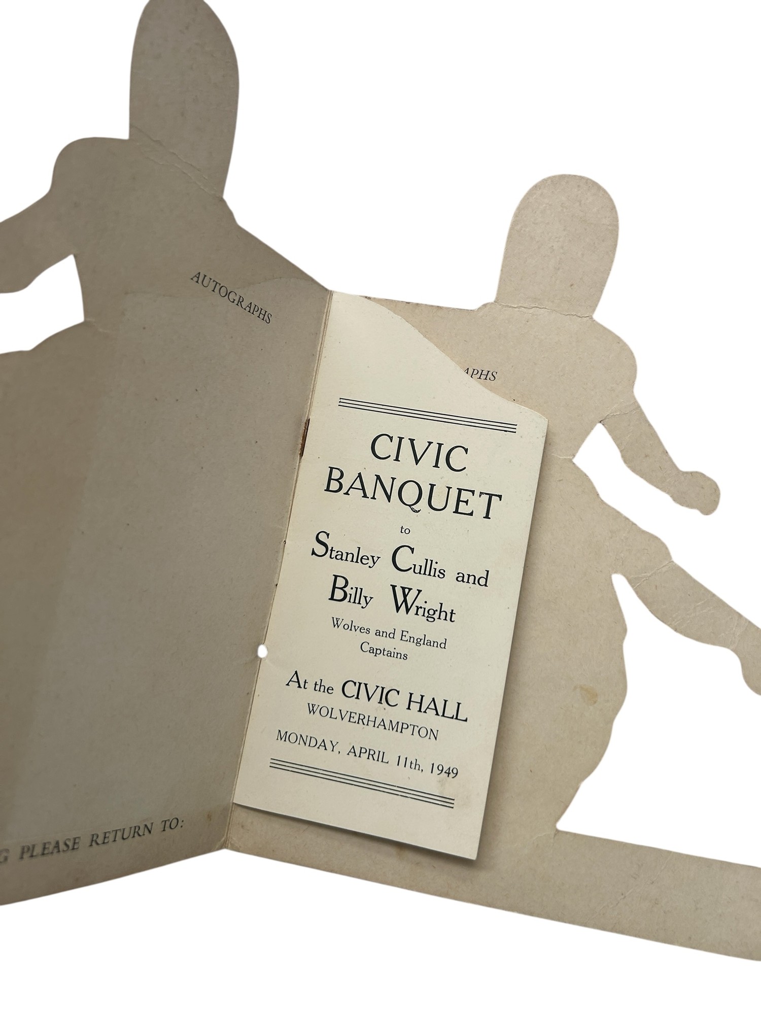 BILLY WRIGHT & STANLEY CULLIS 1949 CIVIC BANQUET MENU, 11/4/1949, WOLVERHAMPTON WANDERERS & ENGLAND CAPTAINS, SUPERB ITEM.