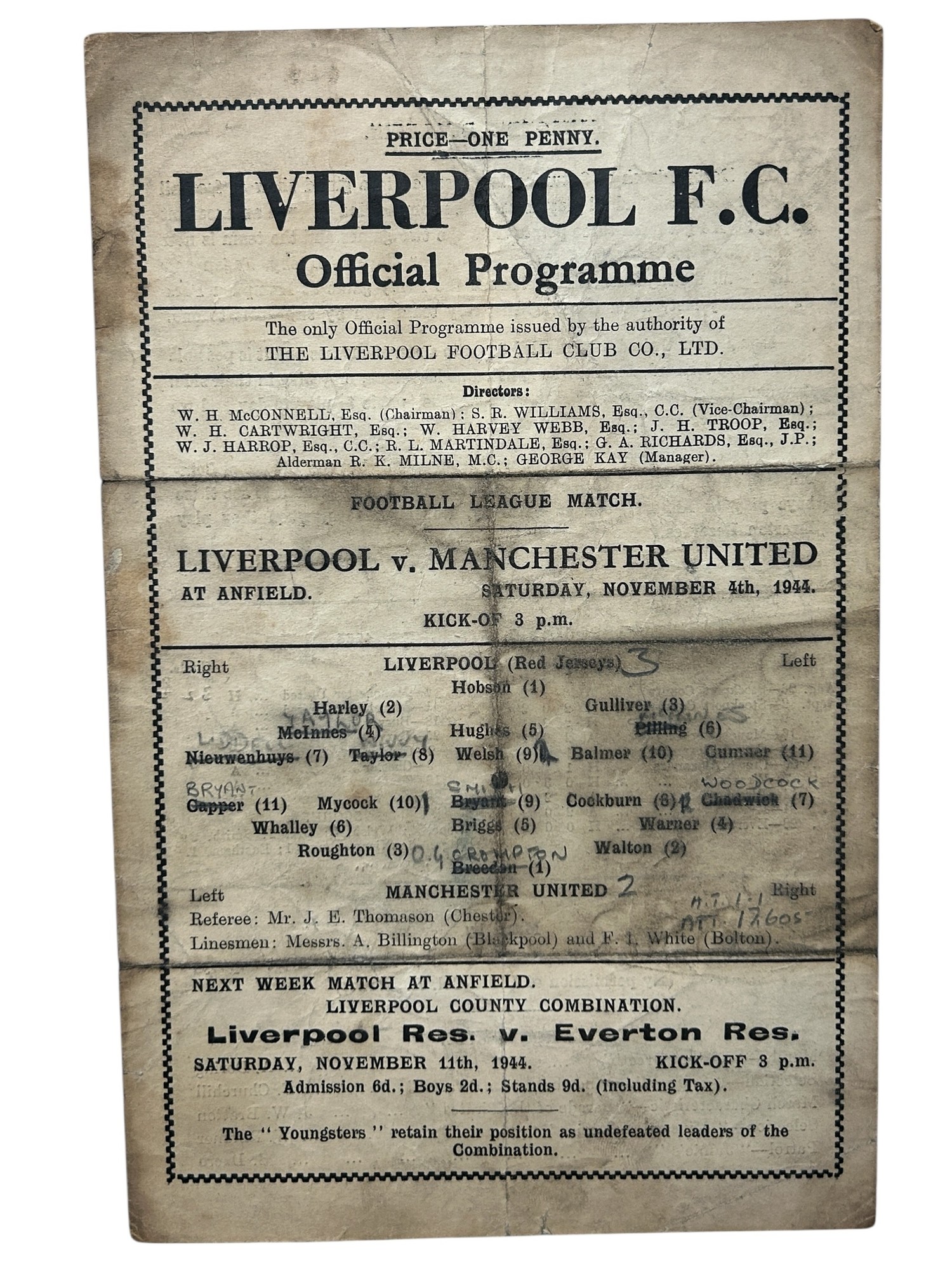 MANCHESTER UNITED AWAY VERSUS LIVERPOOL 1944/45 FOOTBALL PROGRAMME, 04/11/1944, SINGLE SHEET. SHOWING WEAR, MARKS, CREASING.