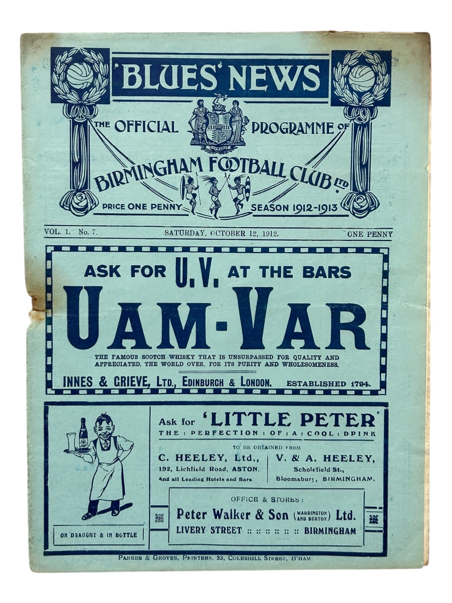 BIRMINGHAM CITY VERSUS BURNLEY 1912/13 FOOTBALL PROGRAMME, 12/10/1912. RUSTY STAPLES REMOVED LEAVING WEAR.