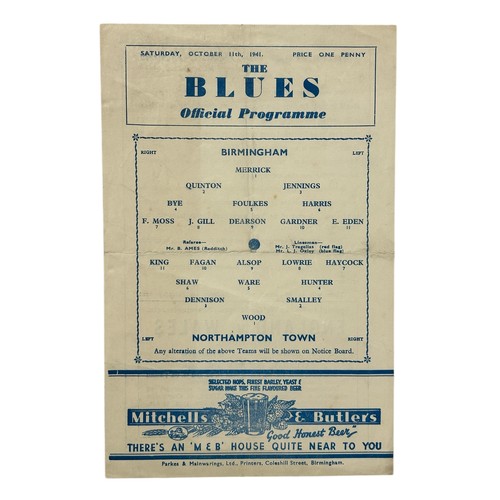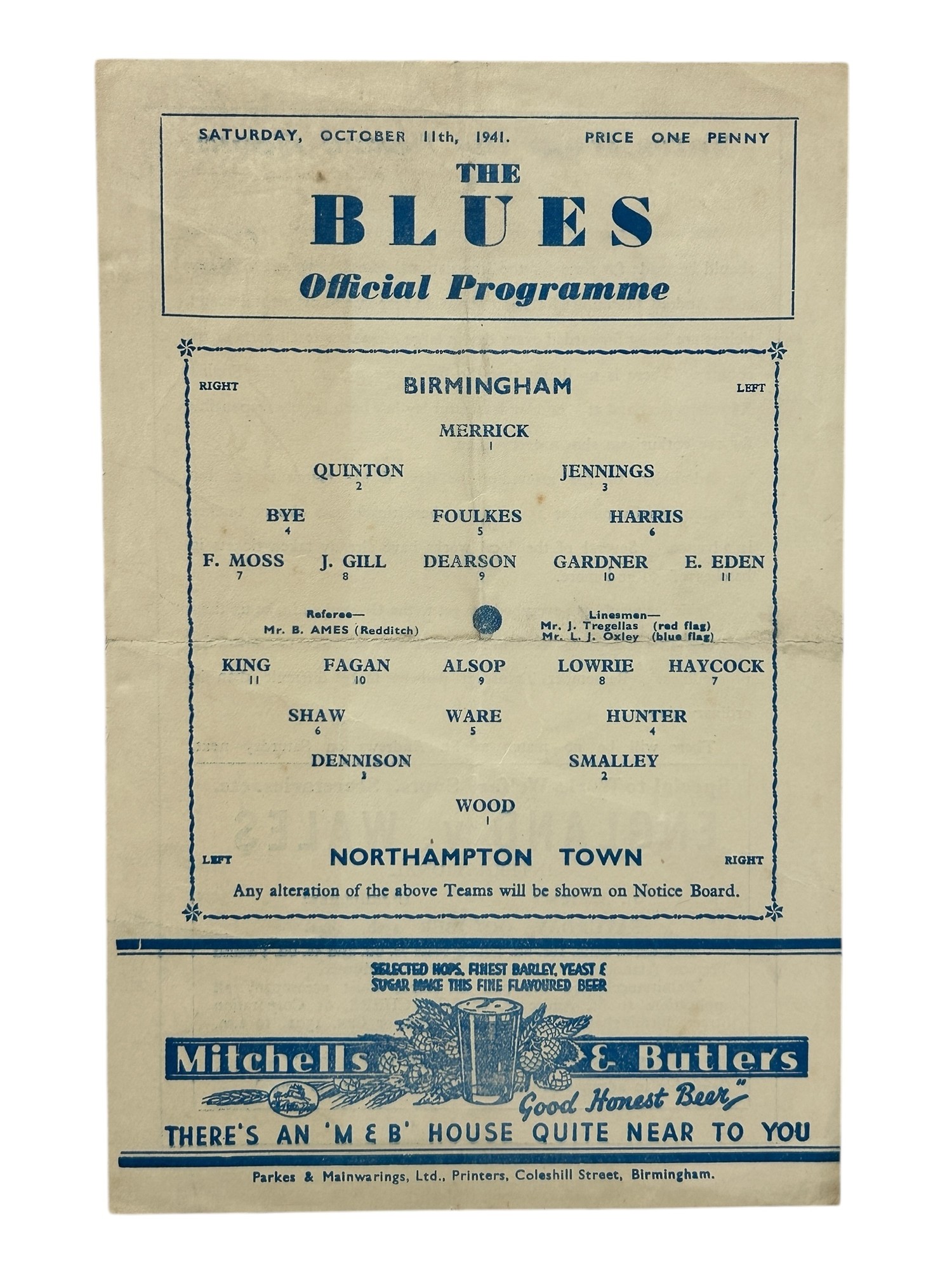 BIRMINGHAM CITY VERSUS NORTHAMPTON TOWN 1941/42 FOOTBALL PROGRAMME, 11/10/1941, WAR-TIME SINGLE SHEET ISSUE. CREASES.