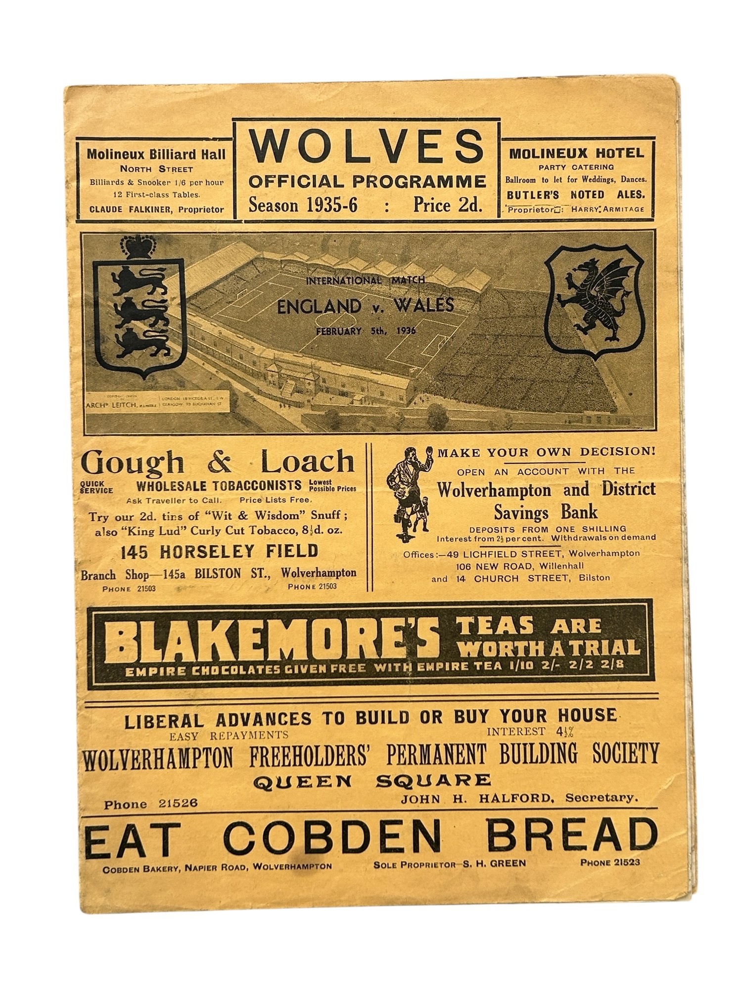 1936 ENGLAND VERSUS WALES AT WOLVERHAMPTON WANDERERS FOOTBALL PROGRAMME, 5/2/1936, INTERNATIONAL MATCH. CREASING NOTED, EDGE WEAR.