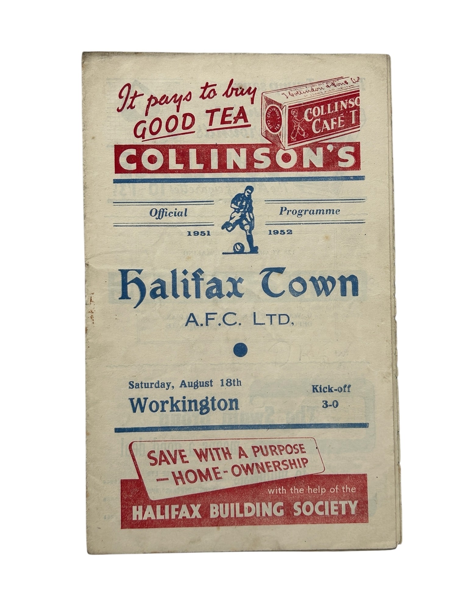 HALIFAX VERSUS WORKINGTON 1951/52 FOOTBALL PROGRAMME, WORKINGTON'S FIRST GAME IN THE FOOTBALL LEAGUE, 18/8/1951. CREASING NOTED, GENERALLY GOOD.