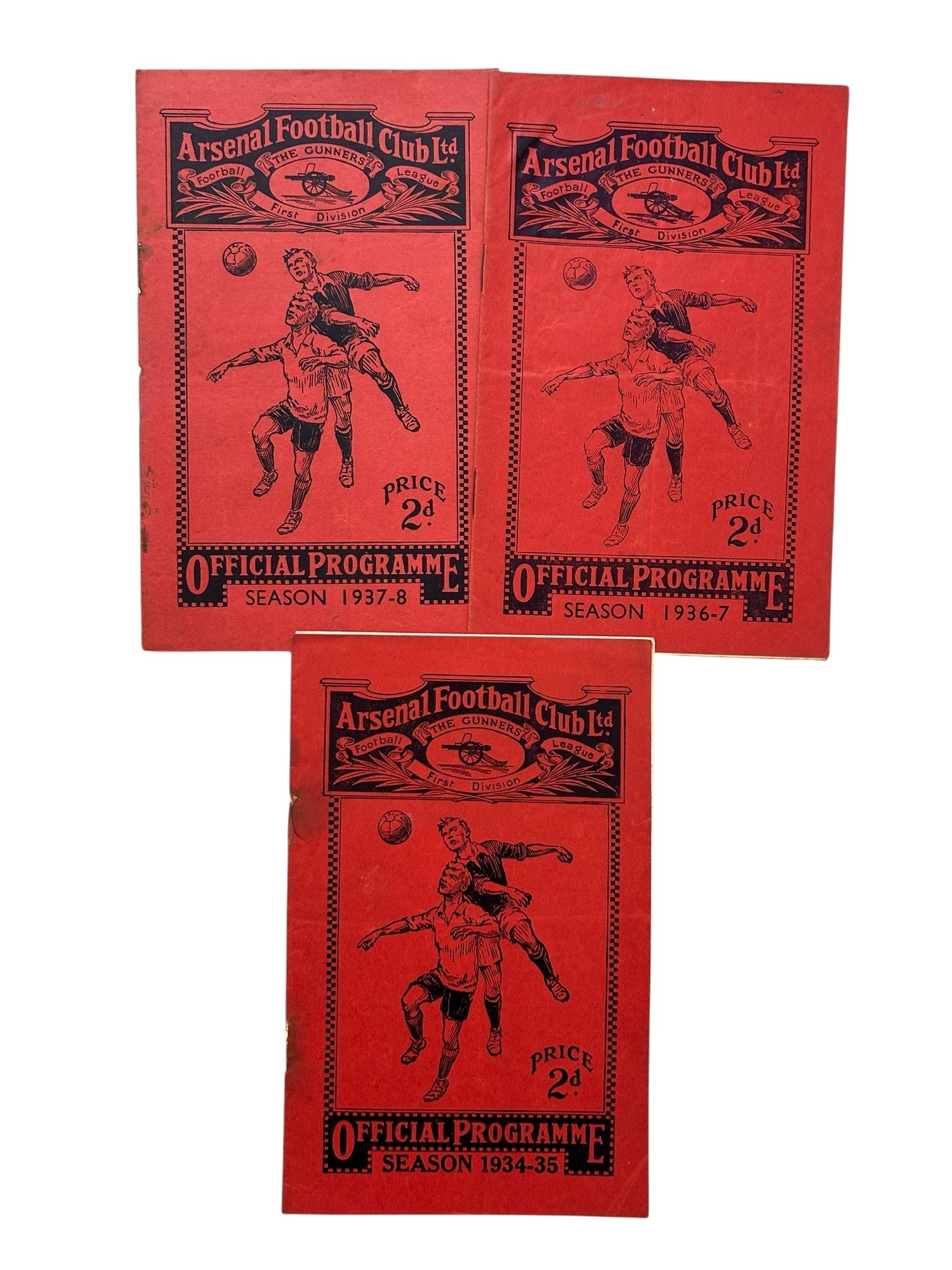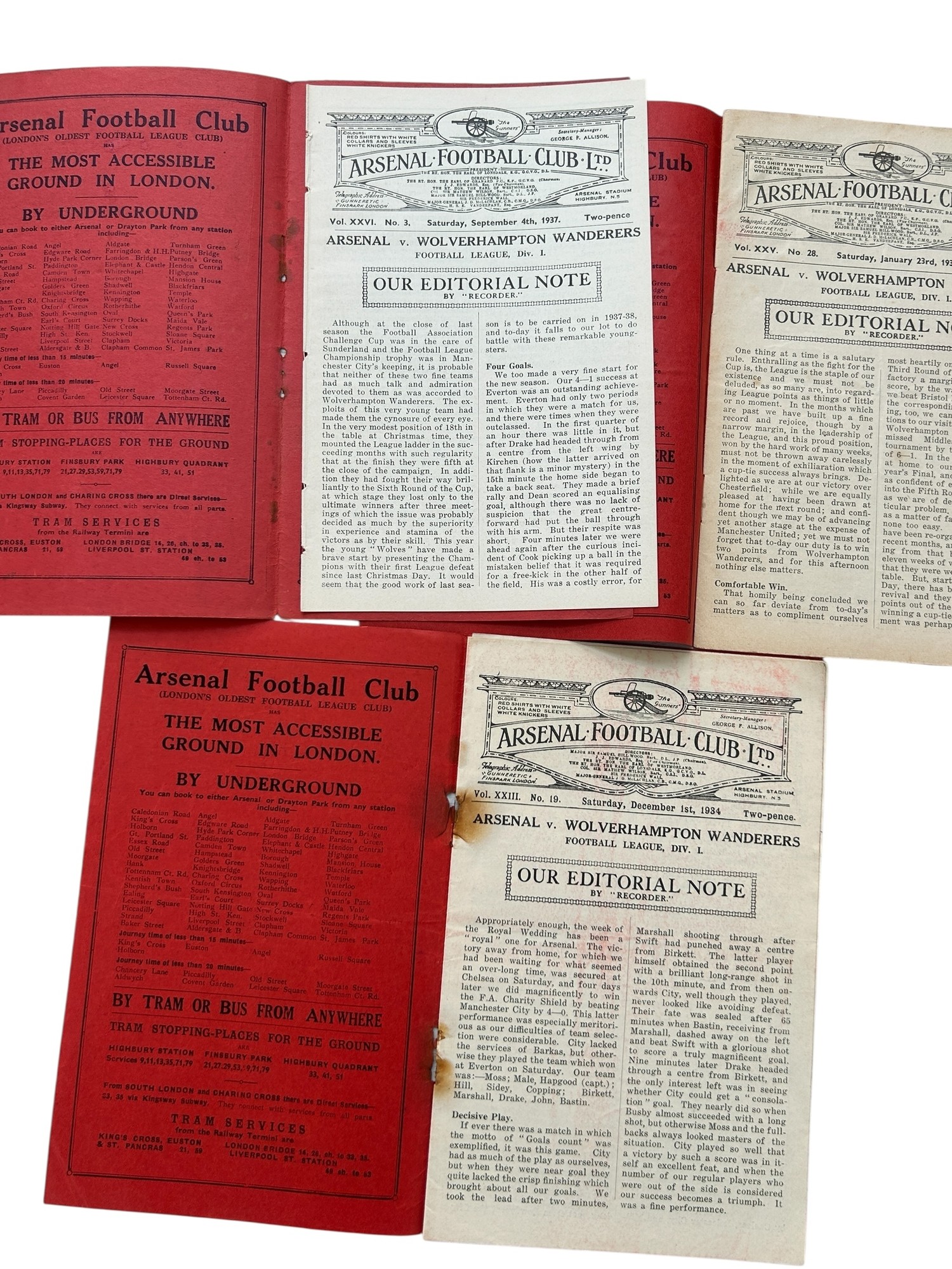 X3 ARSENAL VERSUS WOLVERHAMPTON WANDERERS PRE-WAR FOOTBALL PROGRAMMES, 1/12/1934 (COLOUR BLEED/ RUSTY STAPLES REMOVED), 23/1/1937 (CREASING), 4/9/1937 (EX BINDER/ WEAR TO SPINE AREA).