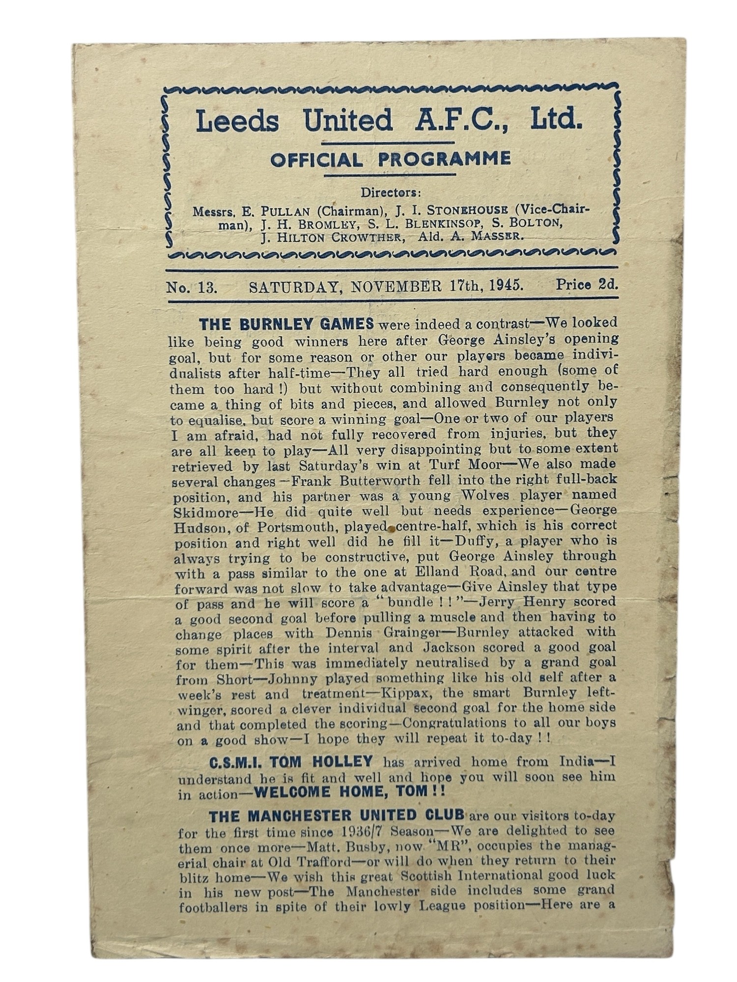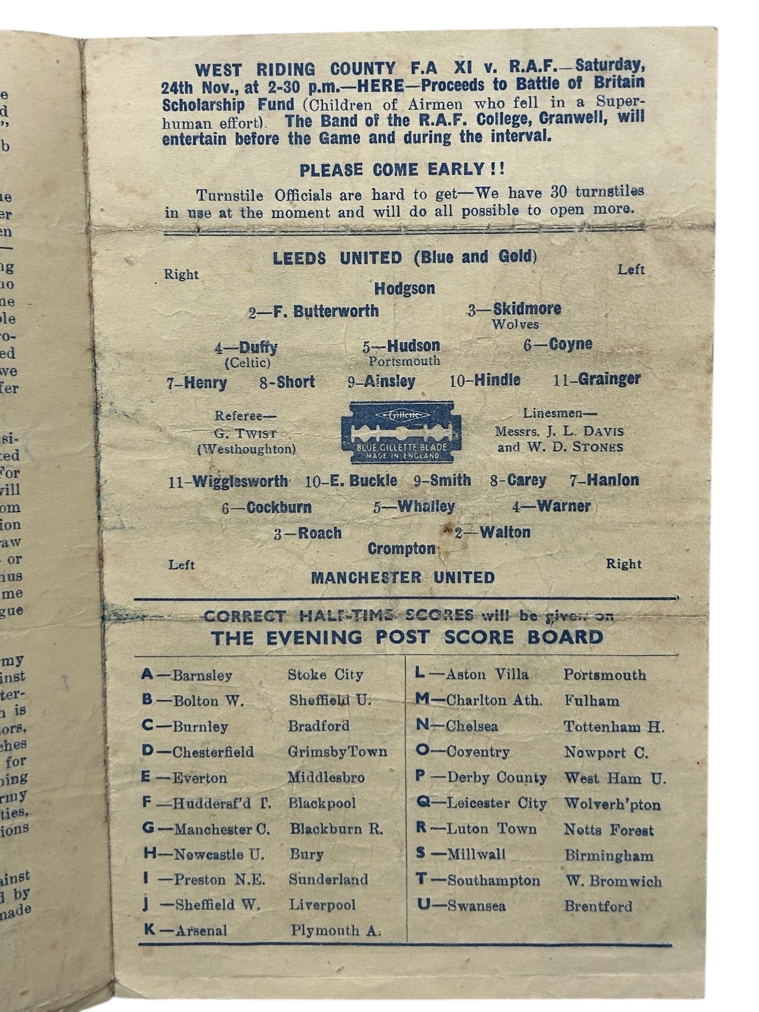 MANCHESTER UNITED AWAY VERSUS LEEDS UNITED 1945/46 FOOTBALL PROGRAMME, 17/11/1945, 4-PAGE ISSUE. MINOR MARKS.