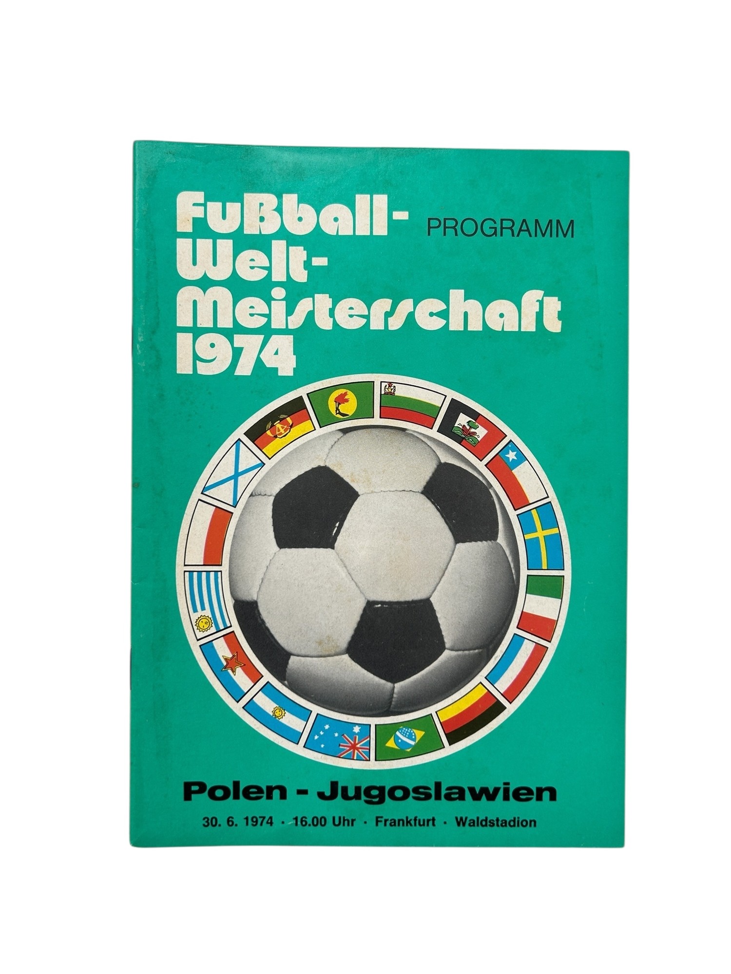 1974 WEST GERMANY WORLD CUP FOOTBALL PROGRAMME, POLAND VERSUS YUGOSLAVIA, 30/6/1974. FOXING NOTED, GENERALLY GOOD.