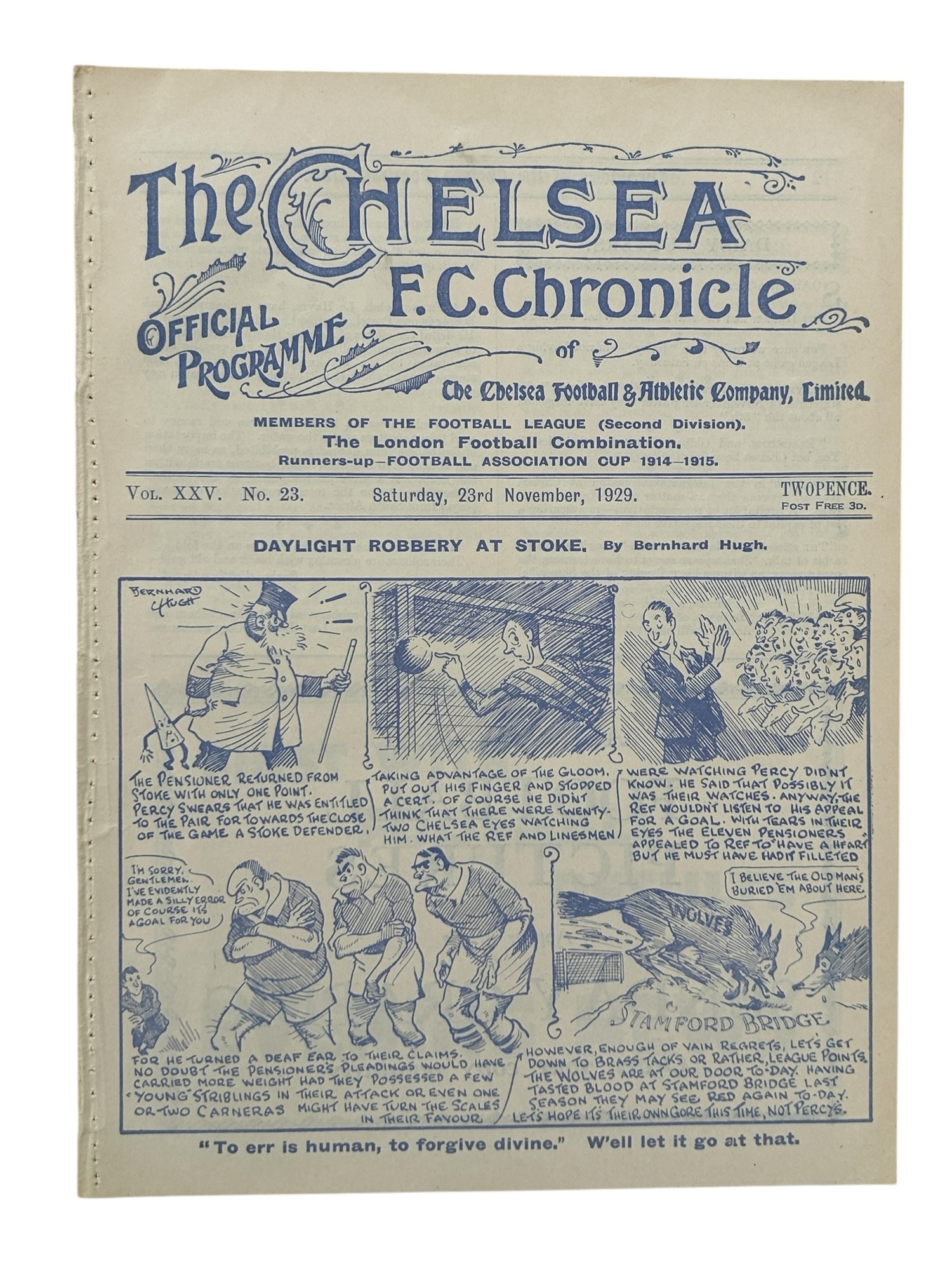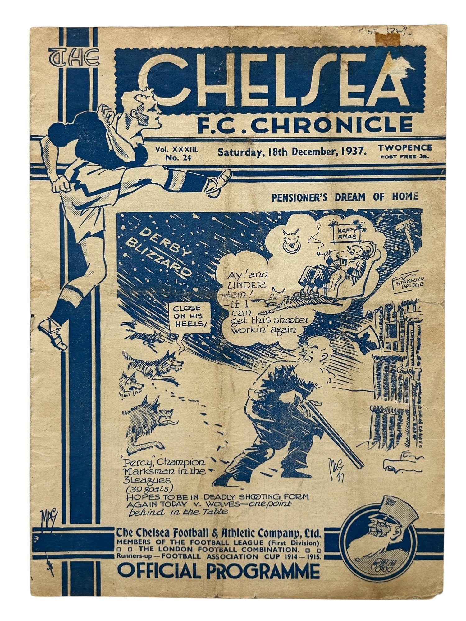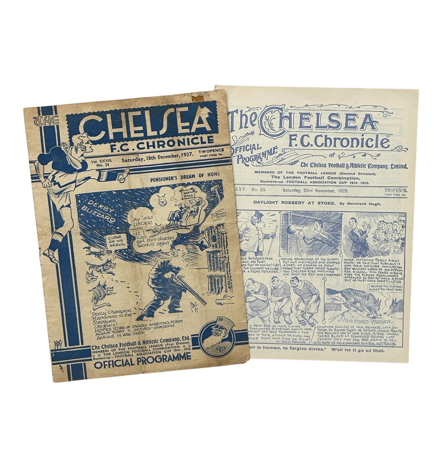 X2 CHELSEA VERSUS WOLVERHAMPTON WANDERERS PRE-WAR FOOTBALL PROGRAMMES, 23/11/1929 (EX BINDER), 18/12/1937 (HANDLING MARKS/ EDGE WEAR/ CREASING).
