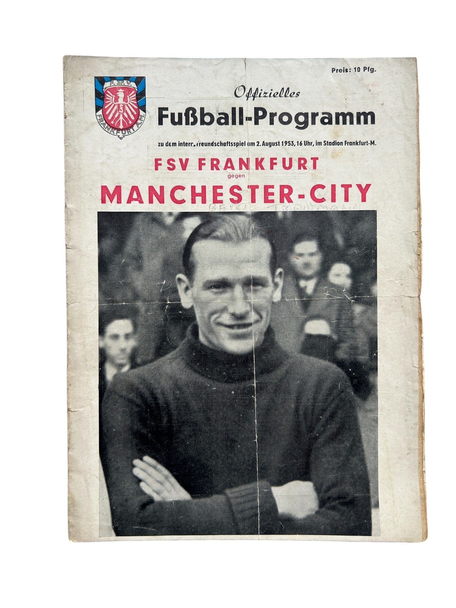 MANCHESTER CITY AWAY VERSUS FSV FRANKFURT 1953/54 FOOTBALL PROGRAMME, 2/8/1953, FRIENDLY ISSUE. HEAVY FOLDS, EDGE WEAR, DAMAGE TO REAR.
