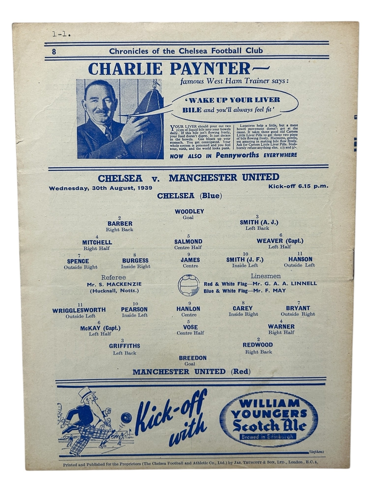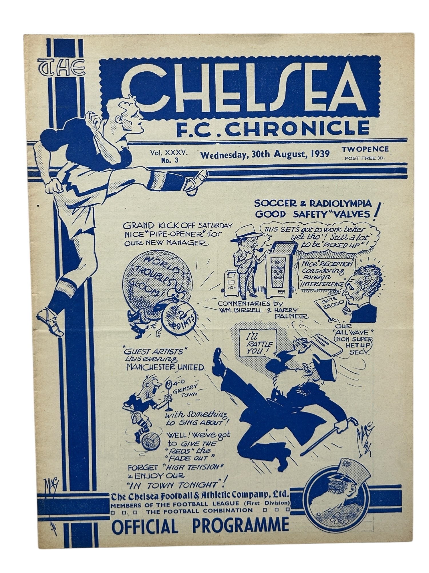 MANCHESTER UNITED AWAY VERSUS CHELSEA 1939/40 FOOTBALL PROGRAMME, 30/08/1939, SCARCE TRUNCATED SEASON. MINOR CREASING.