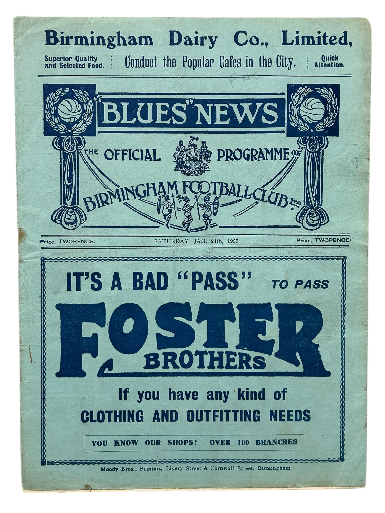BIRMINGHAM CITY VERSUS PRESTON NORTH END 1924/25 FOOTBALL PROGRAMME, 24/1/1925. RUSTY STAPLE REMOVED.