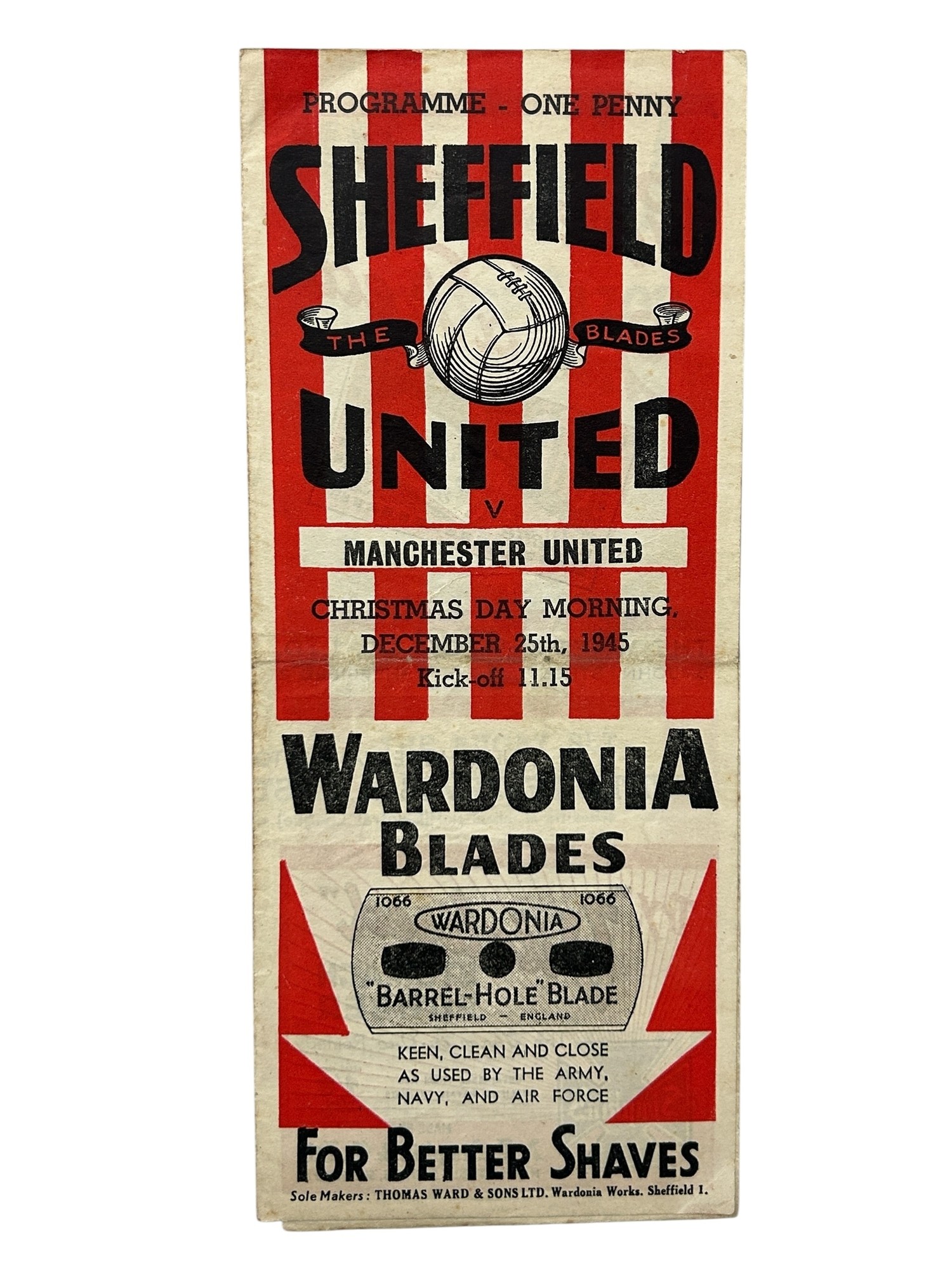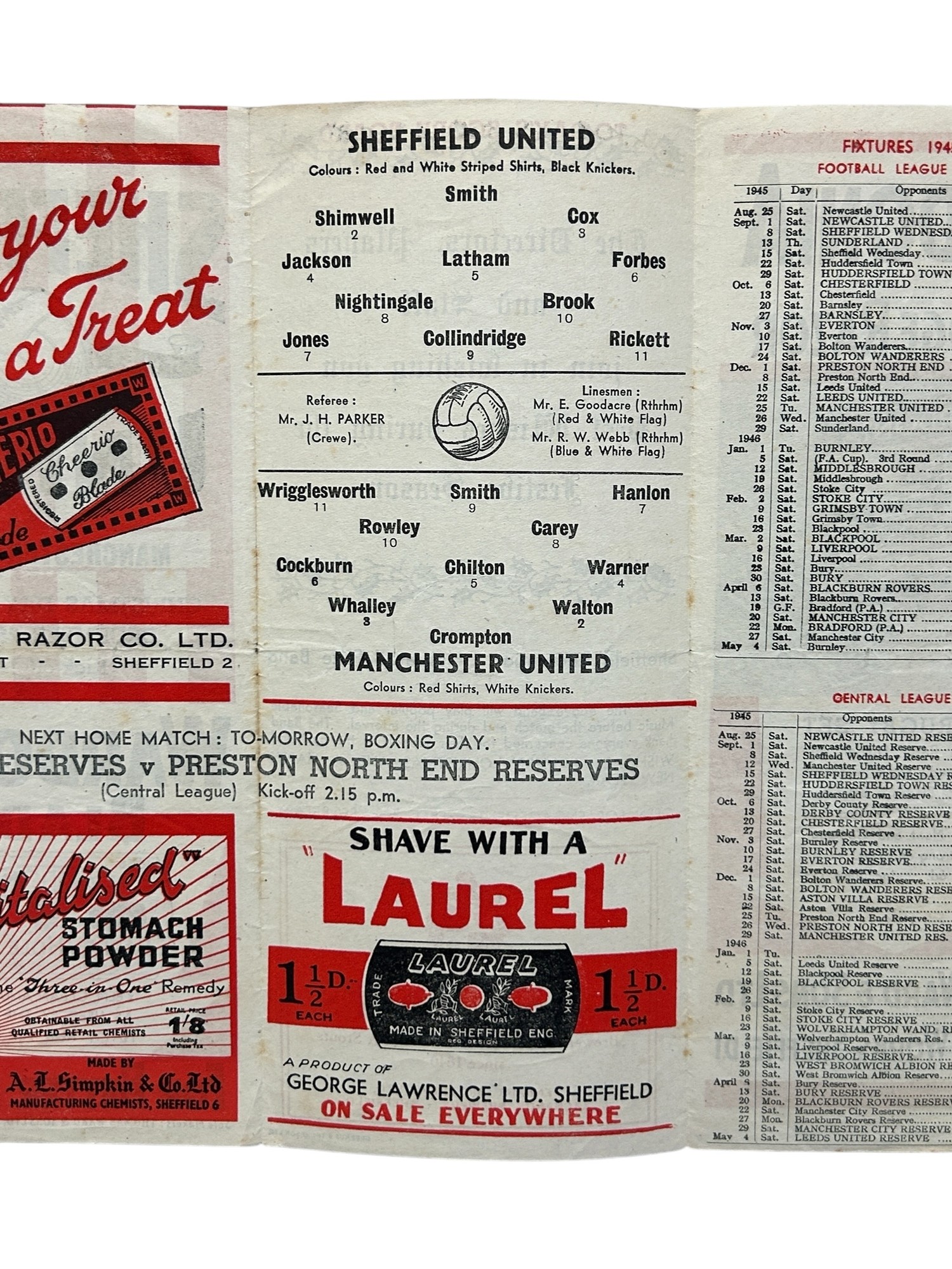 MANCHESTER UNITED AWAY VERSUS SHEFFIELD UNITED 1945/46 FOOTBALL PROGRAMME, 25/12/1945, GATEFOLD ISSUE. MINOR CREASING.