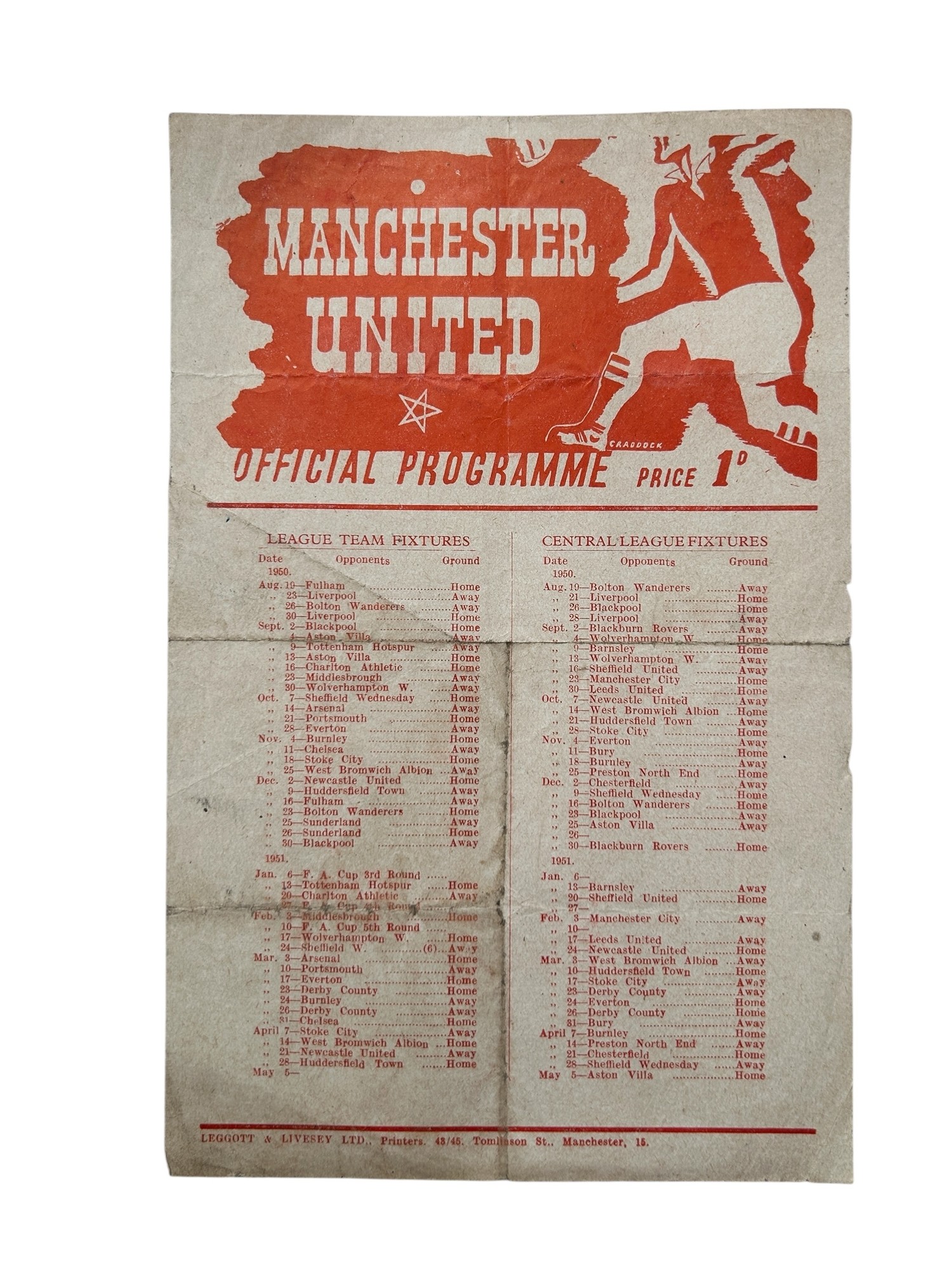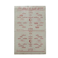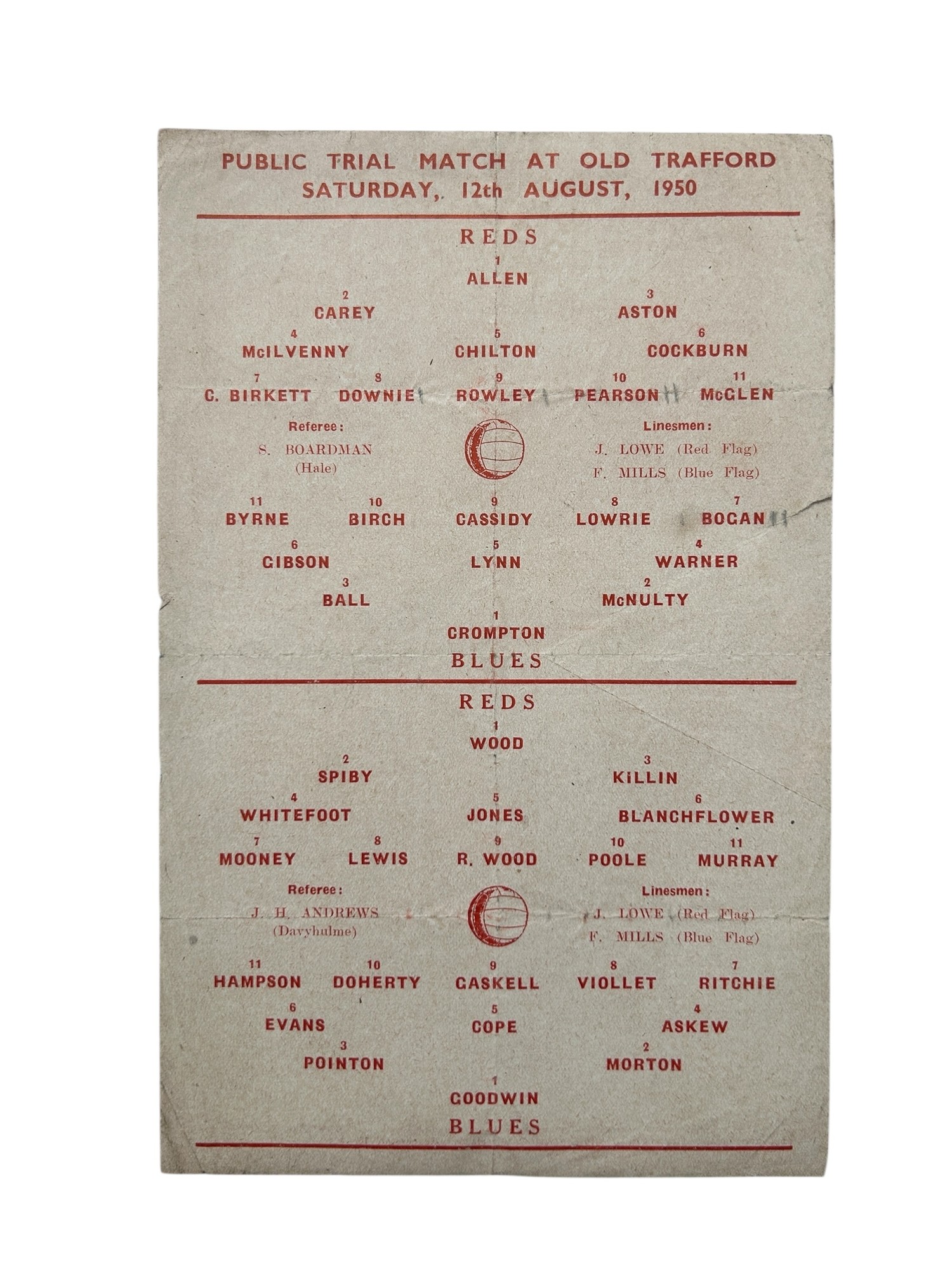 MANCHESTER UNITED 1950 REDS VERSUS BLUES PUBLIC TRIAL MATCH FOOTBALL PROGRAMME, 12/8/1950, SINGLE SHEET. PENCIL SCORES, FOLDS.