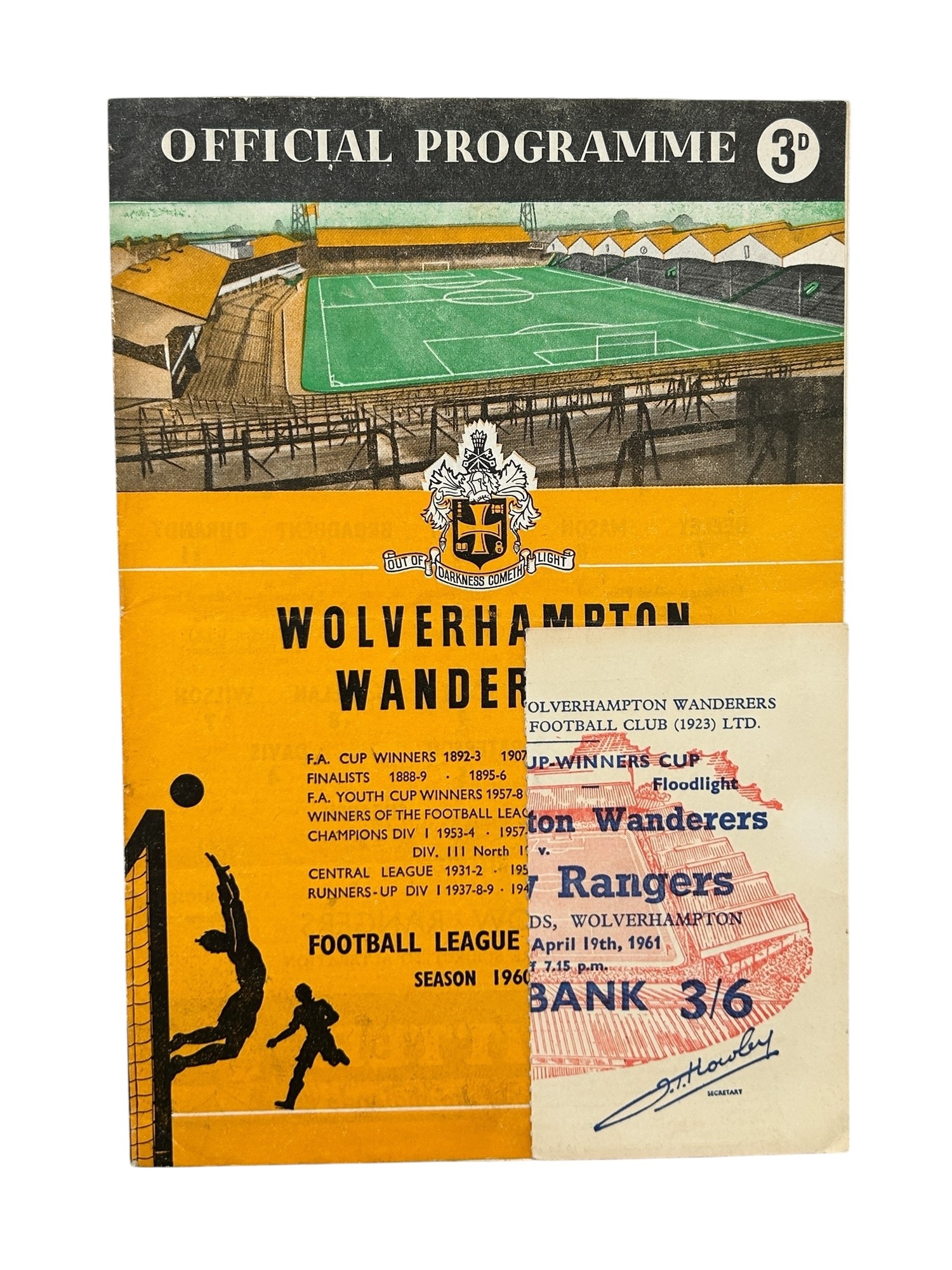WOLVERHAMPTON WANDERERS VERSUS GLASGOW RANGERS 1961 EUROPEAN CUP WINNERS CUP SEMI FINAL FOOTBALL PROGRAMME AND TICKET STUB, SECOND LEG, 19/4/1961. GENERALLY GOOD.